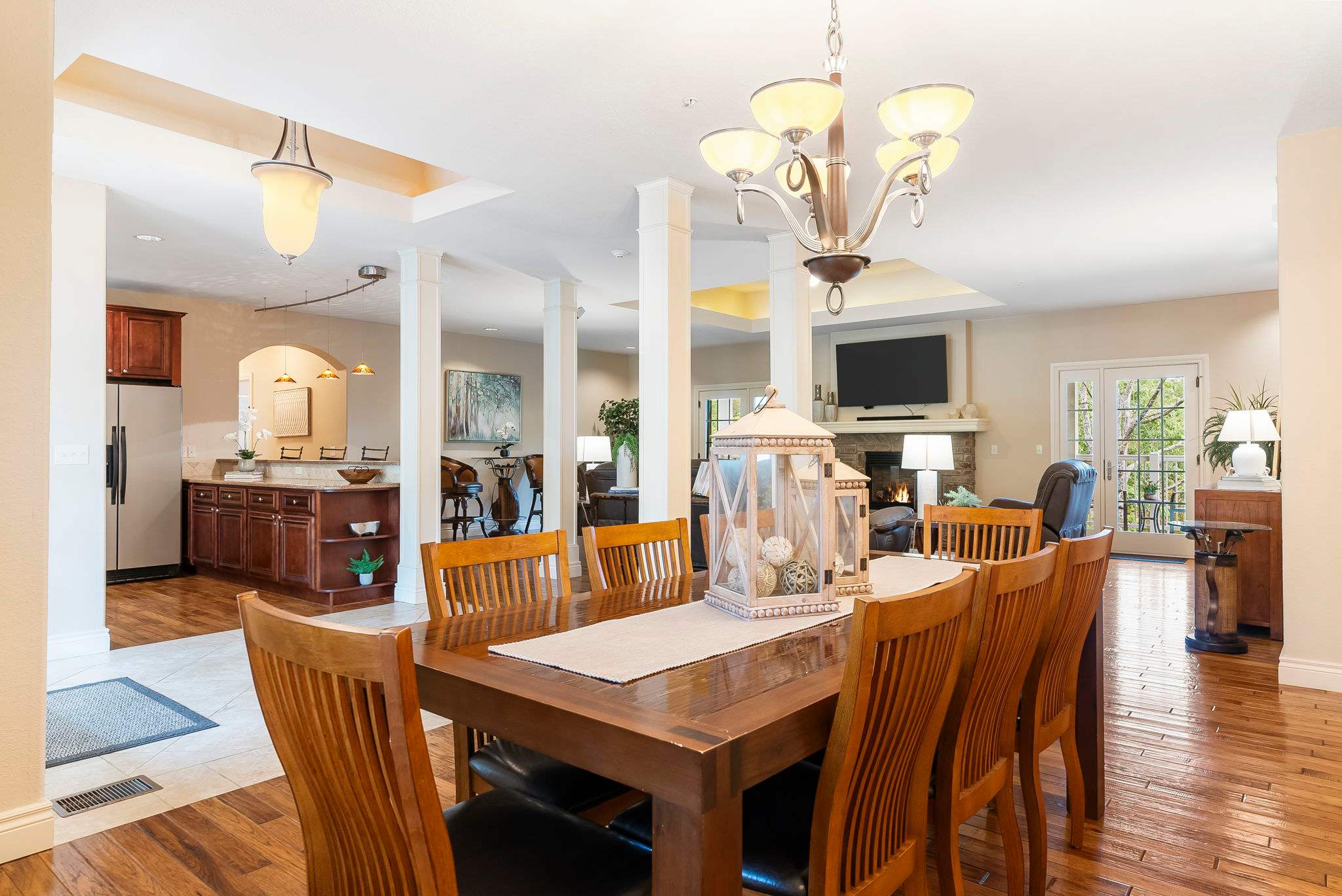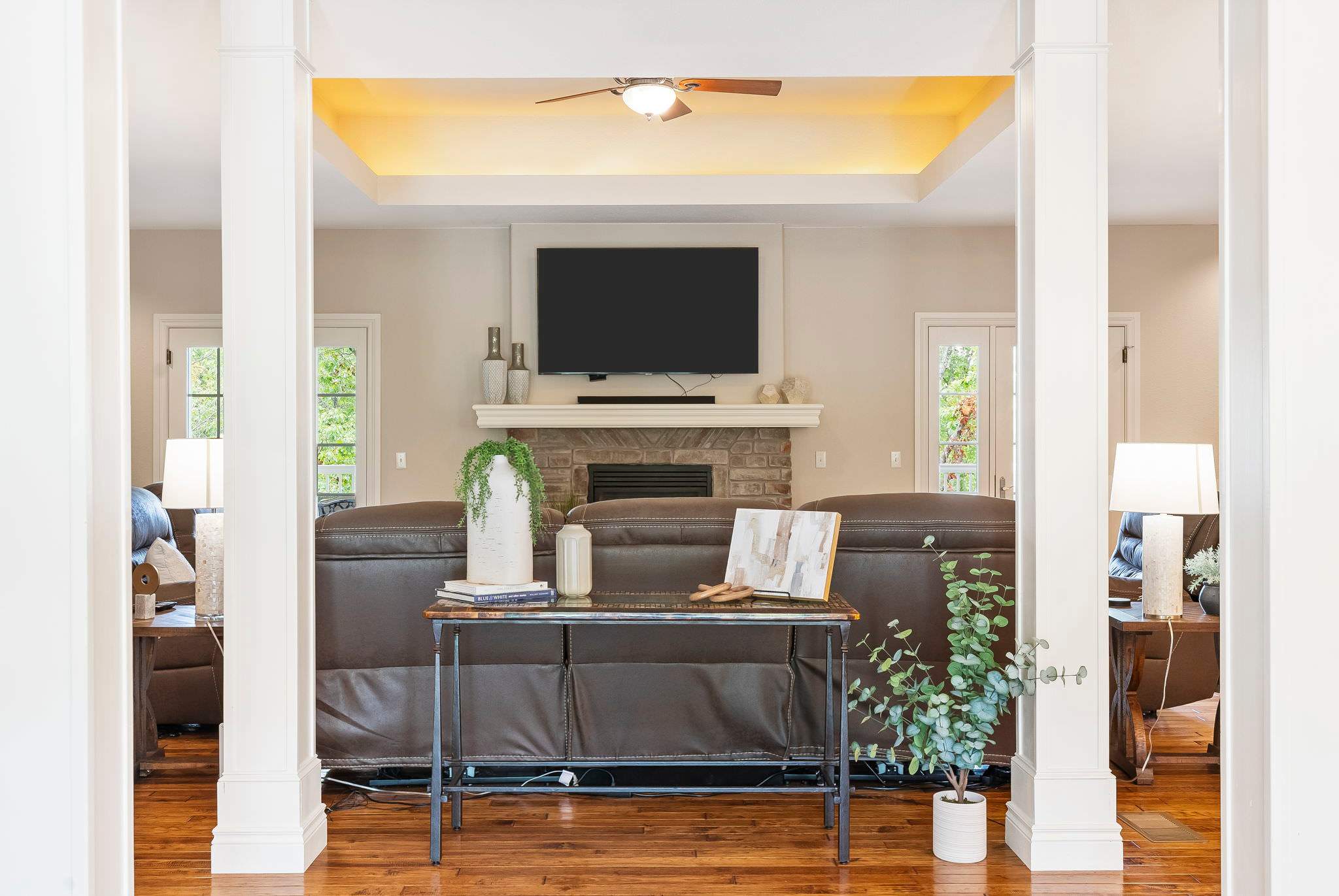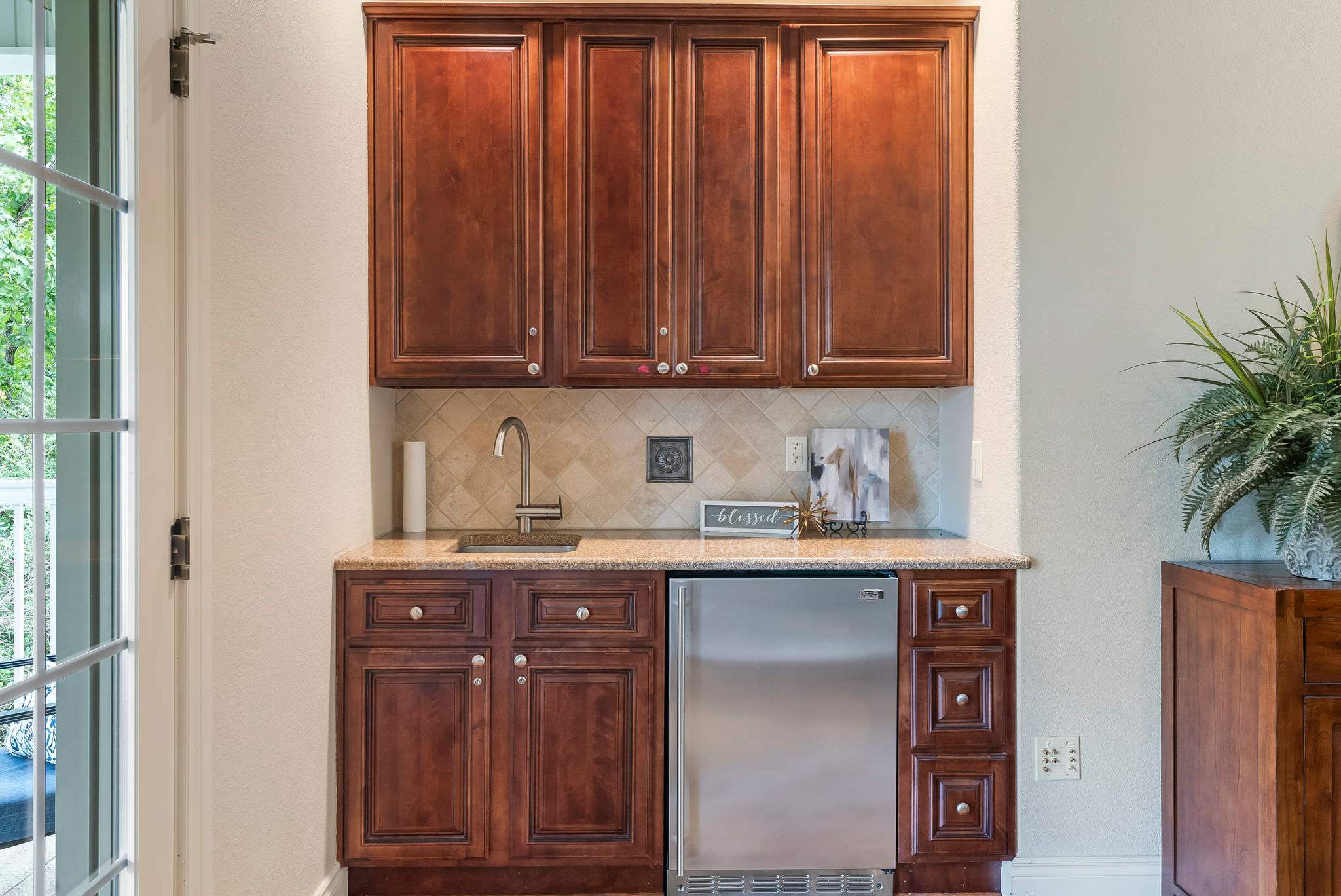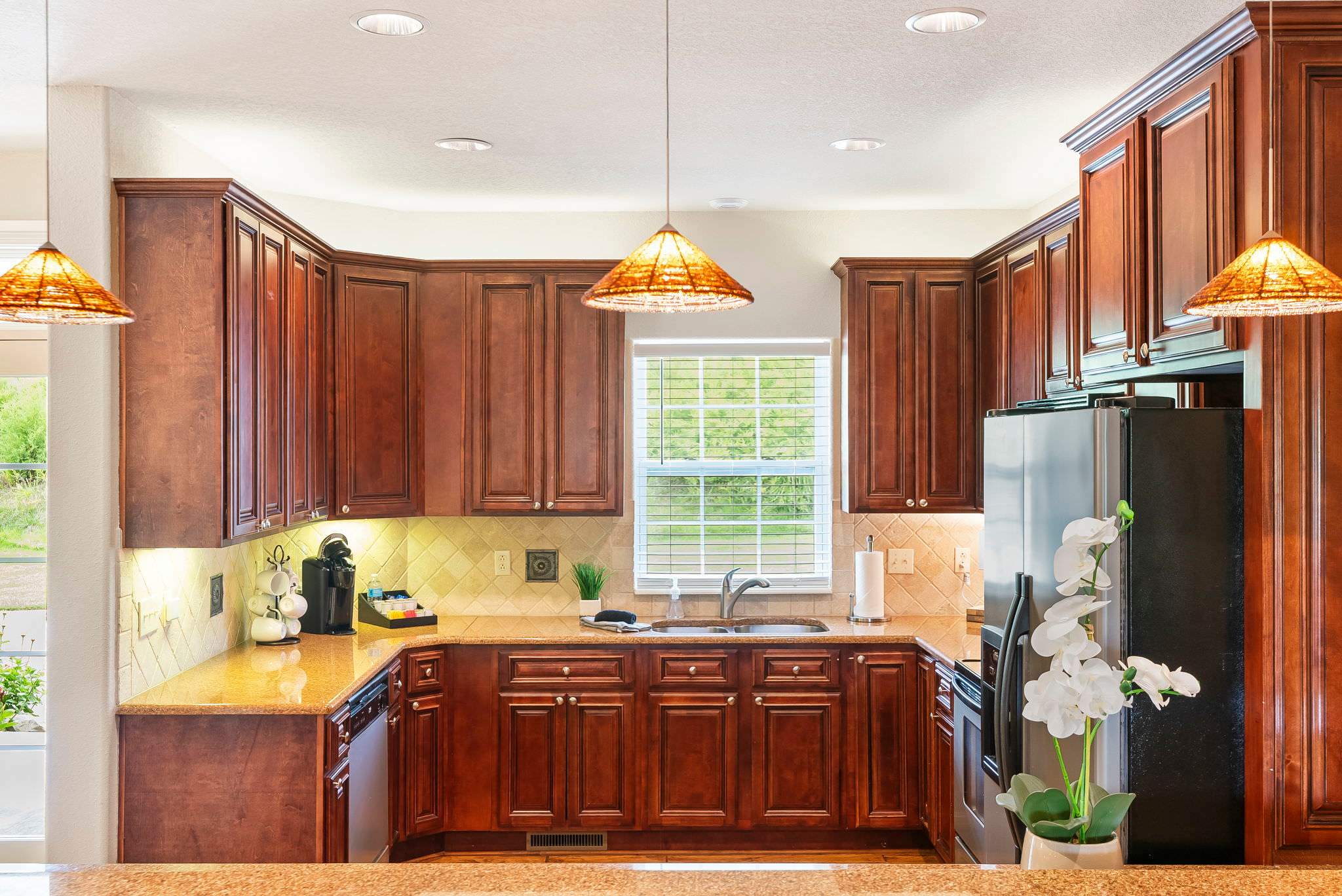 The home offers a peaceful setting with a spacious, covered rear deck overlooking the forests of the Ozarks. It’s likely that you’ll want to take your meals al fresco here at the included dining set with seating for 6, immersed in the fresh air and splendor of nature. Heading inside, you’ll be met with a grand great room featuring high alcove ceilings with recessed lighting, bathing the area in an abundance of light. Plush living room sofas and recliners face a gas fireplace and smart TV, creating a cozy environment for gathering the whole crew together to stream your favorite shows or movies. A wet bar is also conveniently on hand, ready to serve up a few evening cocktails. The spacious kitchen can accommodate a crowd, with warm, rich cabinetry, granite countertops, and updated appliances. Whatever your culinary aspirations, this space can do it all. Serve up a grab-and-go breakfast or a spread of hors d’oeuvres at the extended counter where high-top stools can seat 4. For a more formal mealtime setting, the elegant dining room table across the entranceway can seat 8.