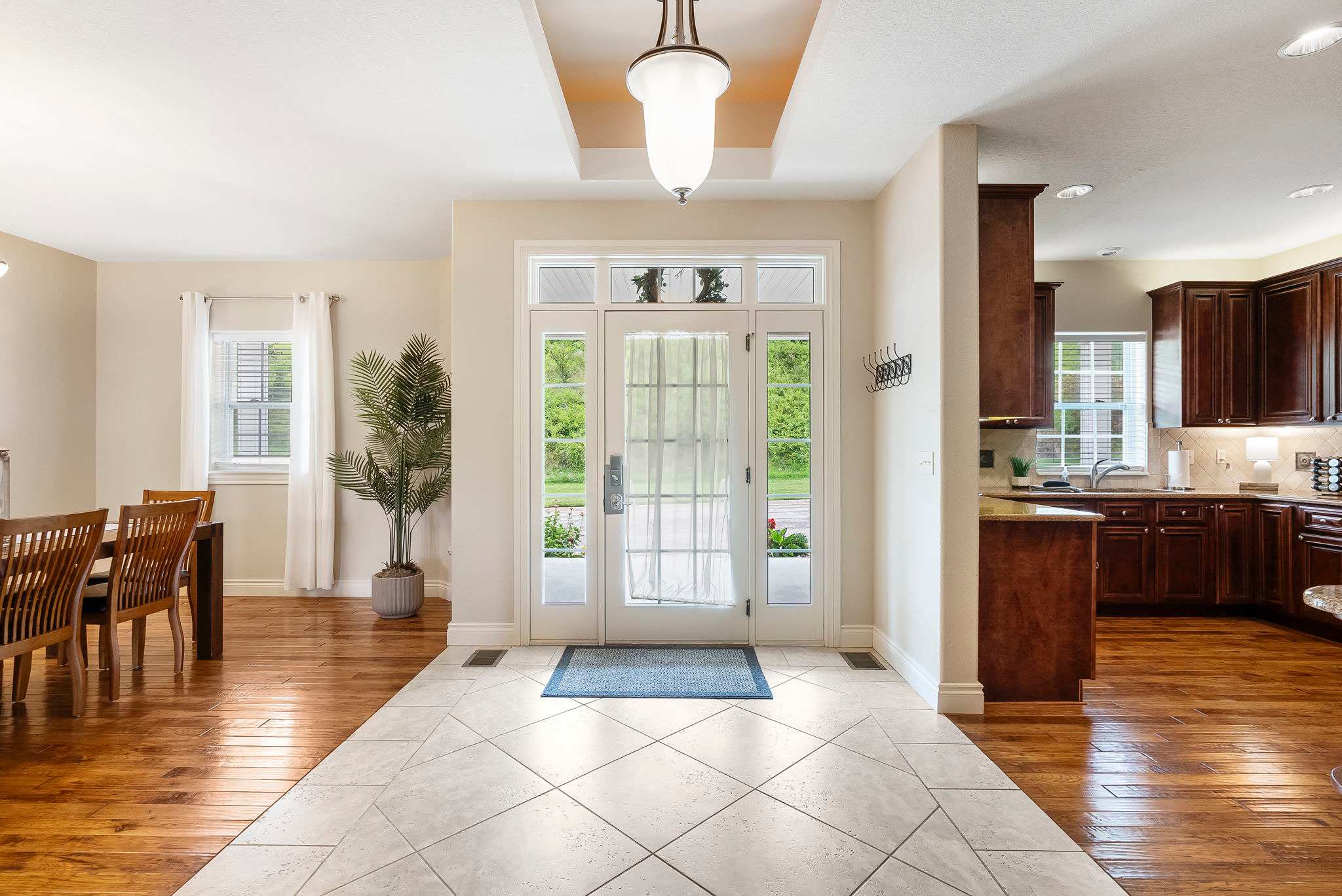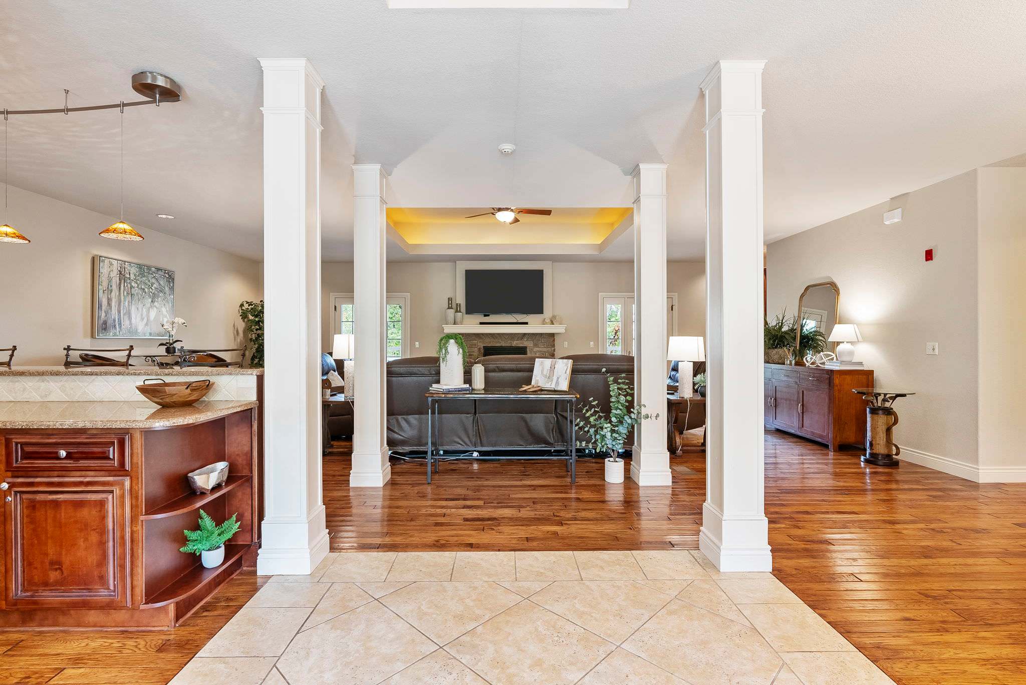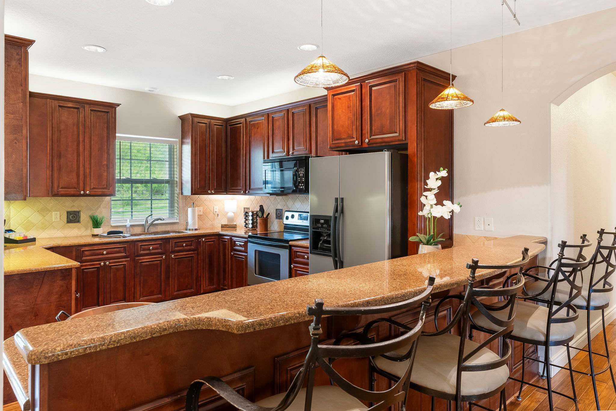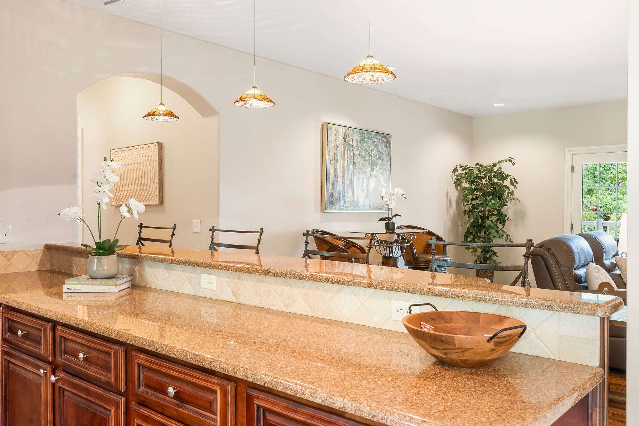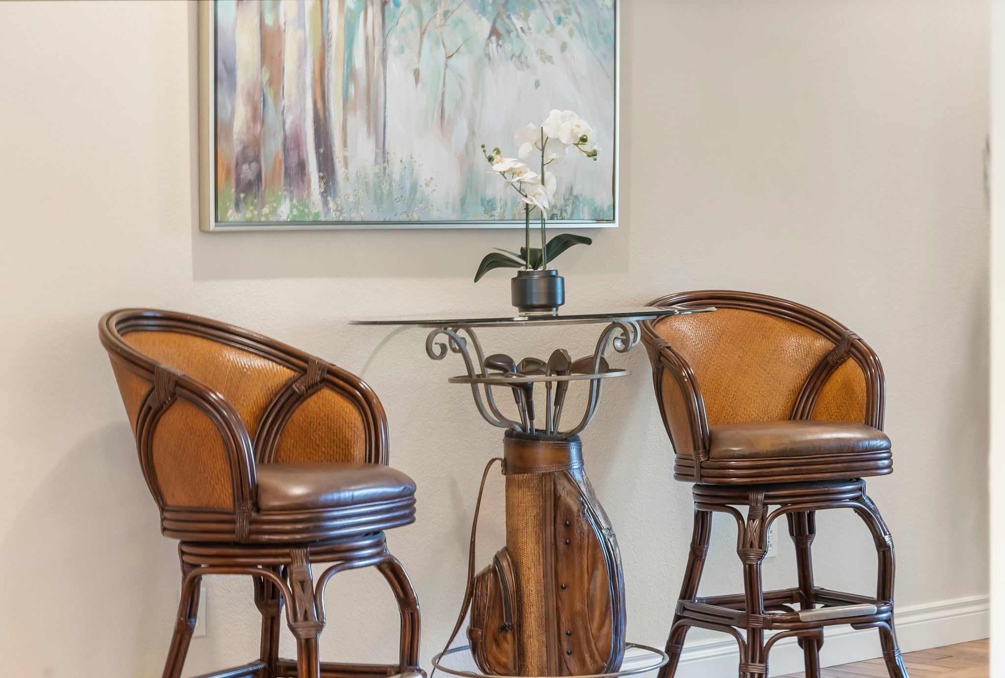 The home offers a peaceful setting with a spacious, covered rear deck overlooking the forests of the Ozarks. It’s likely that you’ll want to take your meals al fresco here at the included dining set with seating for 6, immersed in the fresh air and splendor of nature. Heading inside, you’ll be met with a grand great room featuring high alcove ceilings with recessed lighting, bathing the area in an abundance of light. Plush living room sofas and recliners face a gas fireplace and smart TV, creating a cozy environment for gathering the whole crew together to stream your favorite shows or movies. A wet bar is also conveniently on hand, ready to serve up a few evening cocktails. The spacious kitchen can accommodate a crowd, with warm, rich cabinetry, granite countertops, and updated appliances. Whatever your culinary aspirations, this space can do it all. Serve up a grab-and-go breakfast or a spread of hors d’oeuvres at the extended counter where high-top stools can seat 4. For a more formal mealtime setting, the elegant dining room table across the entranceway can seat 8.