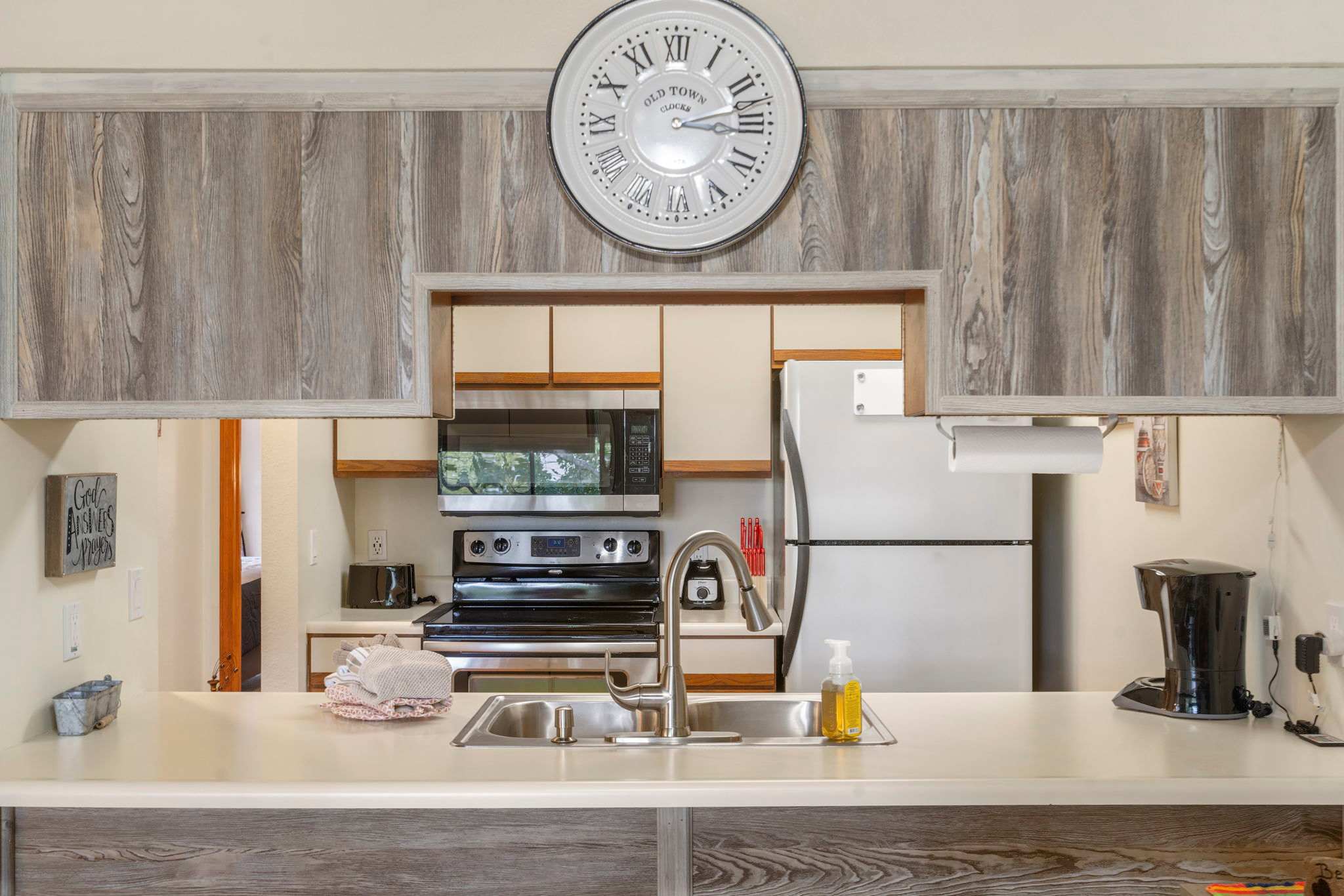 Inside the home, you’ll love all the homey touches paired with the soothing and neutral color scheme. The living room includes a comfortable sofa and large, mounted smart TV where you can kick up your feet and stream all your favorites. In the cooler months, the electric fireplace provides a warm ambiance throughout the space, creating the perfect setting for catching up on your reading. The shaded balcony offers views of the pond and golf course where you can enjoy serene moments with your morning coffee or an afternoon cocktail. Back inside, the stylish high-top dining table can accommodate up to 4 or pull up a stool to the kitchen counter for more casual bites. The bright and open kitchen includes stainless steel appliances and Keurig coffee maker. The choice is truly yours to prepare convenient meals at home or dine out at a local restaurant.