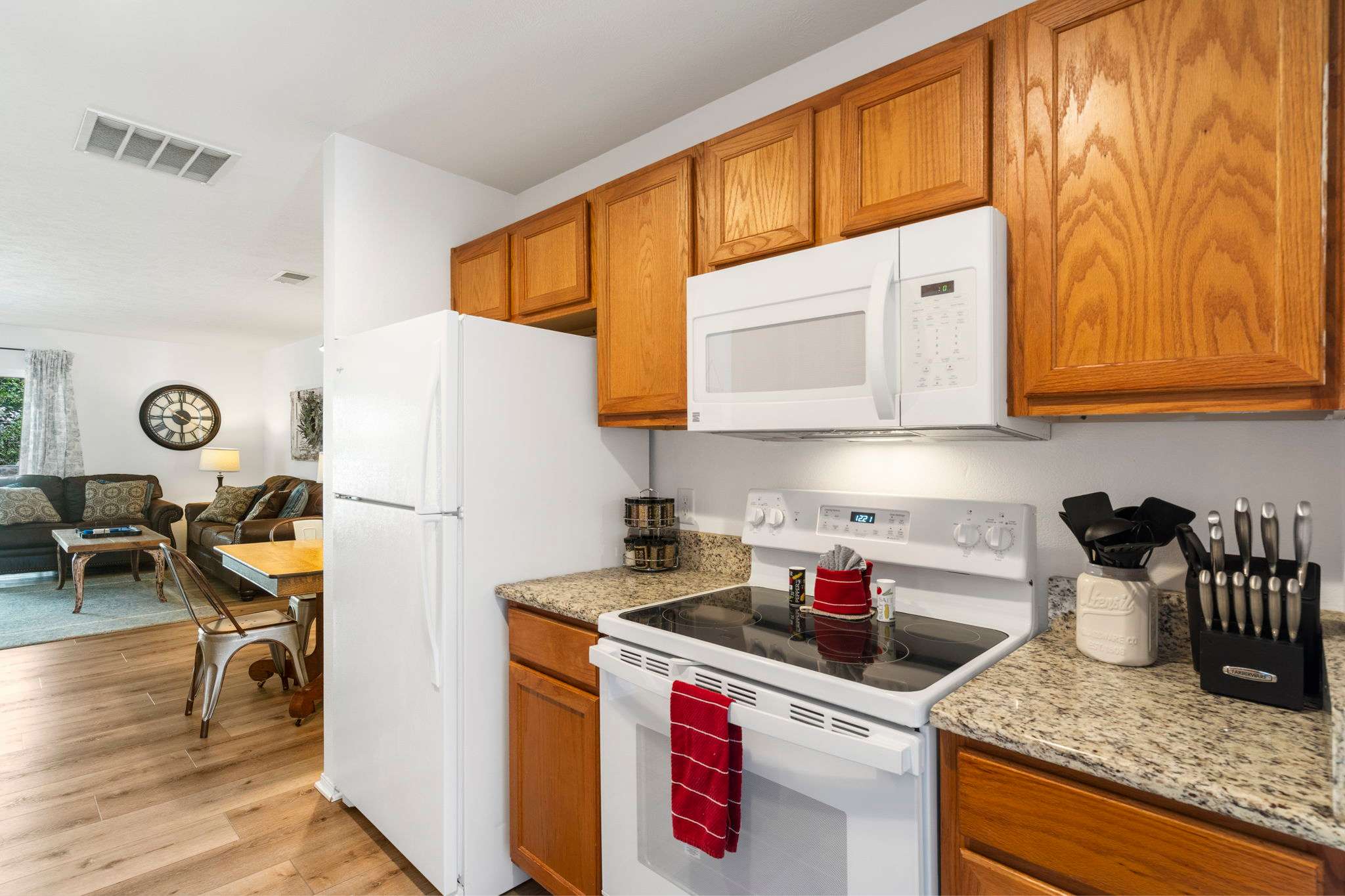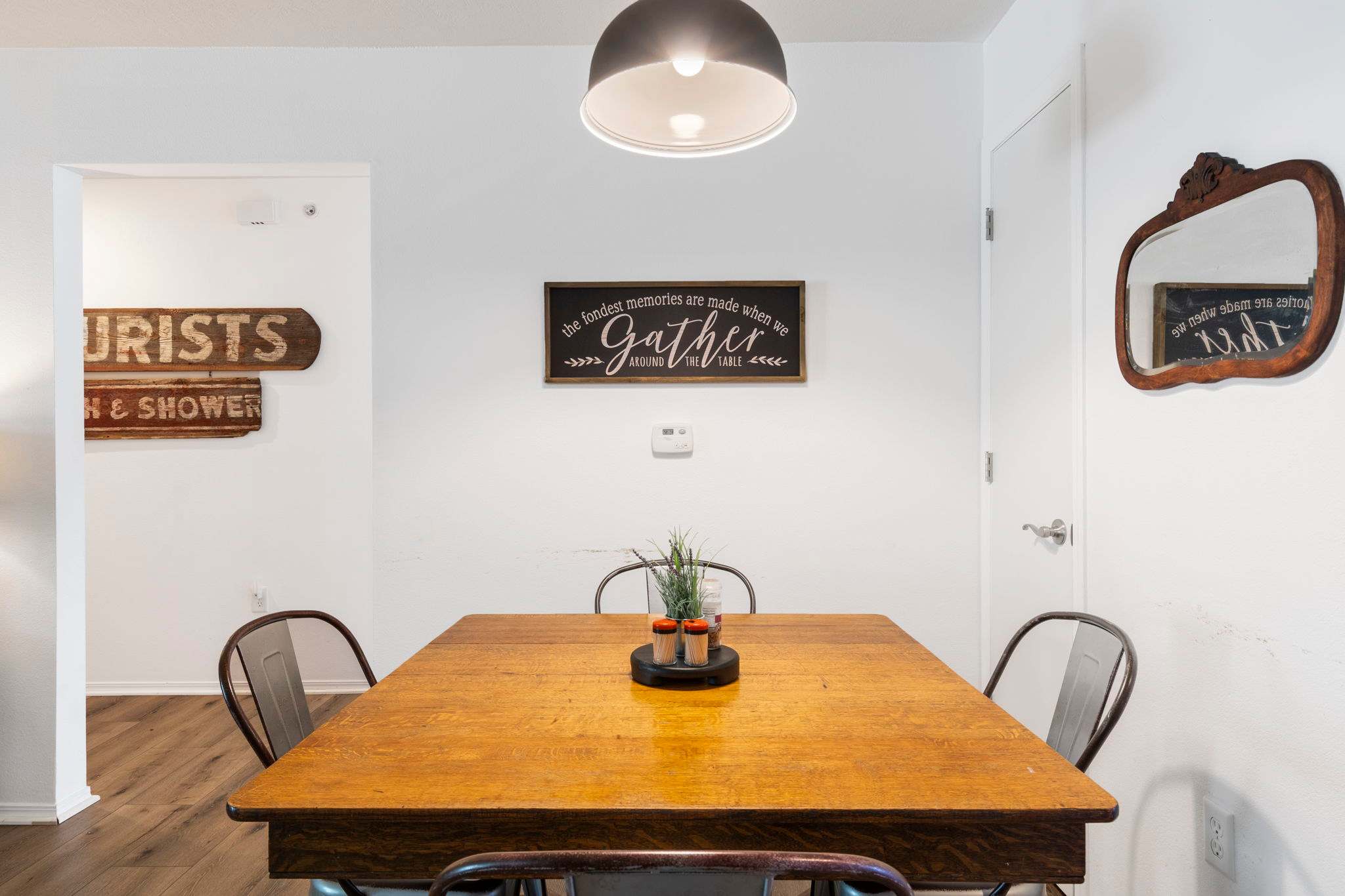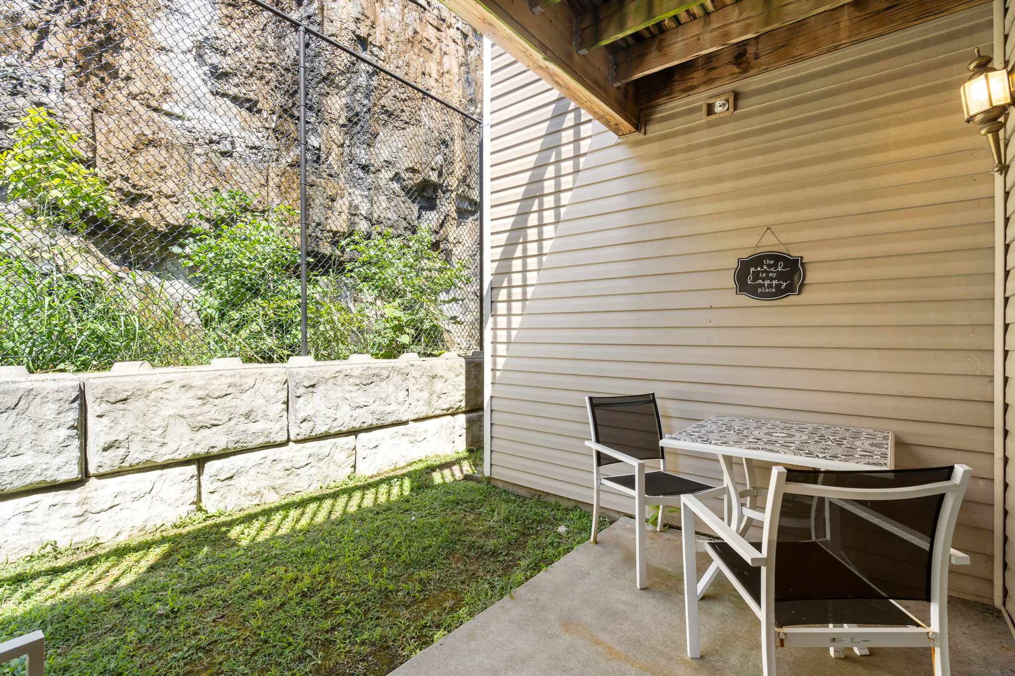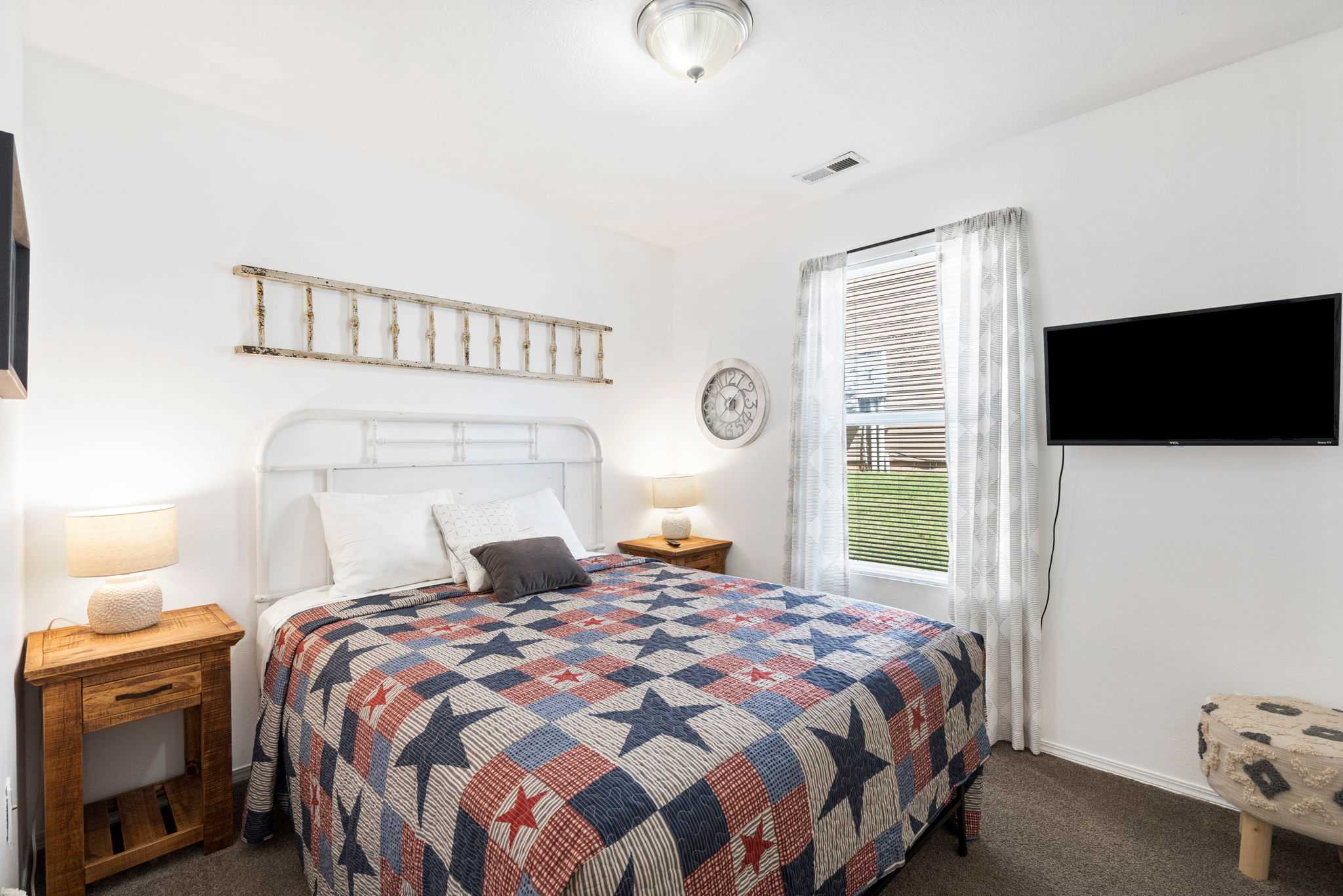 You’ll feel immediately at home among the beautifully furnished spaces, accented by classic design and décor. Each space has been curated to maximize your comfort and stocked full of amenities to make your vacation special. In the living and dining spaces, conversation can flow freely courtesy of the open concept floor plan. The living room features sofa seating and a smart TV, a cozy space to relax during downtime in the morning or evening hours. Come together for meals at the dining room table with seating for 4, prepared in the spacious, well-equipped kitchen. Here you’ll find all standard appliances, drip coffee maker, cookware, and dining ware necessary for preparing homecooked meals should you so choose. When you’re ready for a little more of that fresh Ozark air, a shaded patio offers an additional dining table and chairs for evening cocktails or meals al fresco.