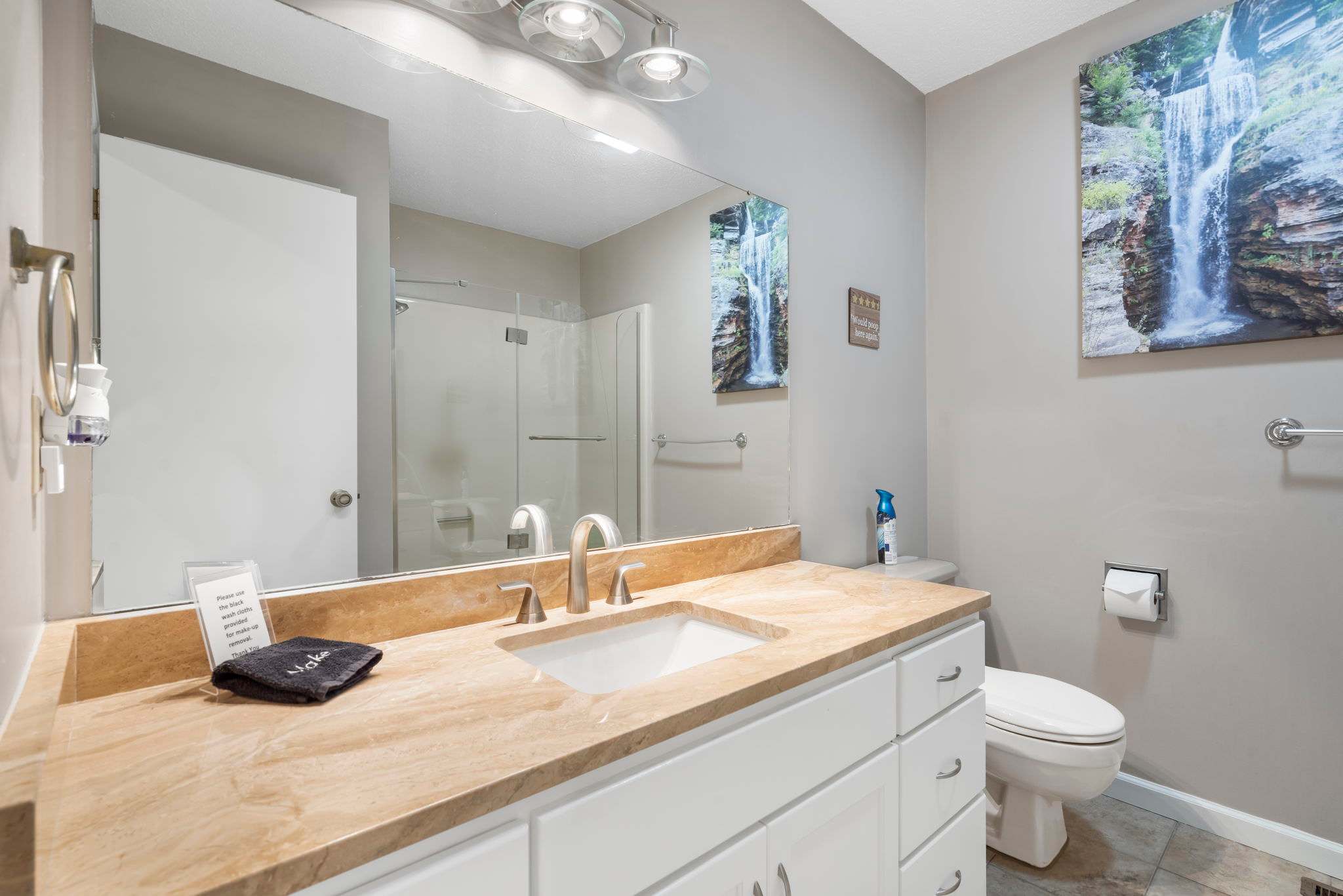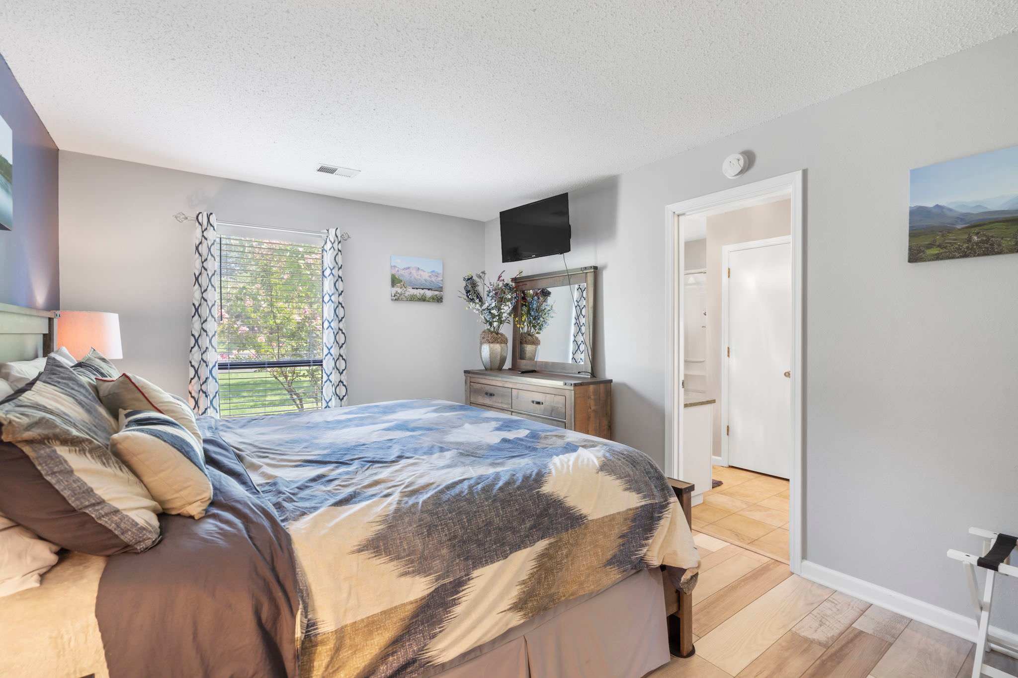 Bedroom #1 includes a king-size bed, TV, and ensuite bathroom with a single vanity and walk-in shower.