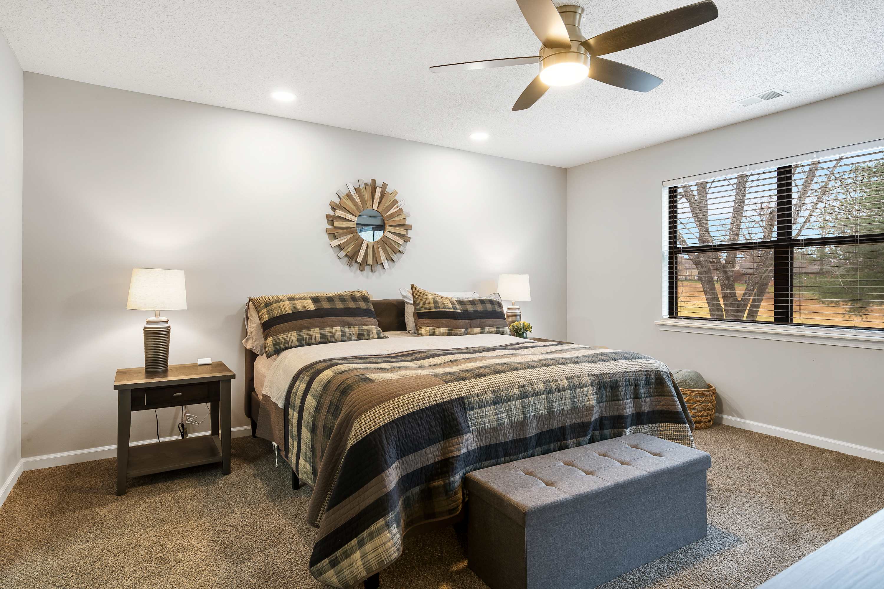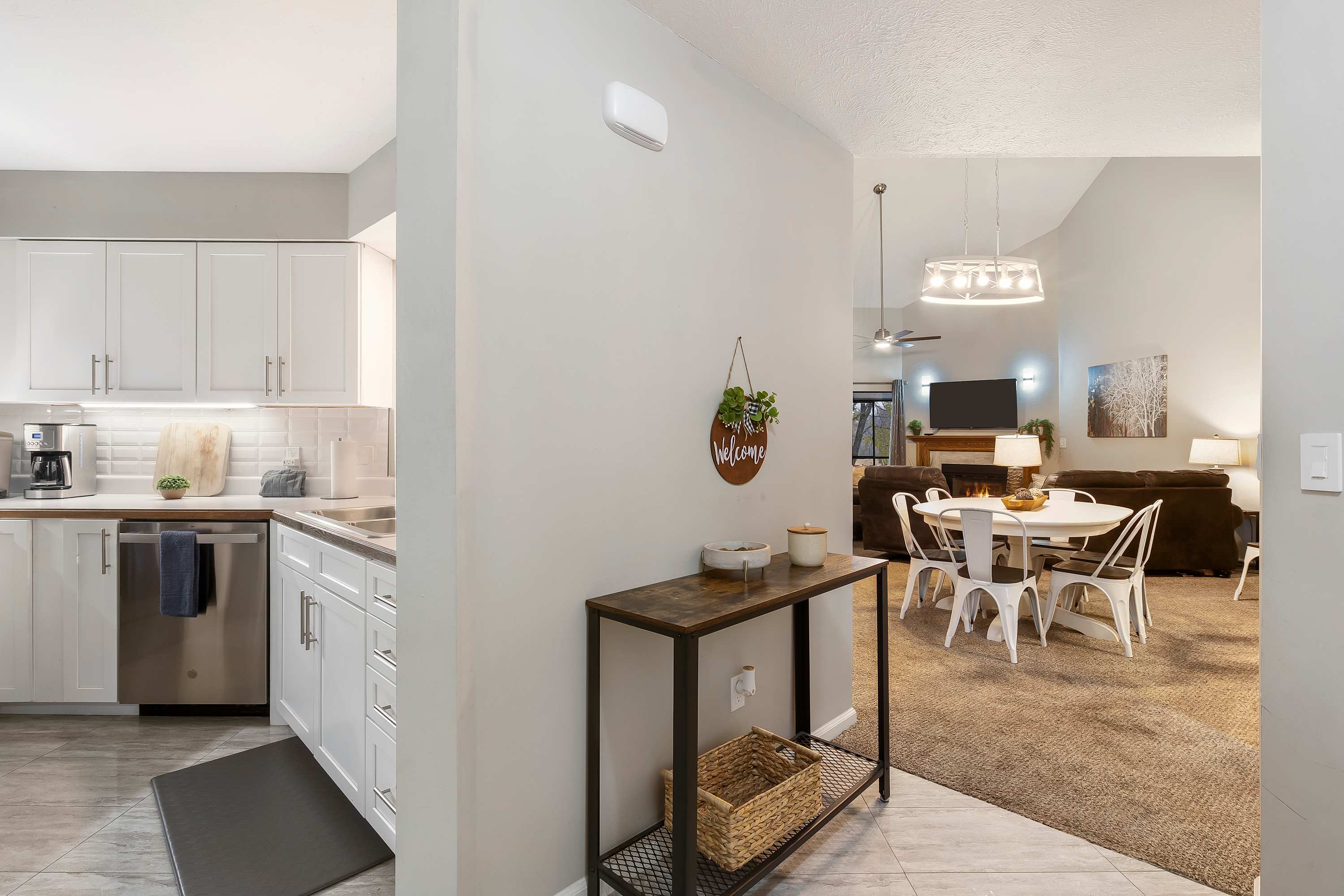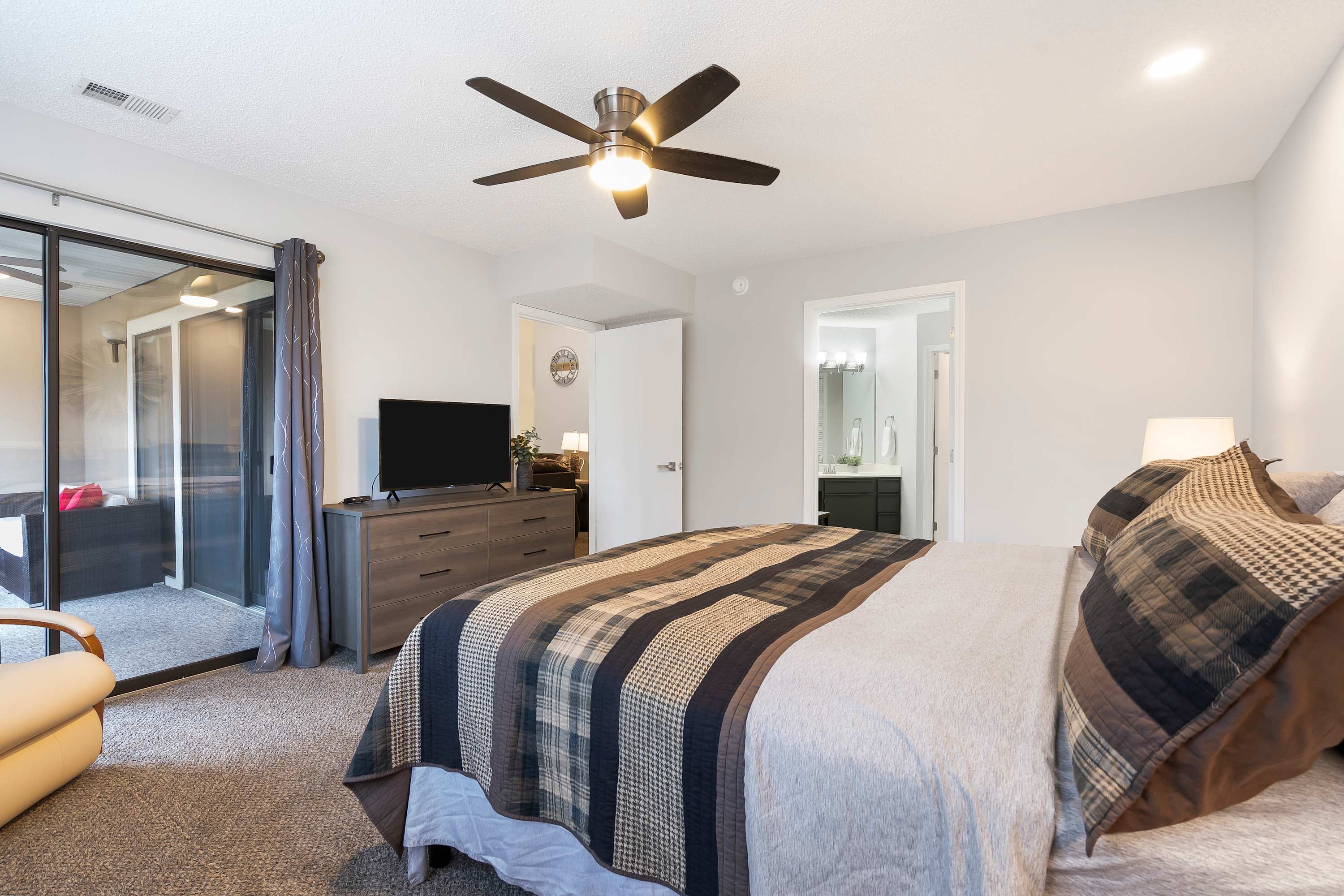 You’ll be even more delighted by the interior of the home with its soothing neutral tones and comfortable, contemporary furnishings. On the main level, the living room is accentuated by soaring vaulted ceilings, offering plush sofa seating, a smart TV, and an electric fireplace. Through the sliding glass door, step out onto the enclosed patio where you find an outdoor sofa set and a high-top table with seating for 4 where you can sip your morning coffee while overlooking the links or enjoy a meal al fresco in the fresh Ozark air. Back indoors, you’ll find a chic dining room table for 6 with an additional 2 seats at the nearby kitchen counter. The sleek kitchen is fully equipped with stainless steel appliances, drip and Keurig coffee makers, cookware, and dinnerware. The choice of preparing home-cooked meals or takeout from a local restaurant is all yours!