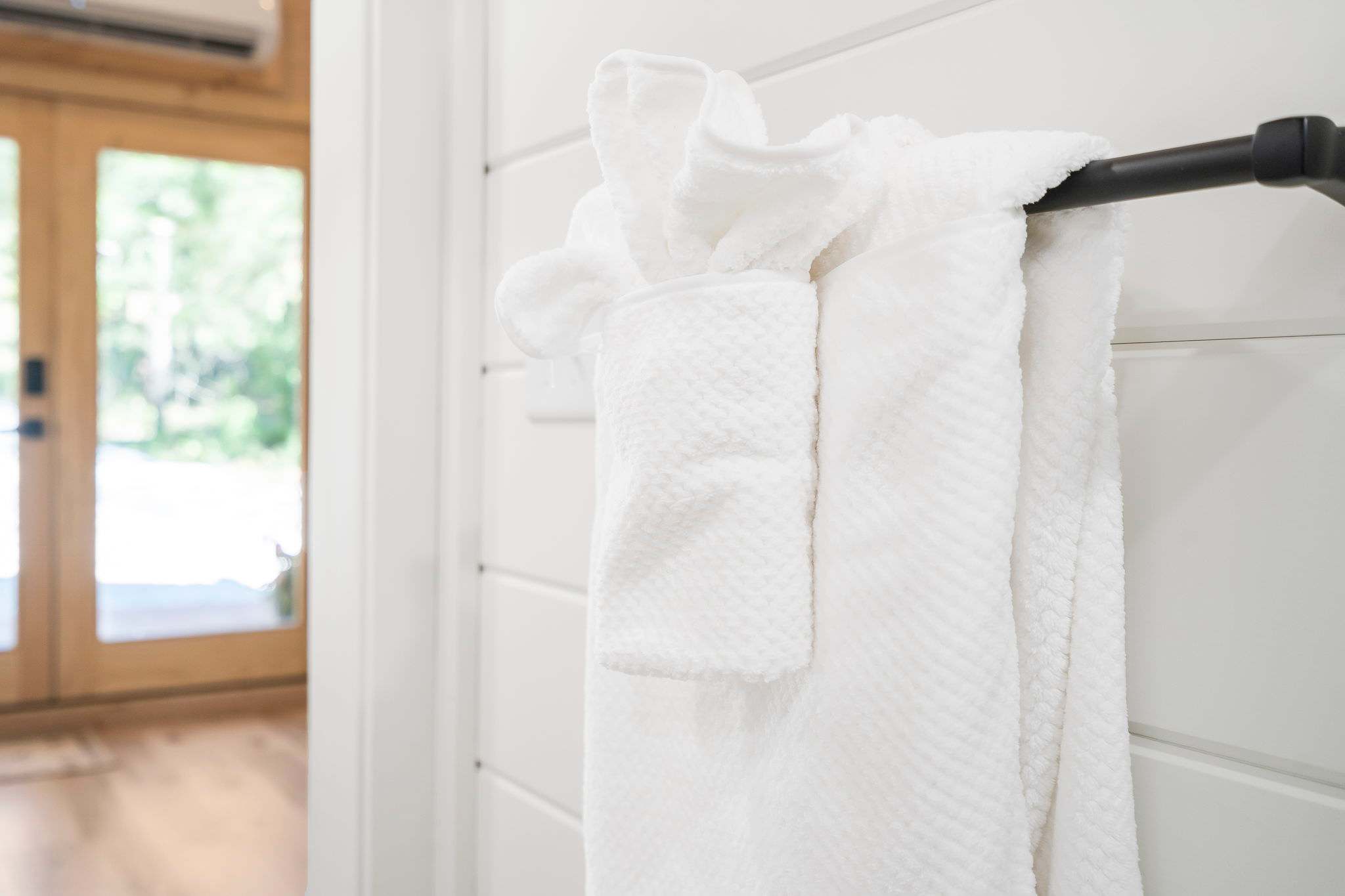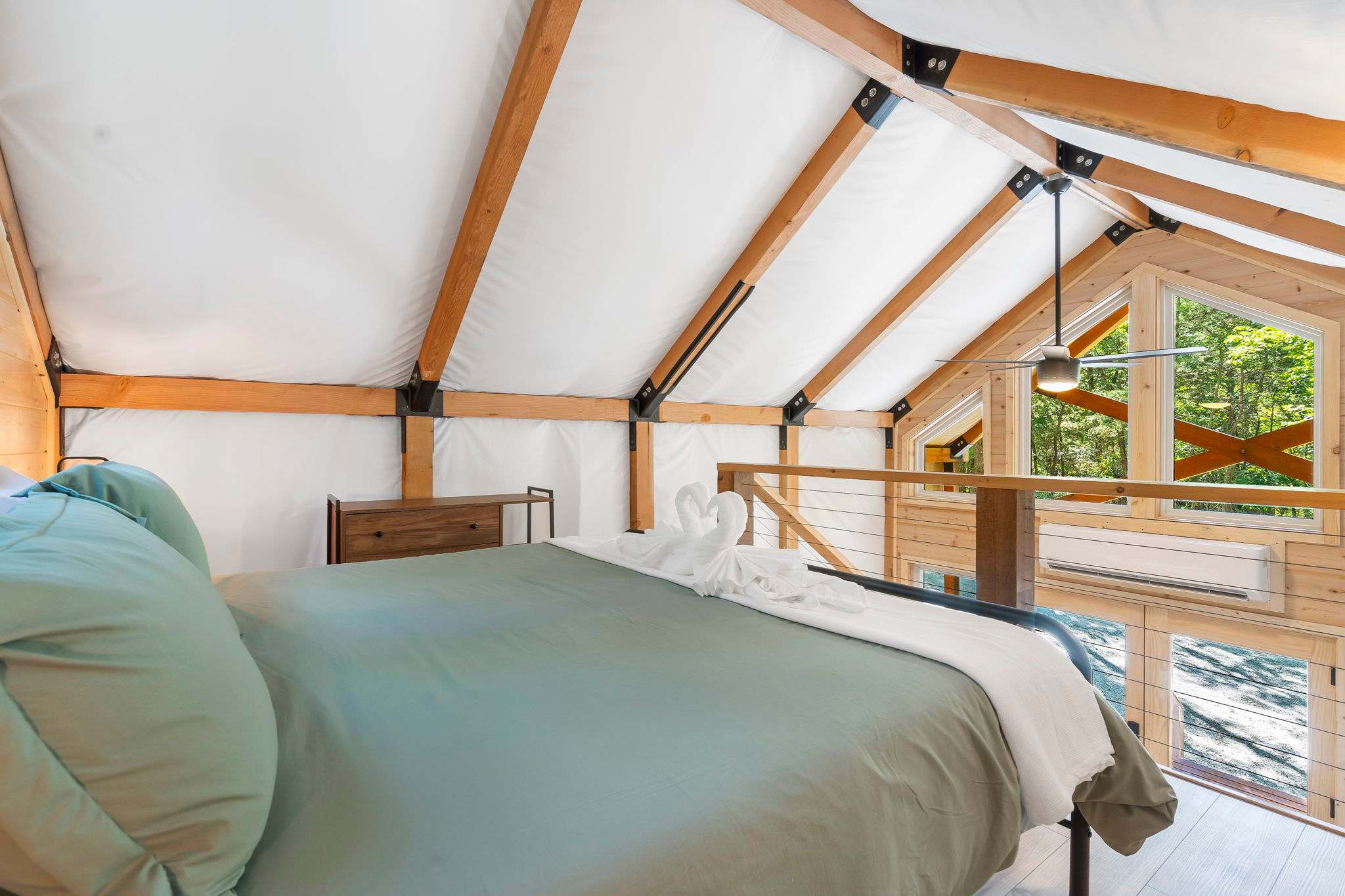 Combined, these cabins comfortably sleep 8 guests between a loft bedroom and a queen size sofa sleeper in each. The bedrooms offer spacious king size beds with fresh linens and soft blankets. The cabin’s modern bathrooms are equipped with single vanities and walk-in showers.