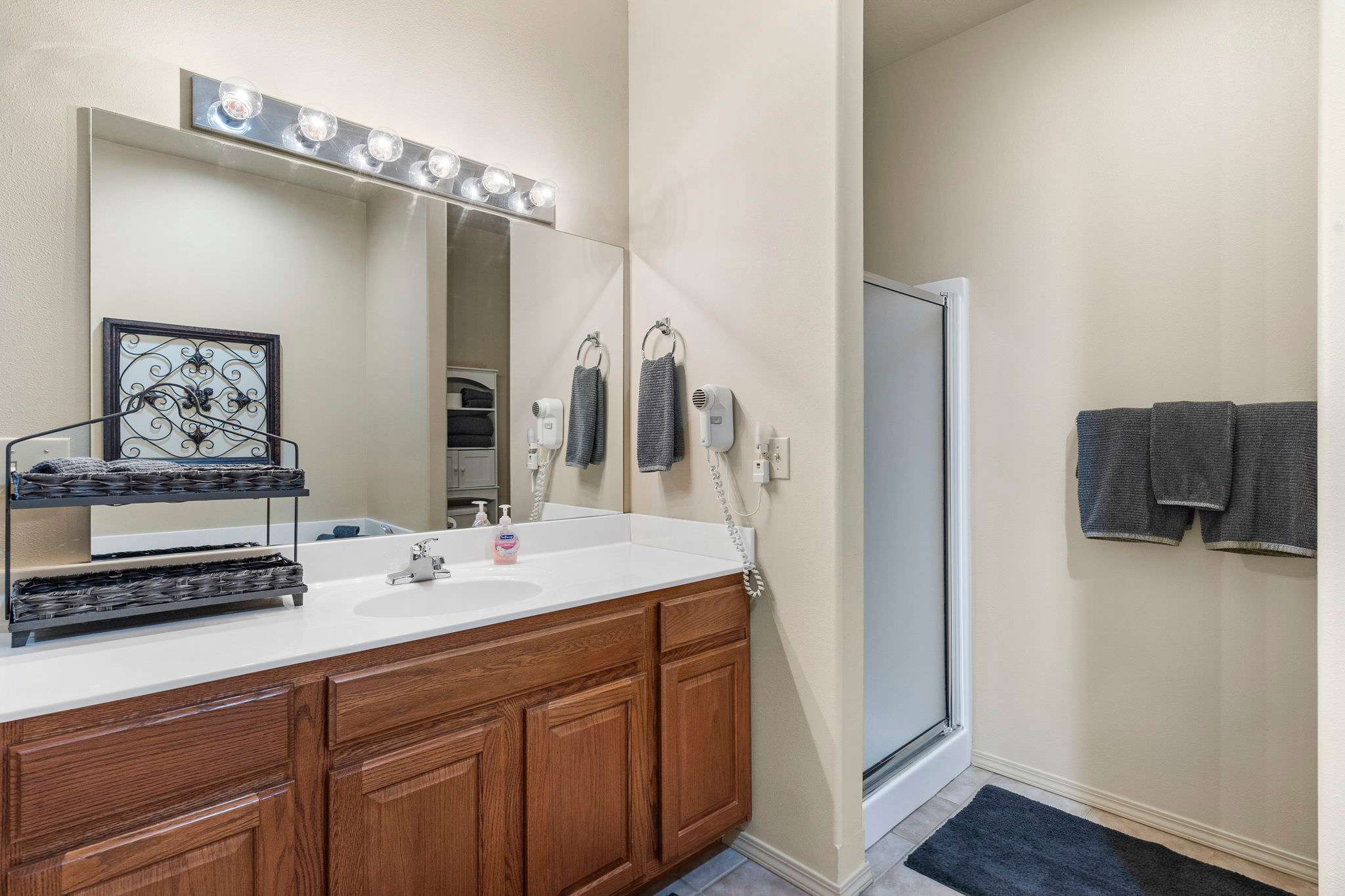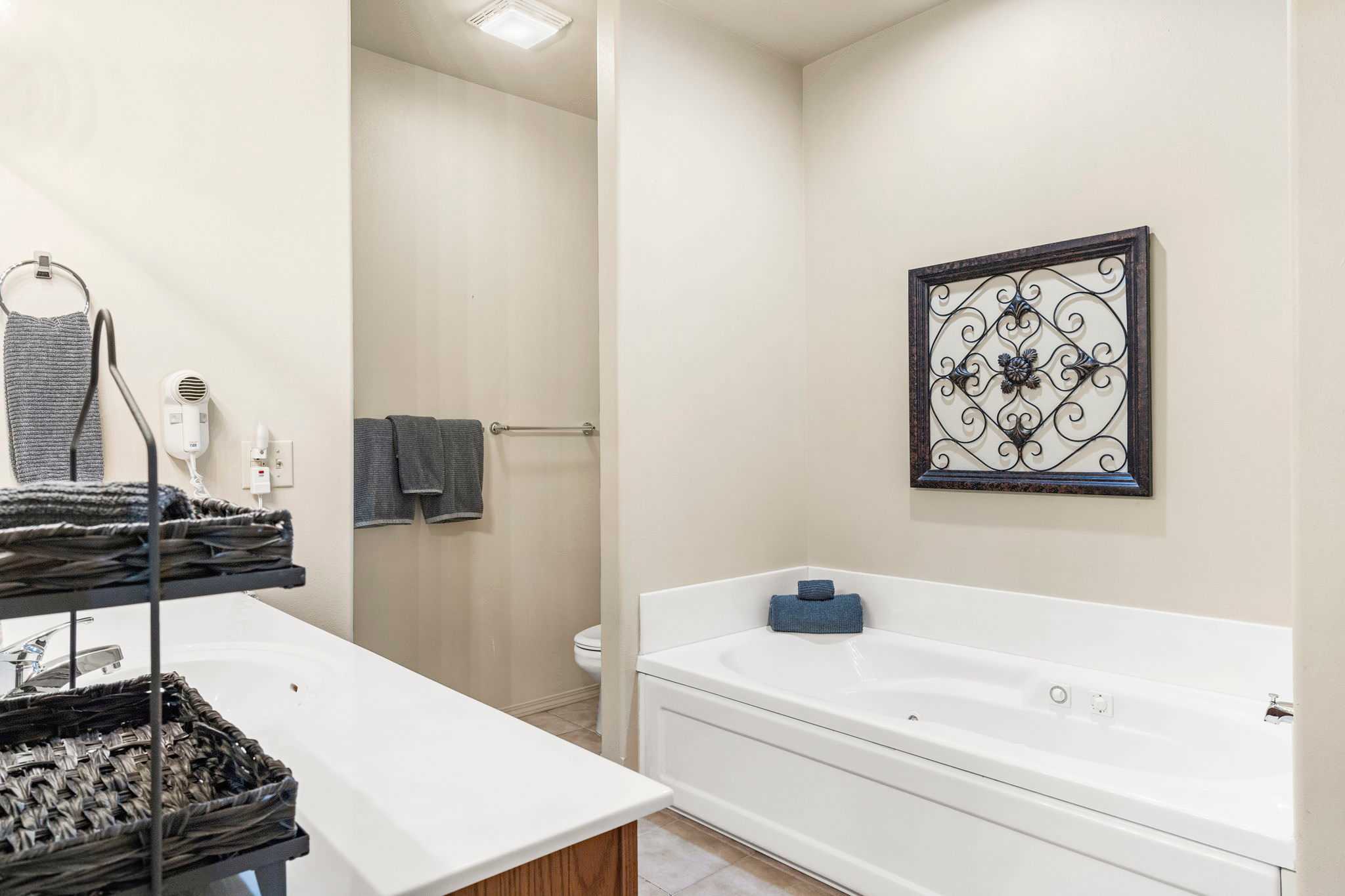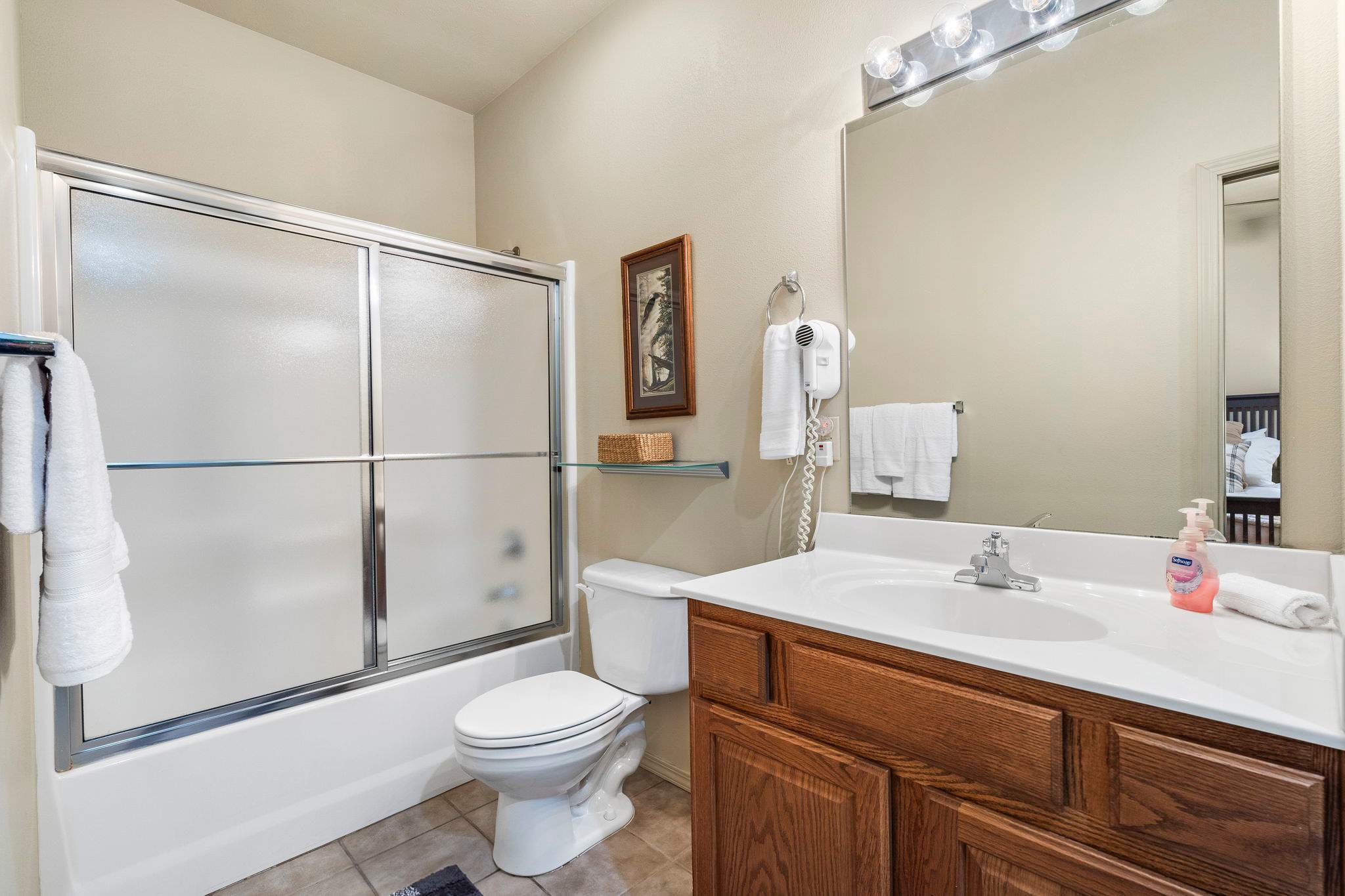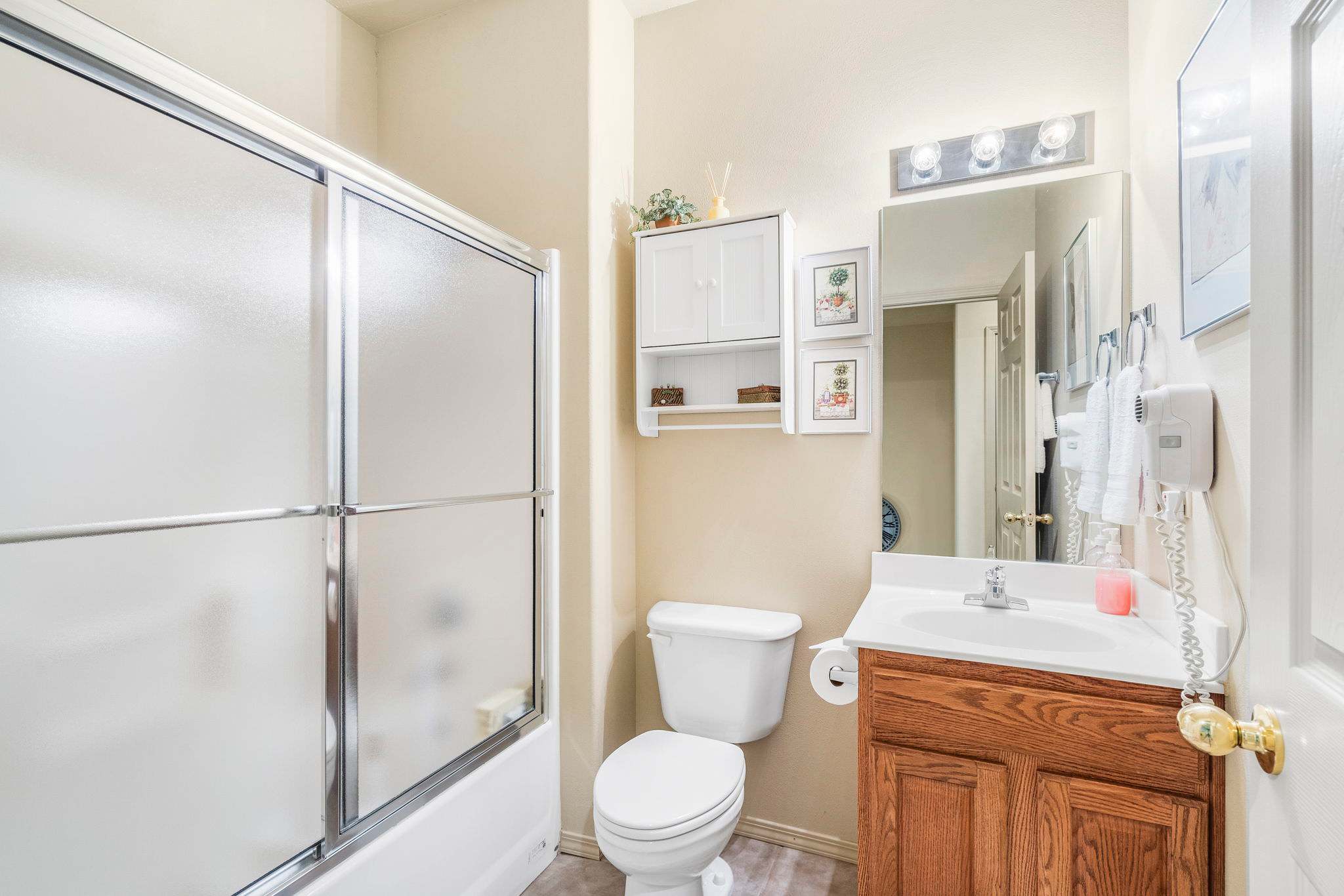 The home also includes an additional full guest bathroom with a single vanity and shower/tub combo.