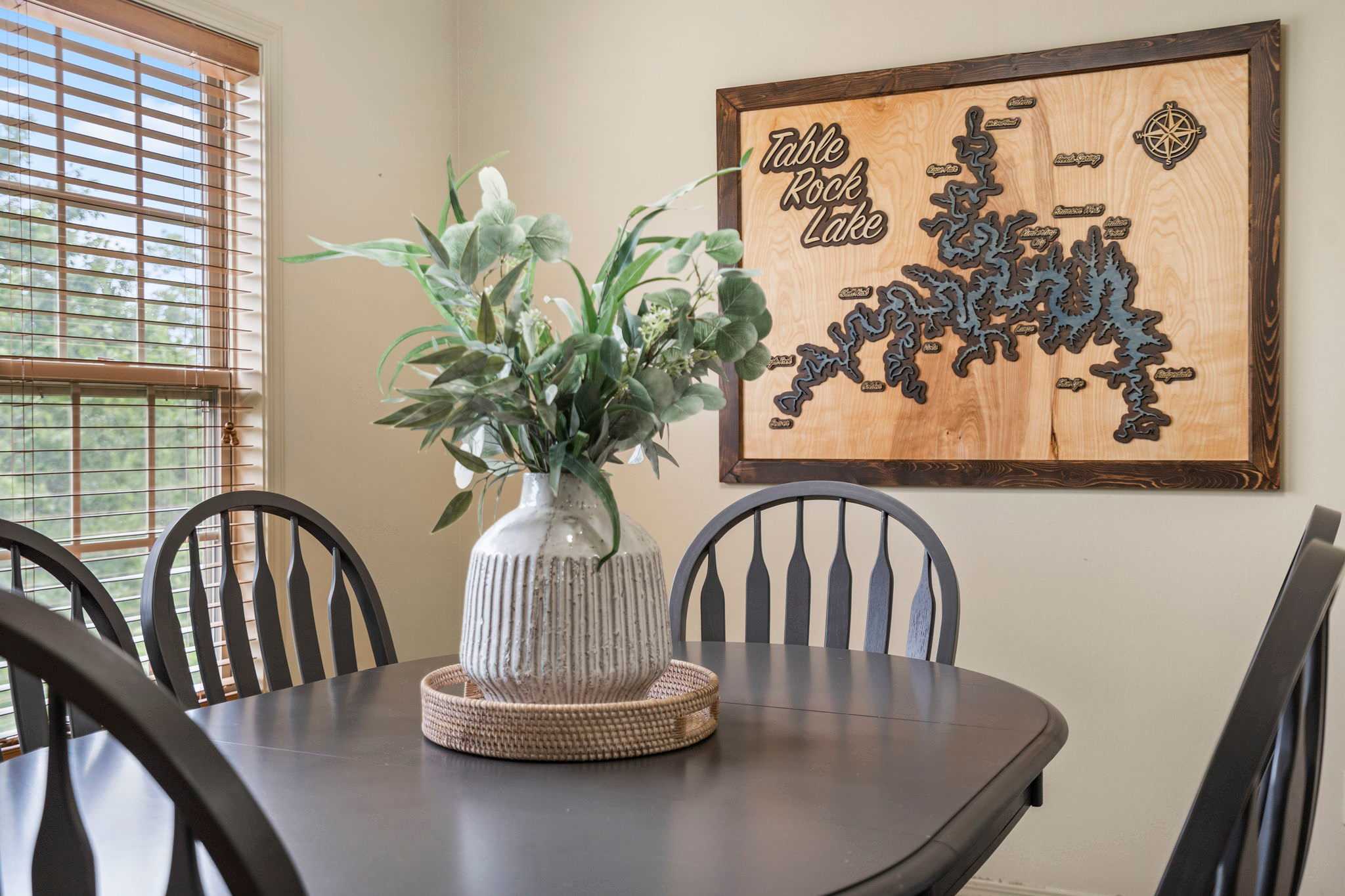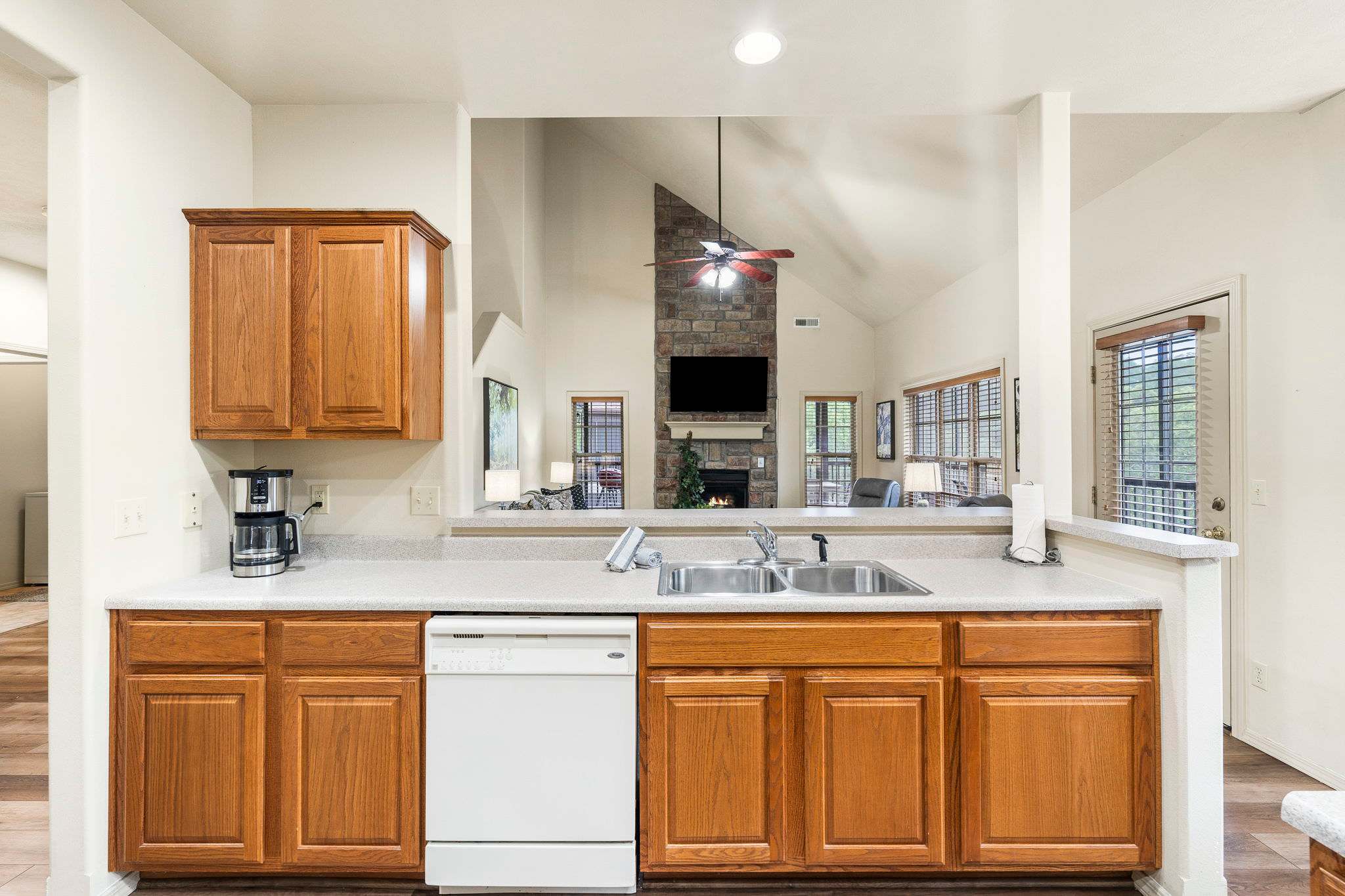The spacious yet cozy living room is a welcome place to kick up your feet after a long day of exploring the local sights and thrills, with vaulted ceilings, comfortable sofa, and recliner seating, and large mounted smart TV. The open floor plan keeps the conversation flowing from room to room as you step into the chic dining area with table and chairs for 6. Just beyond, a generous, well-equipped kitchen with all standard appliances, drip coffee maker, cookware, and dining ware can accommodate any type of meal you desire whether it be homemade or trying takeout from a local restaurant. If you have barbeque fans in your group, a community charcoal grill within the complex is available for guest's use.