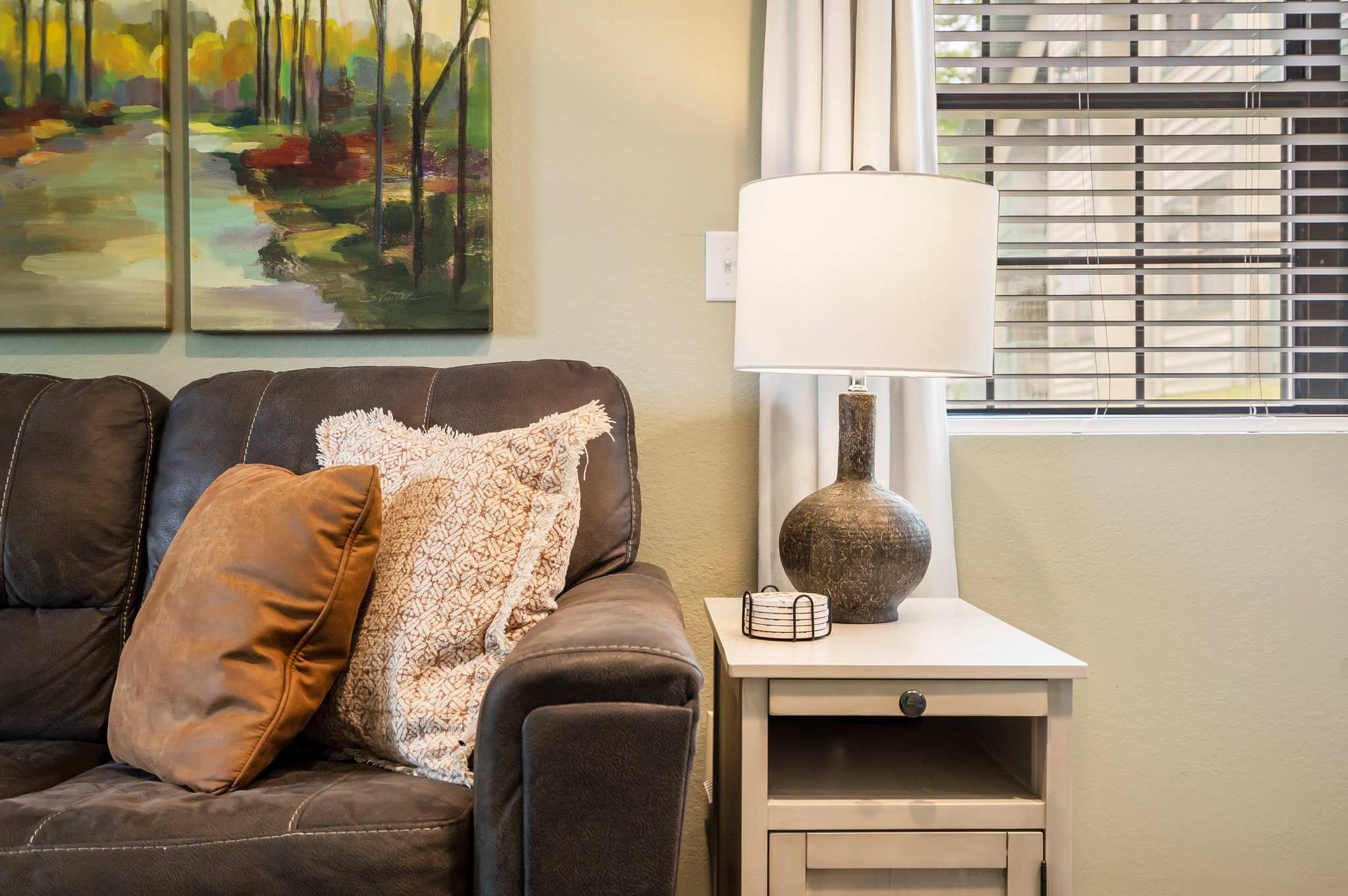 Located in The Greens condominium complex, guests will be able to enjoy a seasonal saltwater pool as well as views of the Thousand Hills Golf Course located right next door. A spacious, covered patio offers comfy seating for evenings filled with casual conversation catching up on the musings of the day, or for a peaceful moment enjoying your morning coffee. Inside the home, there is even more to enjoy. An open-concept floor plan organically blends the living spaces together so that you and your guests can spread out while still enjoying each other’s company. The cozy living room offers sofa and recliner seating, a TV, and an electric fireplace when you’re in need of some much-deserved downtime. Create the perfect ambiance for watching a movie on cooler nights. Steps away, the dining room table includes seating for 6 that’s well-suited for both dining and hosting a game night. A chic coffee bar offers a dual drip and single-serve coffee maker. The spacious kitchen is fully equipped with all standard appliances, cookware, and dining ware should the mood strike you to whip up a home cooked meal.