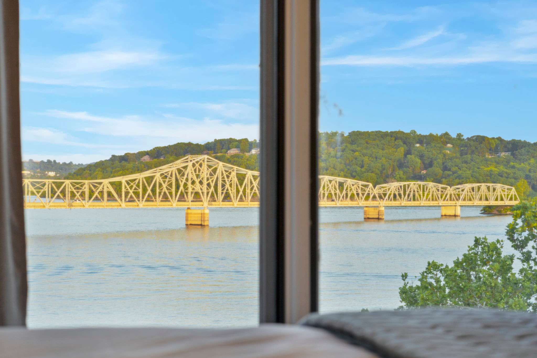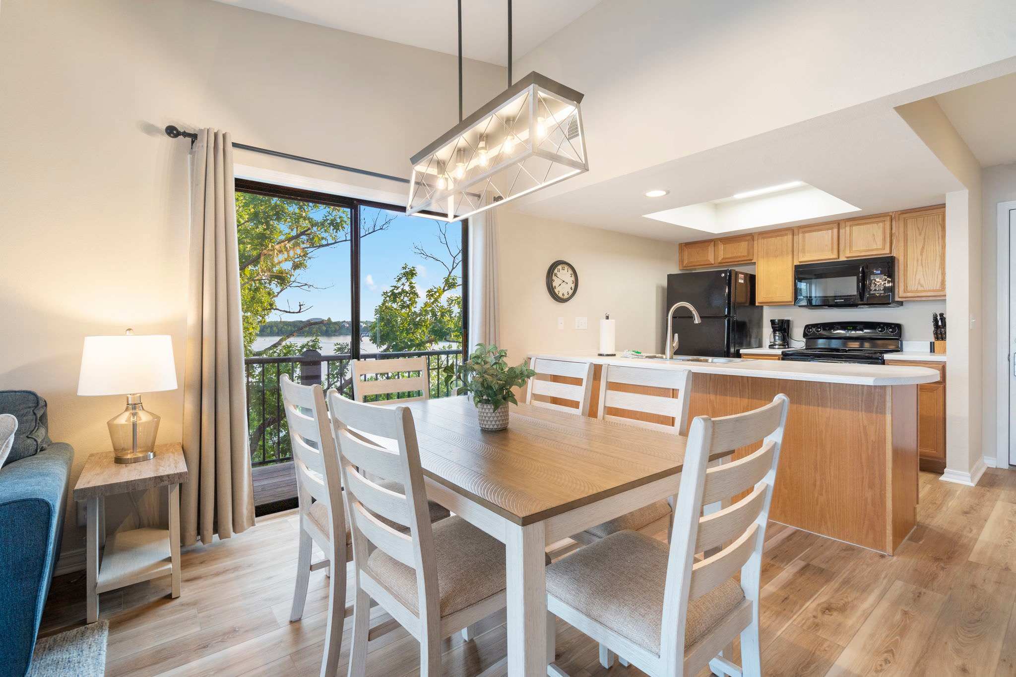 The spacious wraparound outdoor balcony offers unlimited views of the lake as well as the scenic Kimberling City Bridge. A café table with seating for 4 provides the option for an outdoor meal or game of cards in the fresh Ozark air. Stepping inside, bright, well-lit spaces stocked with comfortable furnishings invite you to unwind after a long day of outdoor activities. From the cozy living room with ample sofa-style seating and large, mounted smart TV to the dining room table with seating for 6, you and your guests will find places suitable for spreading out or coming back together for memorable moments. A clean, well-equipped kitchen with all standard appliances and drip coffee maker allows for home-cooked meals and plenty of counter space for preparing local takeout.