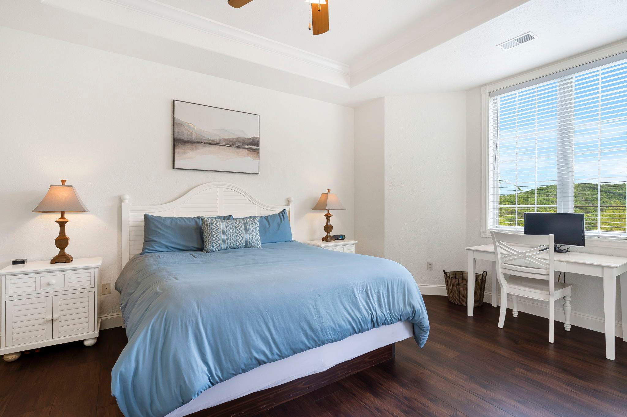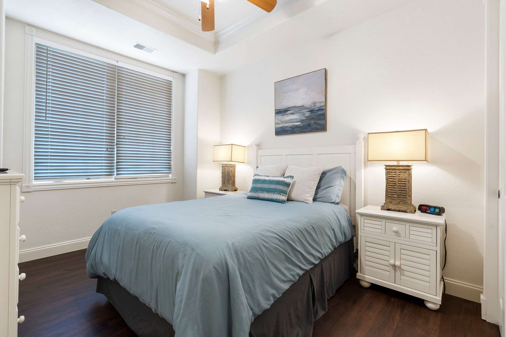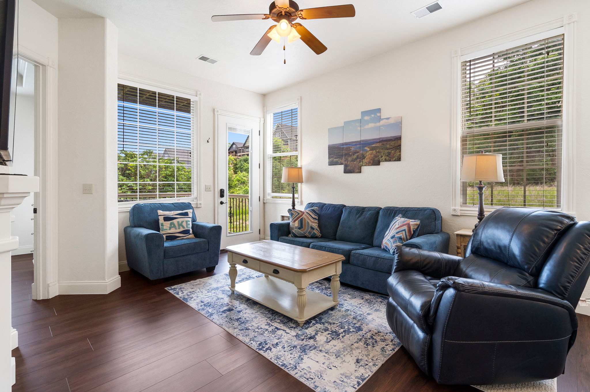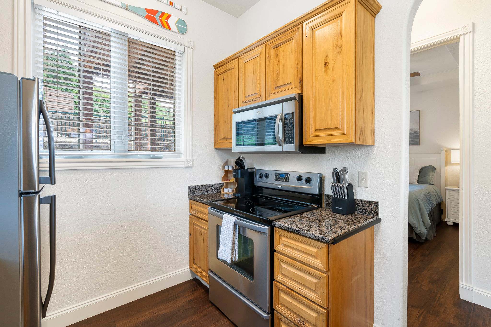 The home’s interior has been artfully decorated and comfortably furnished with your ultimate relaxation in mind. Spacious rooms with an abundance of natural light create an ambiance of calm, where you can kick up your feet and let your outer worldly cares wash away. The living room features comfy sofa and armchair seating facing a cozy electric fireplace and large mounted smart TV. All entertainment is at your fingertips should you partake in a movie or televised sporting event. The nearby dining room table offers seating for 4, while additional seats at the counter offers room for 2 more. A well-equipped kitchen offers all standard appliances, cookware, and dining ware that can cater to any type of meal.