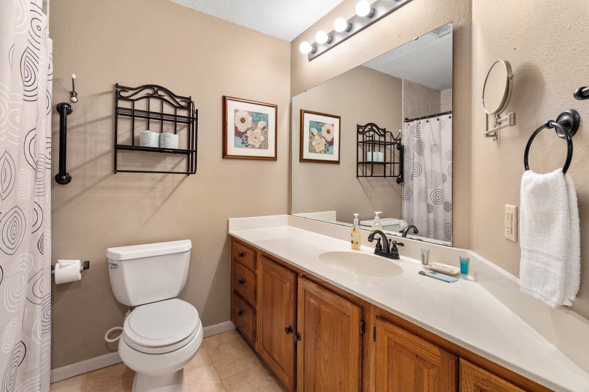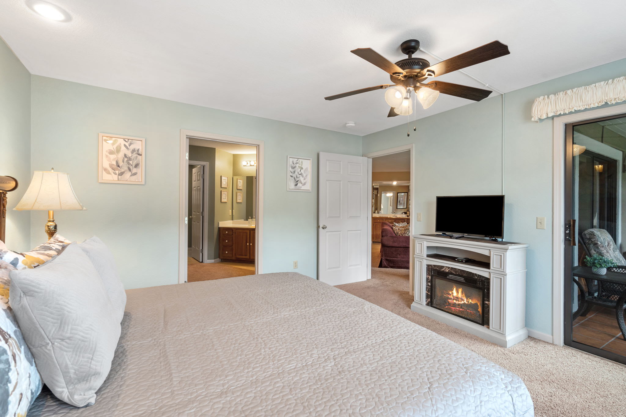Bedroom #1 has a king size bed, tv, and ensuite bathroom with a single vanity and shower/jetted tub combo. A sliding glass door opens right onto the home’s all-season balcony.