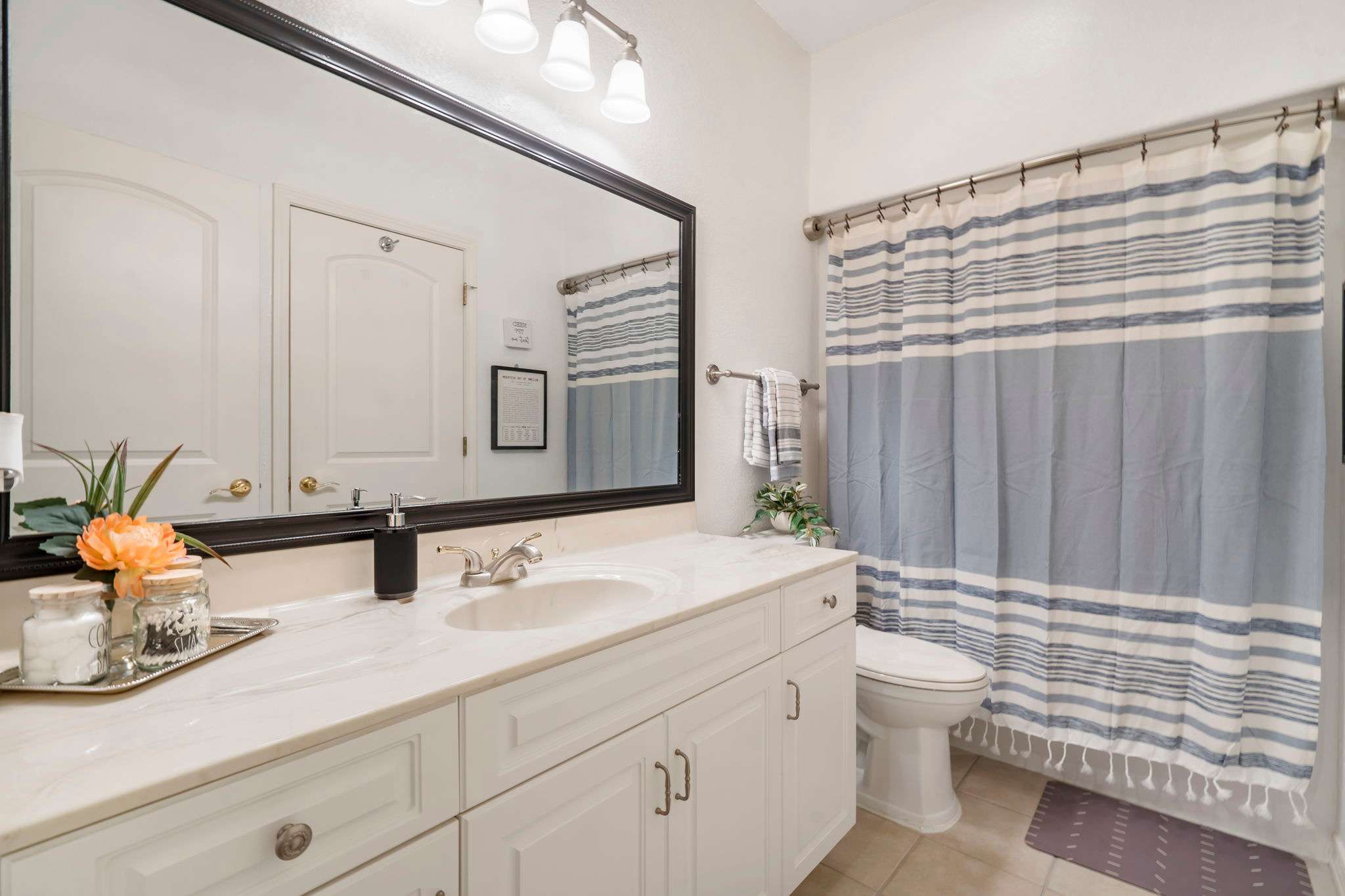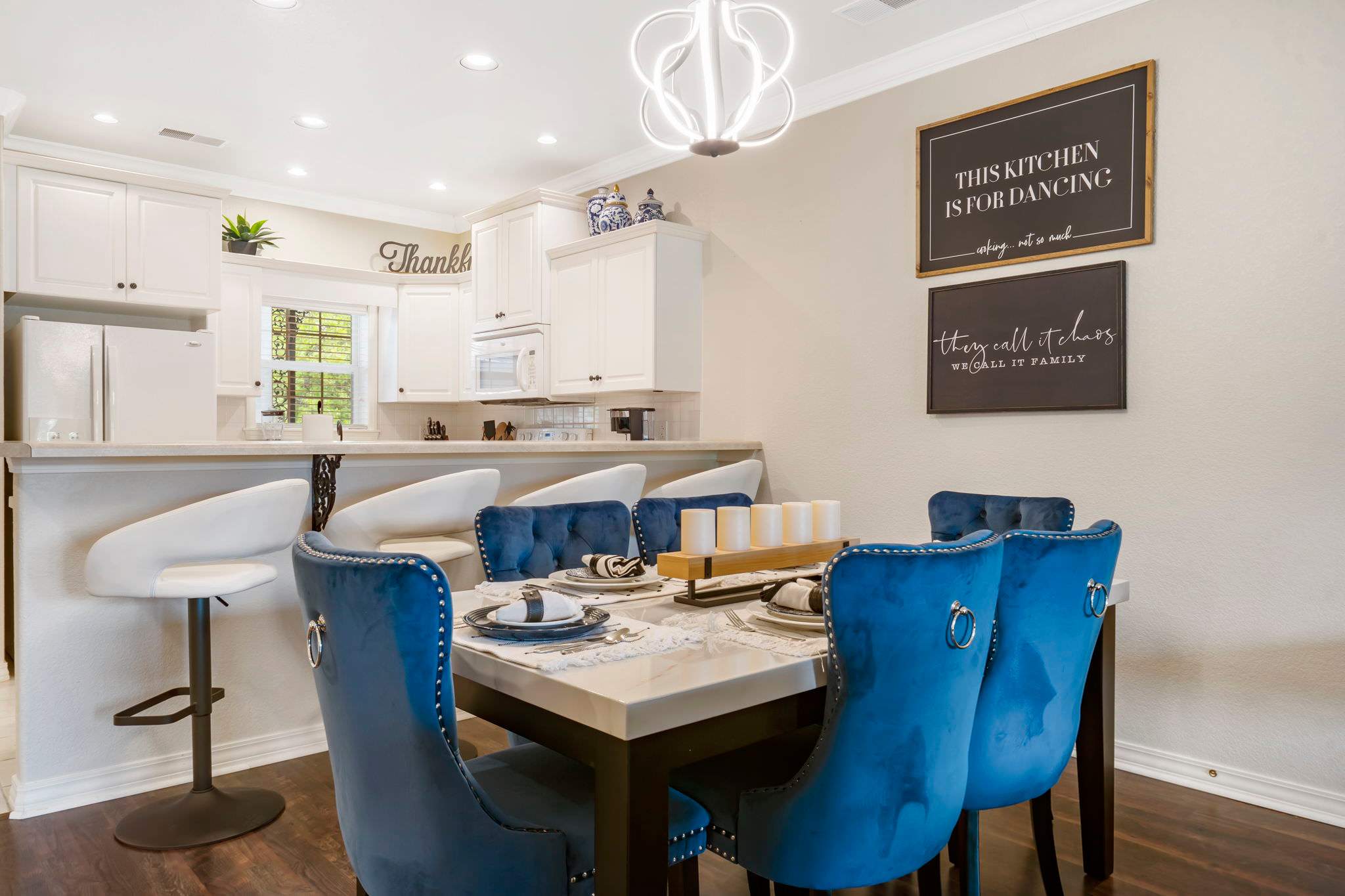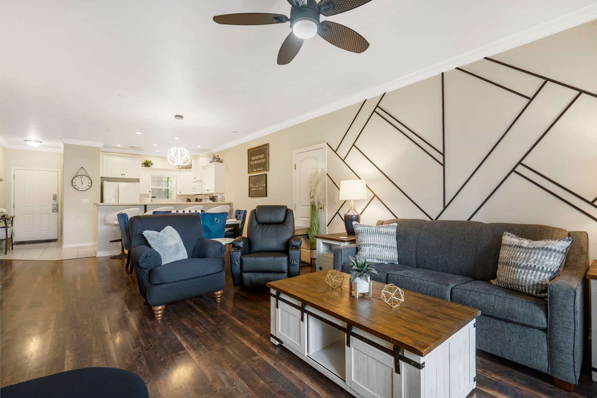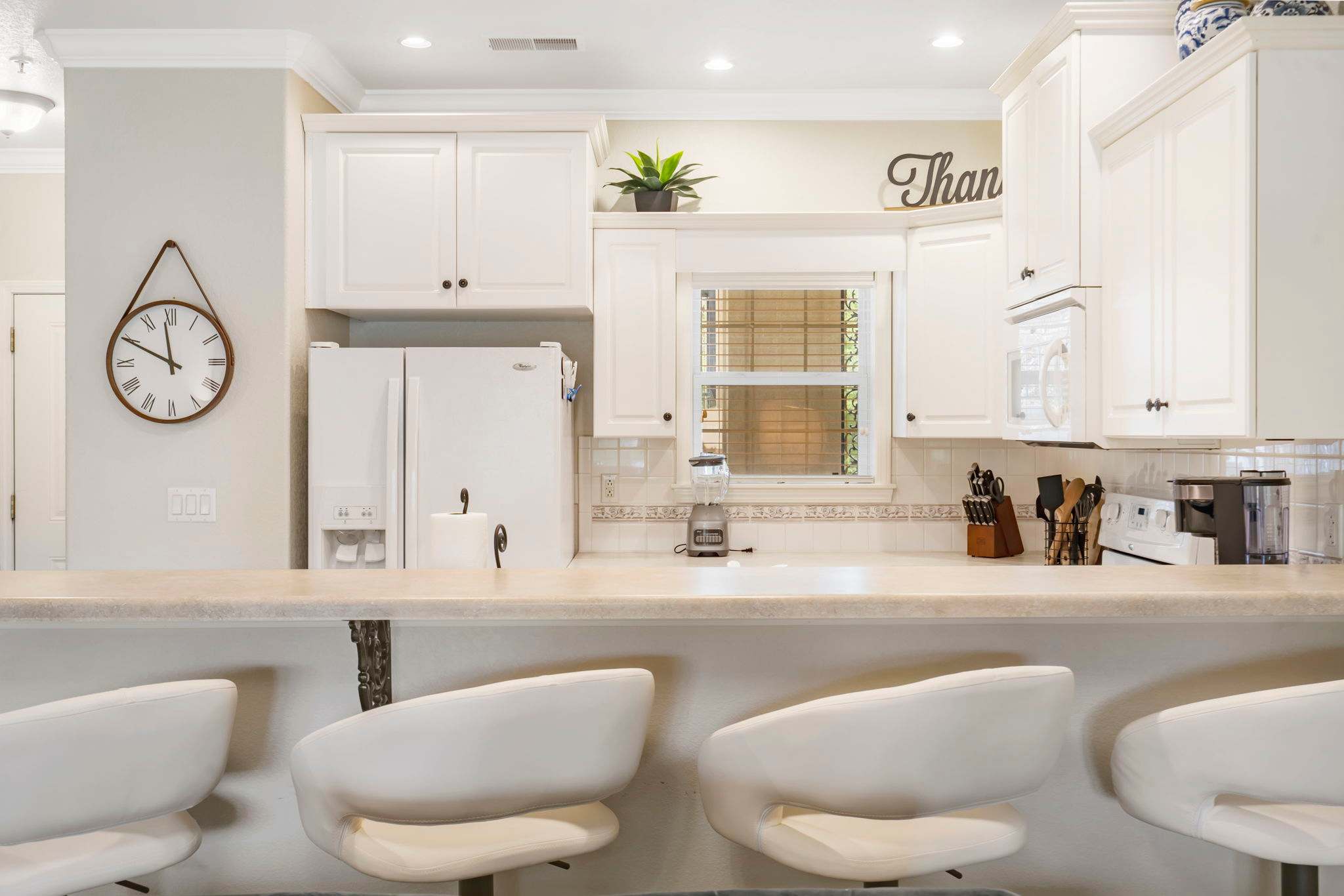 A modern kitchen with white appliances against white cabinets offers ample space and cookware for whipping up your favorite meal, with dining options of the kitchen island seating for 4 and a gorgeous dining room table with plush seating for 6. Two private bedrooms with attached bathrooms will allow you enough room for guests, but your own spaces to unwind when needed. A jetted tub in the master bathroom offers the ultimate luxurious relaxation experience.