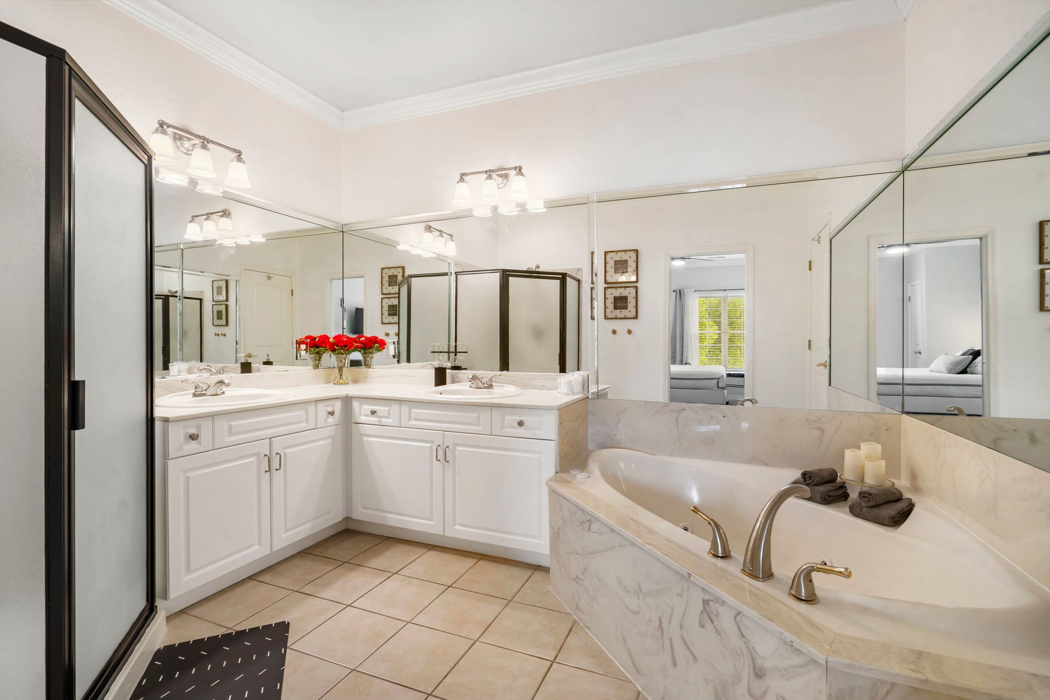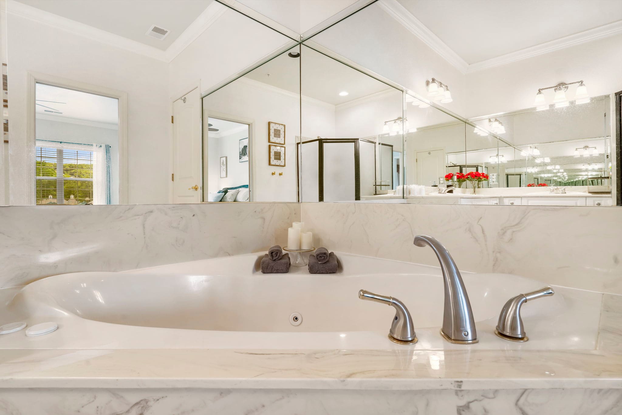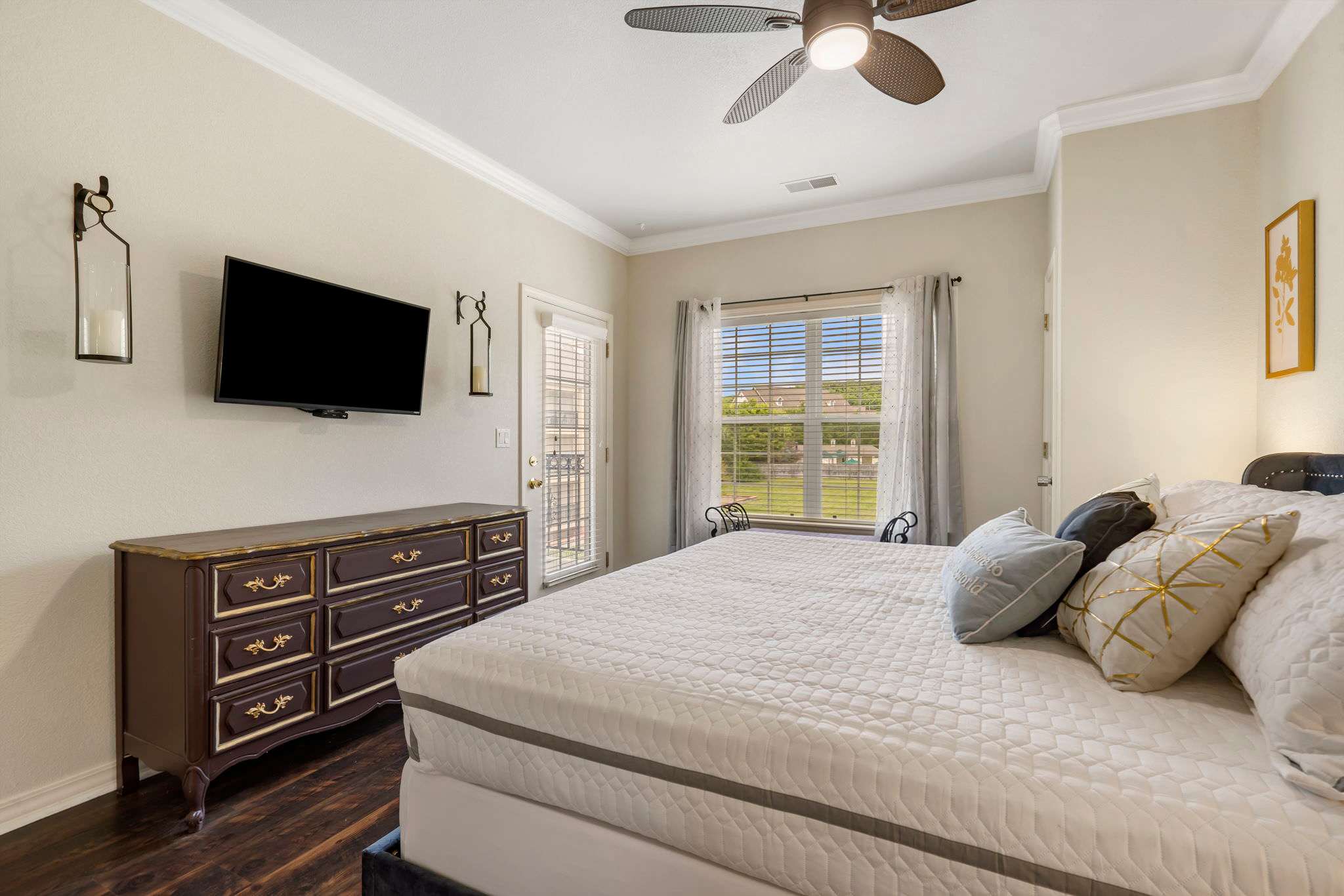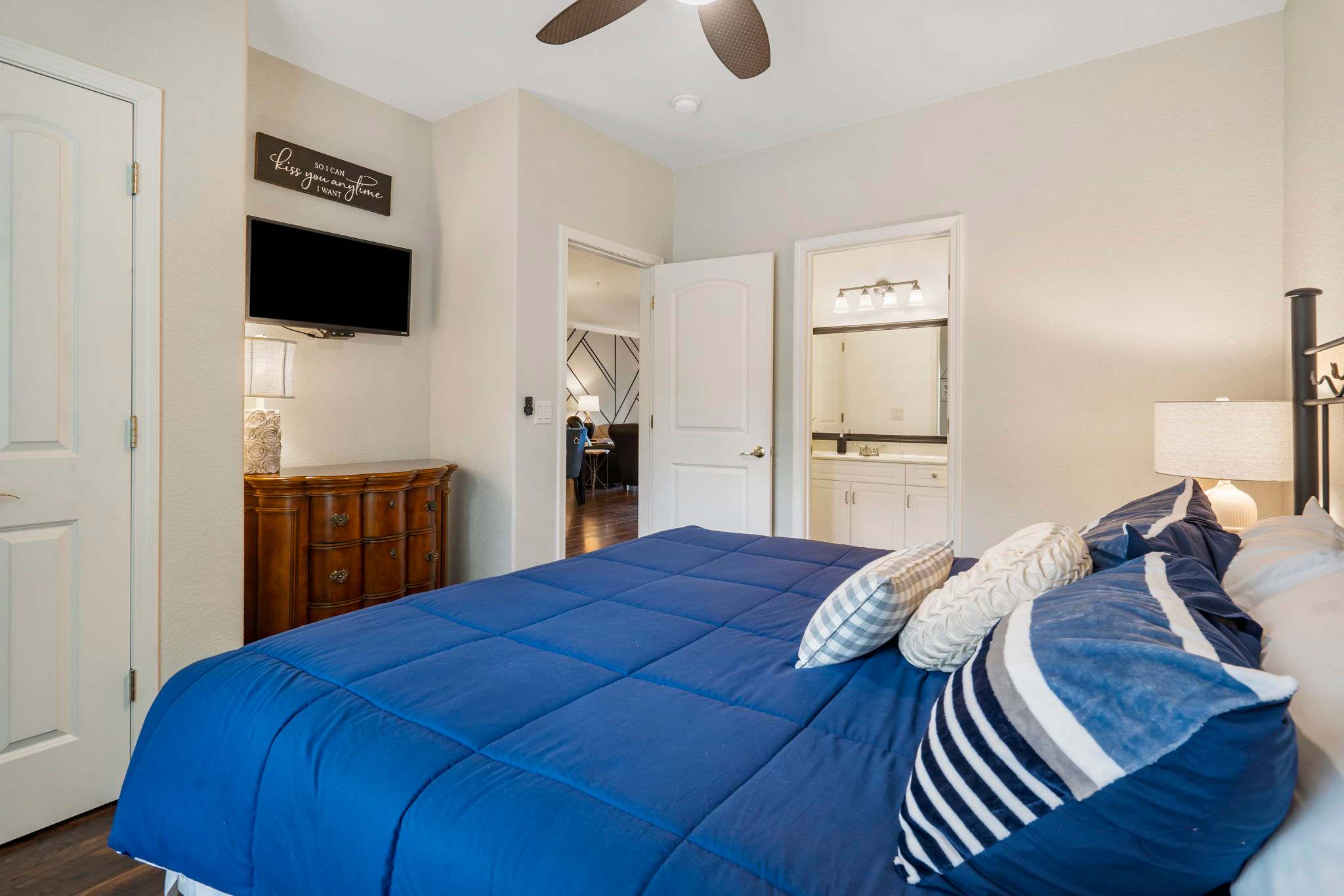 Bedroom #1 has a king size bed, tv, and ensuite bathroom with a double vanity, walk-in shower, and jetted tub. A set of sliding glass doors opens right onto the home’s balcony.