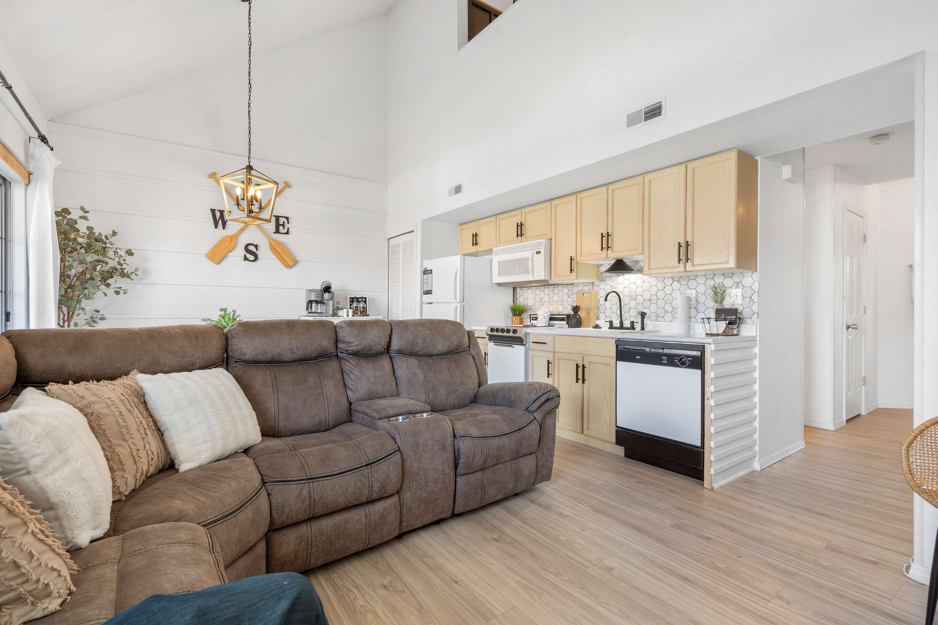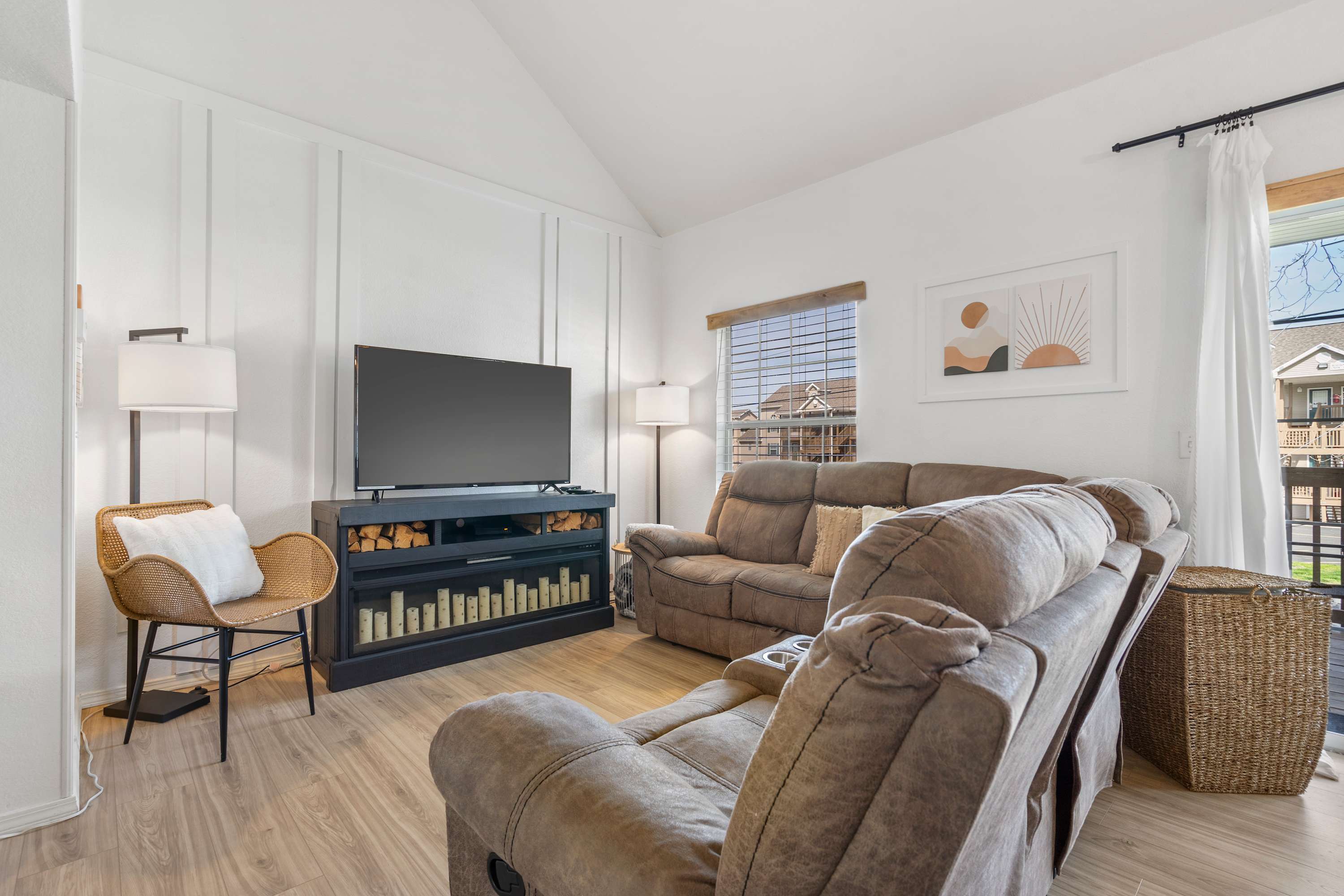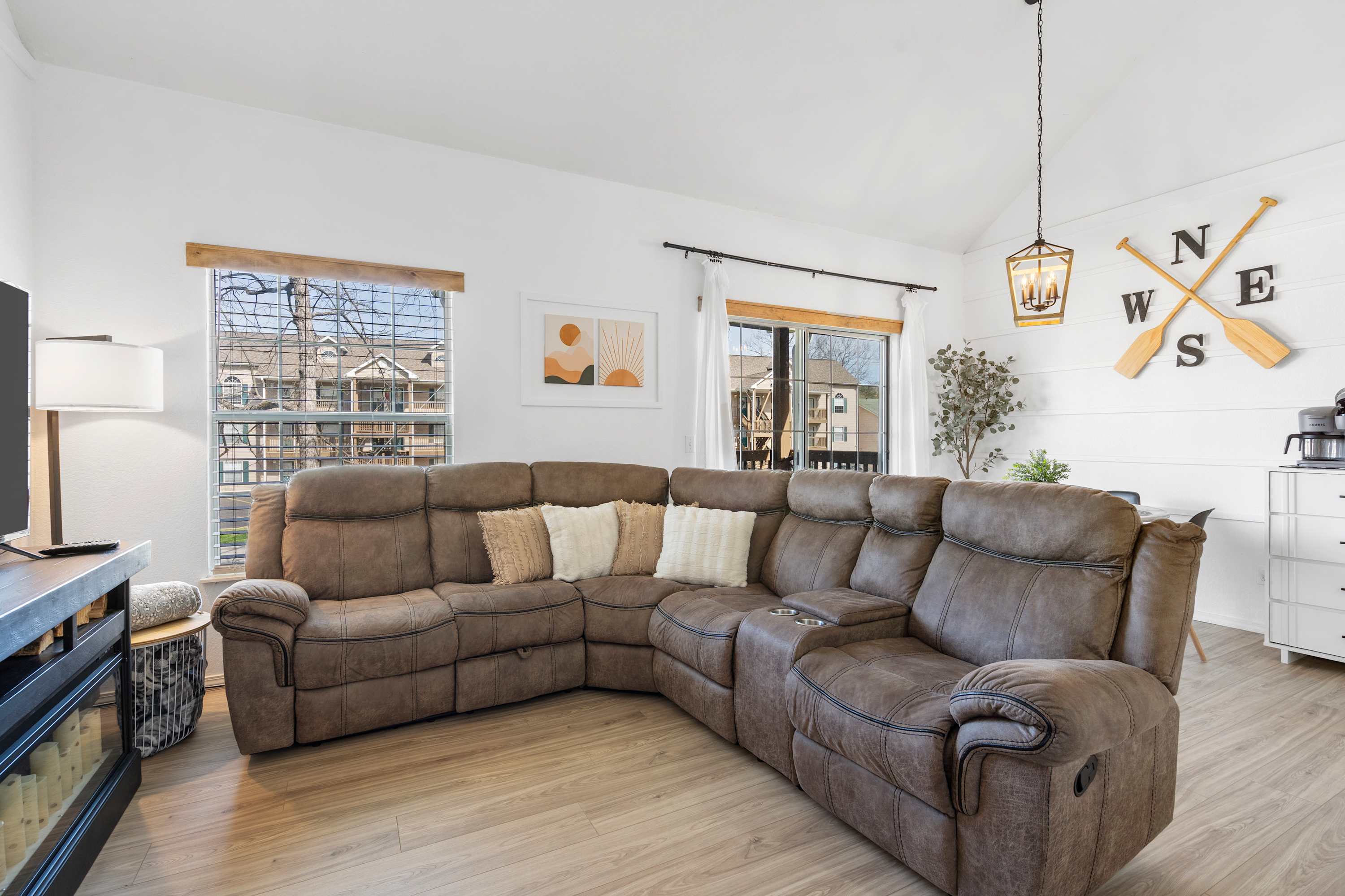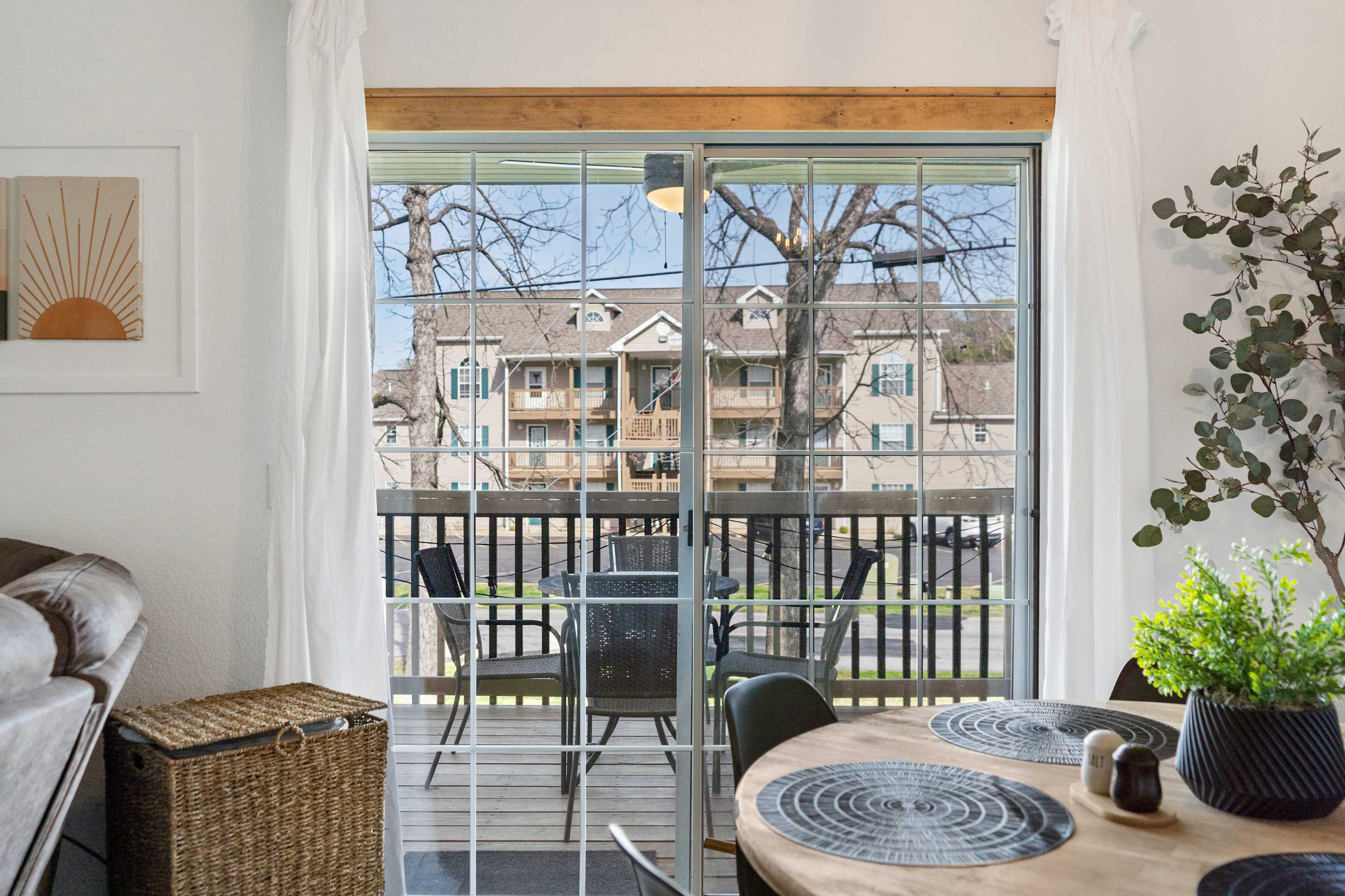 Enjoy quality time with your family and friends in the home, which offers a spacious open concept living area. Cozy up on the sectional sofa while watching movies on the smart TV. Steps away, use the fully equipped kitchen to prepare delicious drinks and meals for lively dinner parties, or casual bites to enjoy at your leisure! You have two dining spaces to share memorable meals: one inside at the table set for 4, and the other, another table set for 4 on the balcony where you can dine in the fresh Ozark air.