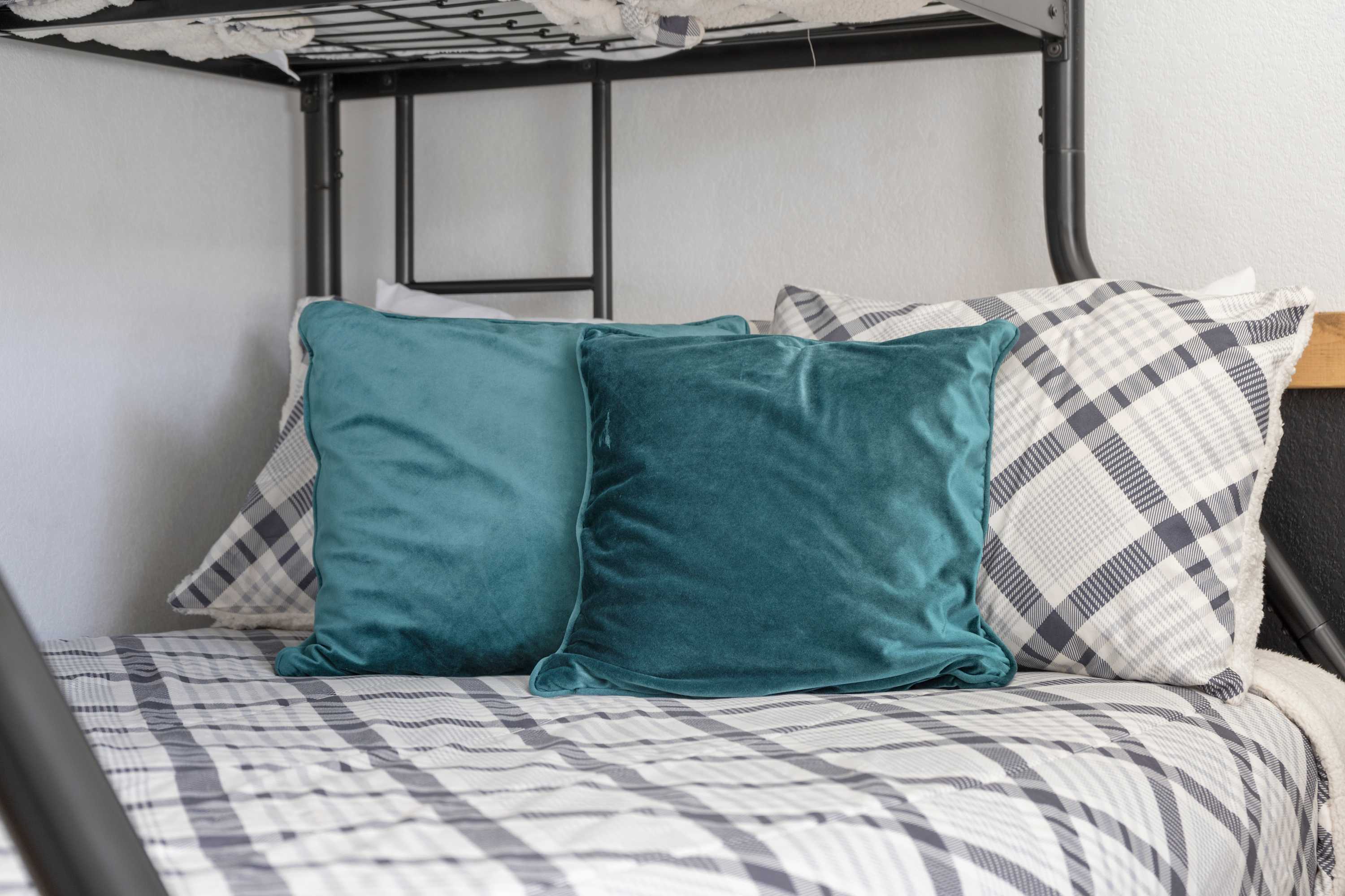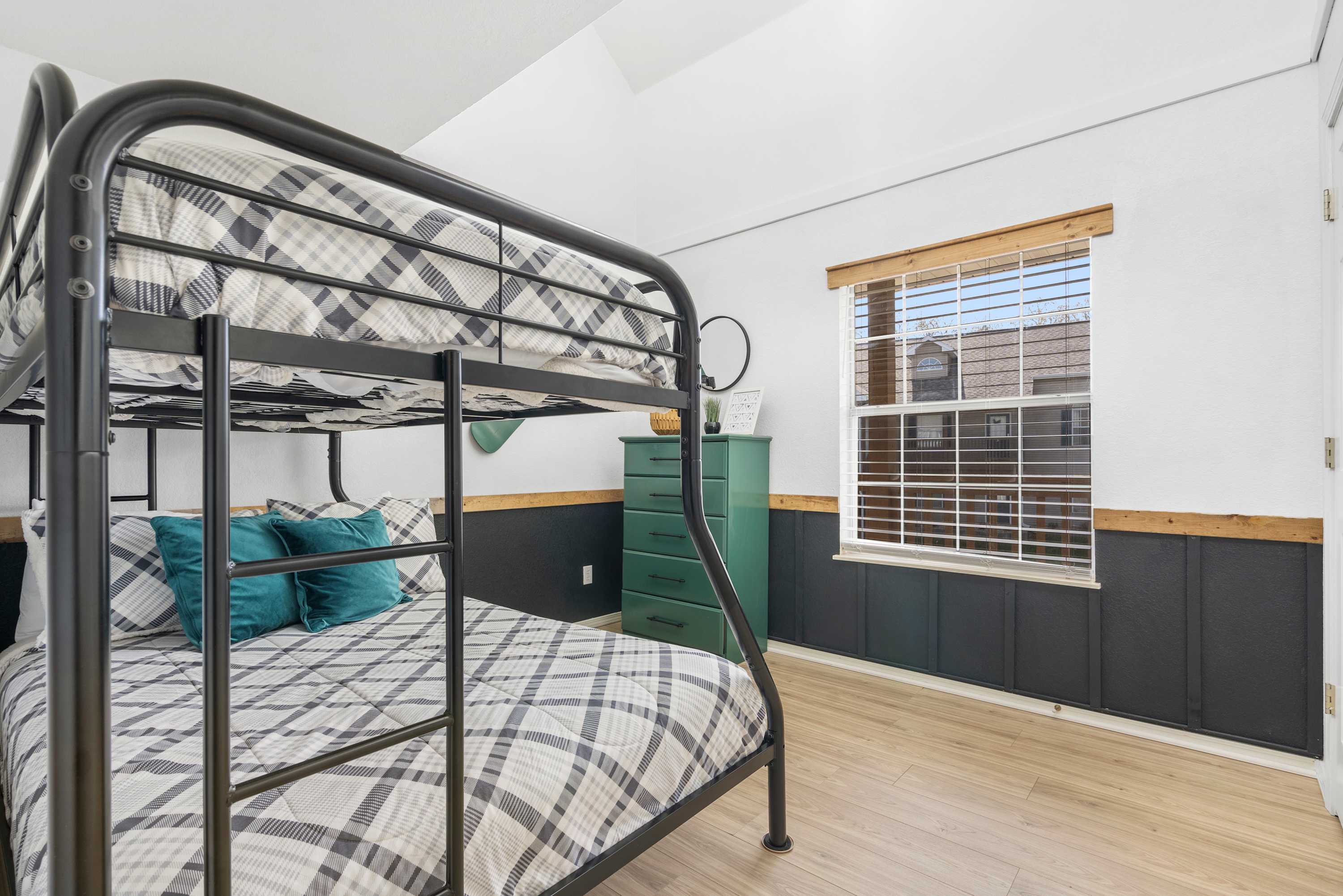 - Bedroom #1 has a set of bunk beds with a full size bed on bottom and twin size bed on top. This room has Jack and Jill access to a full bathroom with dual sinks and shower/tub combo.