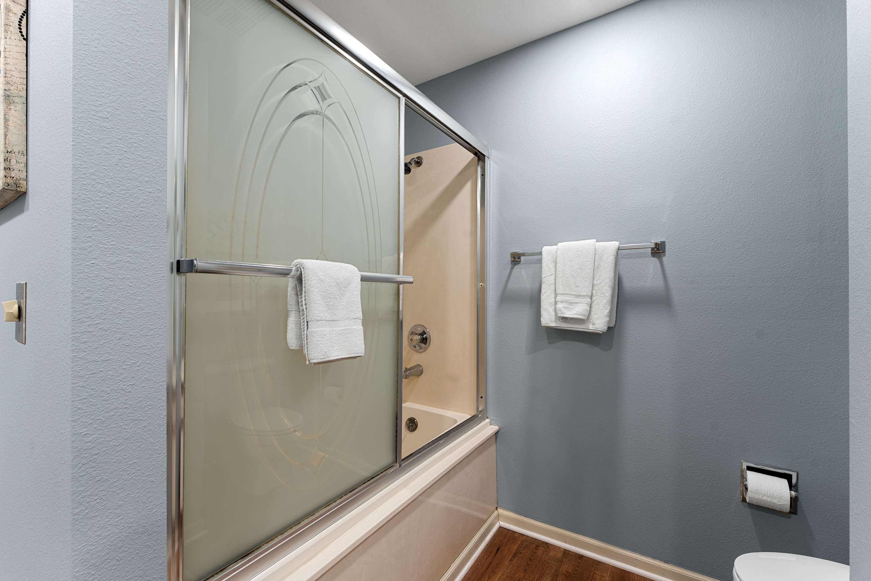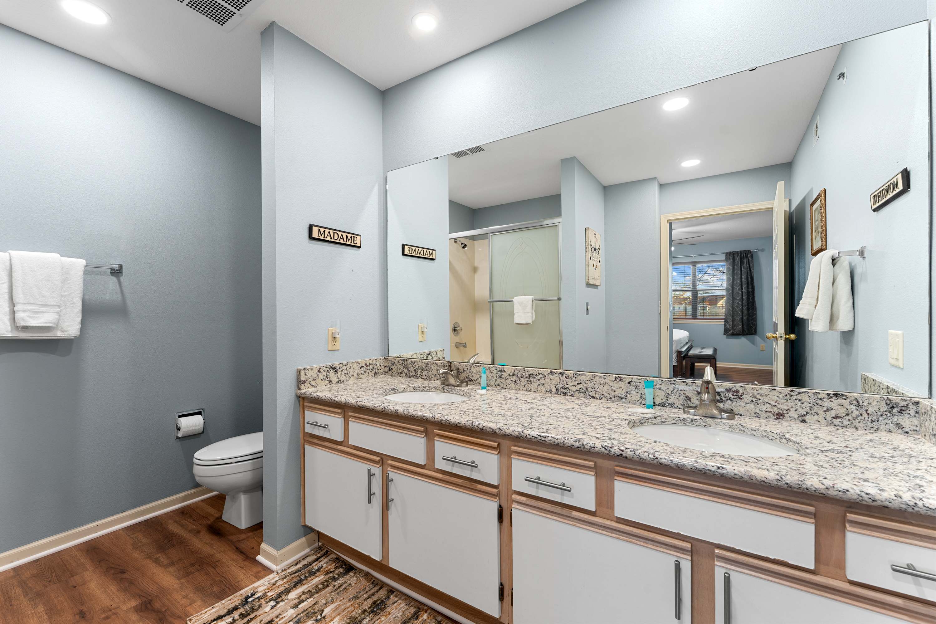 - Bedroom #2 is the primary suite with a king size bed, tv, deck access, and ensuite bathroom with dual sinks and shower/tub combo.