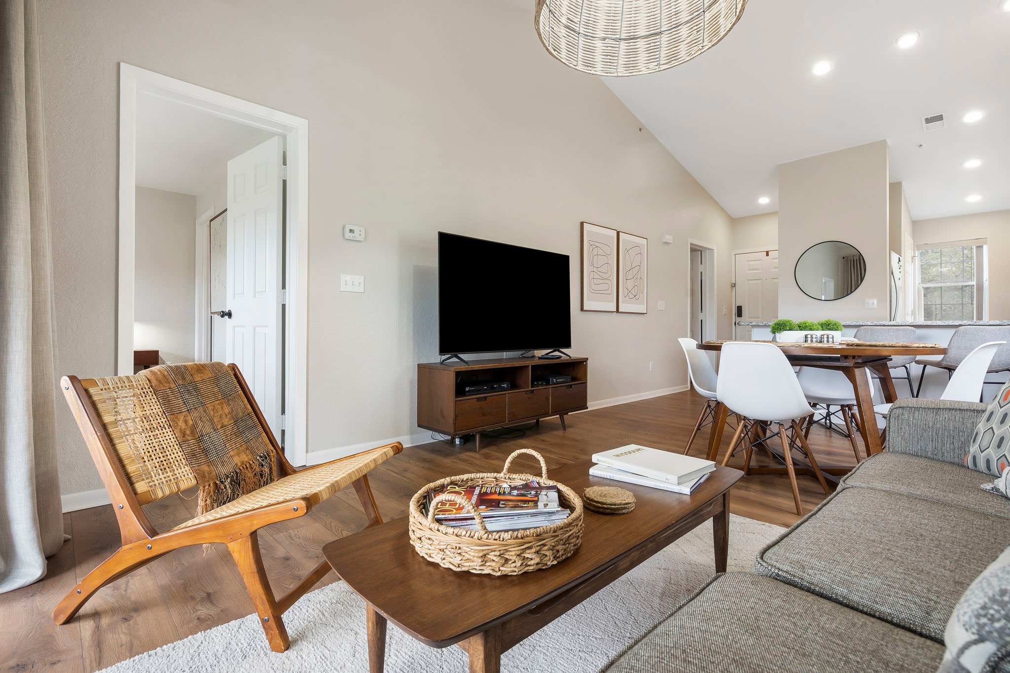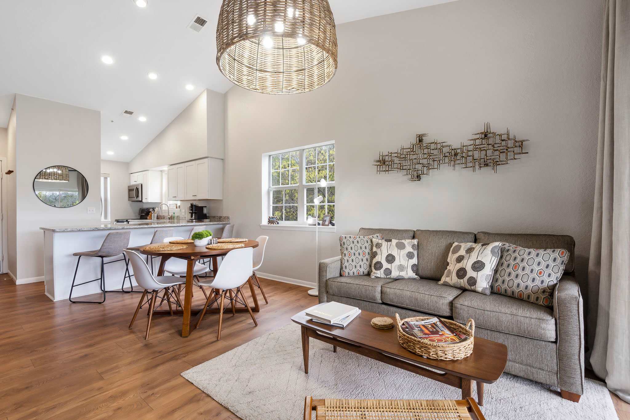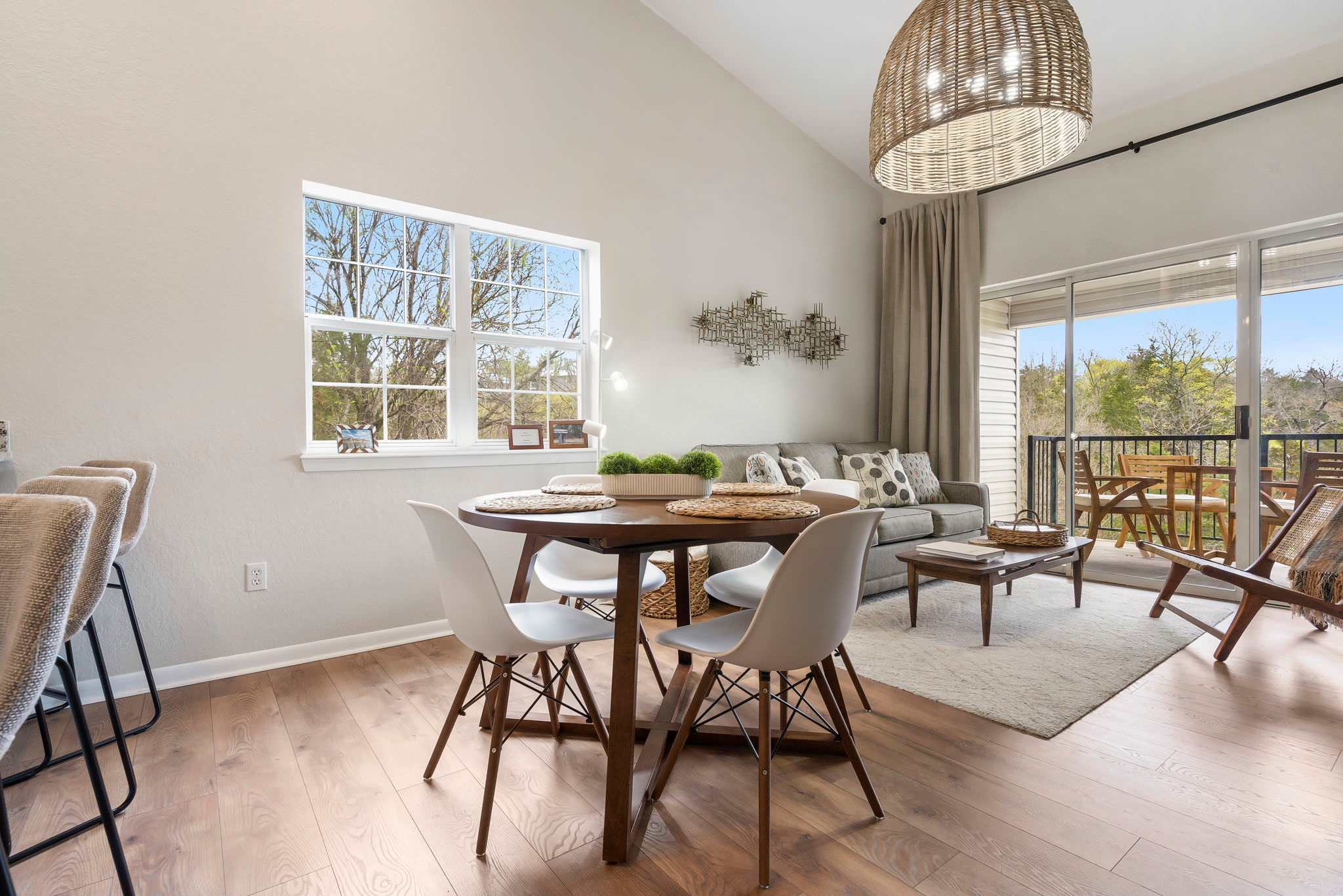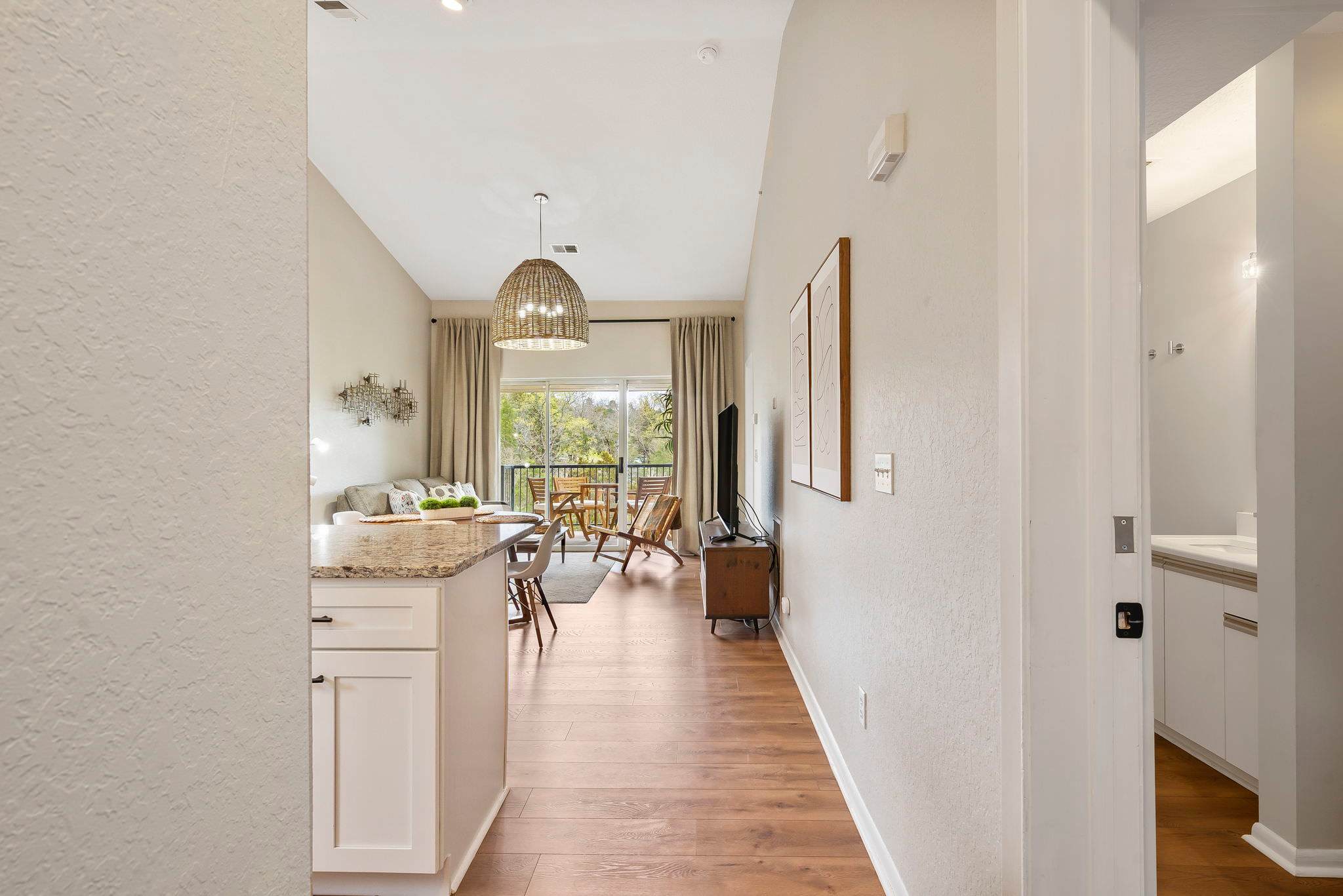 As you step into your tranquil retreat, you’re welcomed by a bright living room adorned with plush seating and a smart TV, the perfect spot for those lazy movie nights. And for the foodies, your kitchen is fully equipped with stainless steel appliances and ample cookware to whip up your favorite cuisines. Whether you feel like dining indoors at the table set for 4 or out on your balcony, you have ample space to enjoy quality time over delicious meals. Additional barstool seating is provided along the kitchen counter.