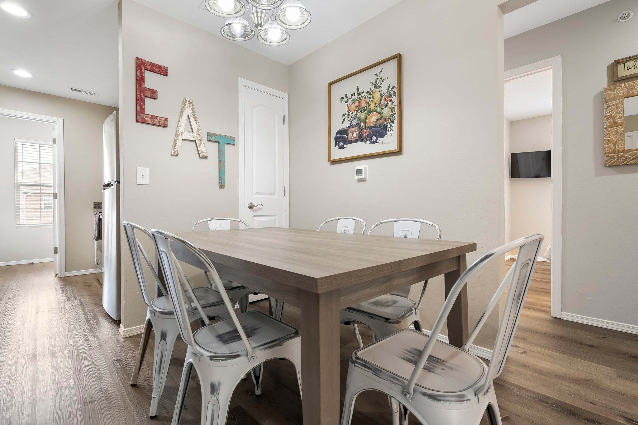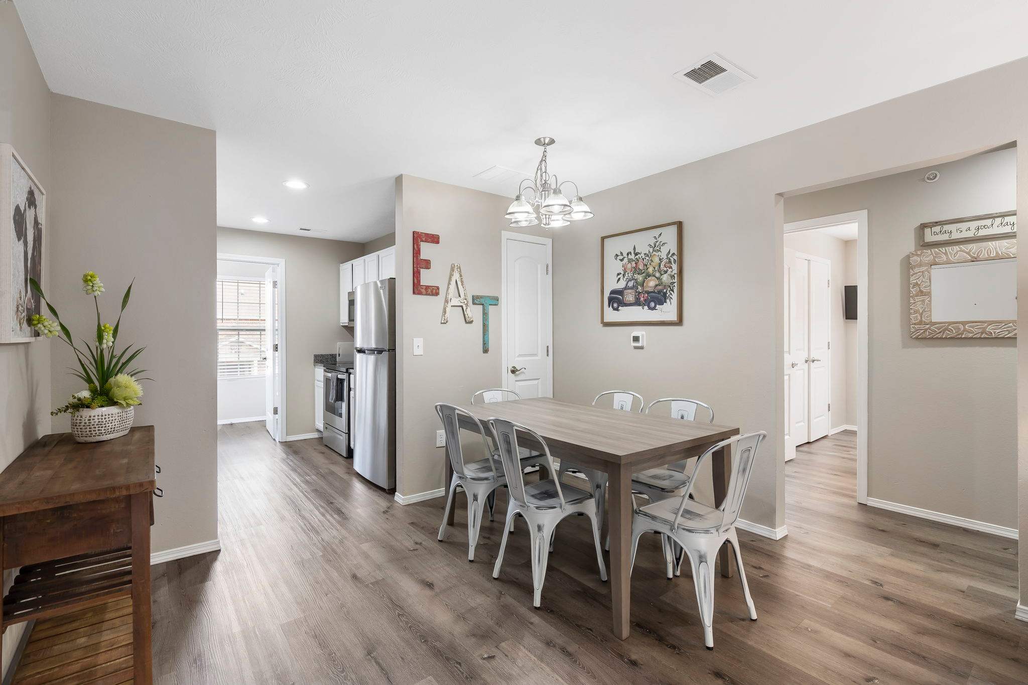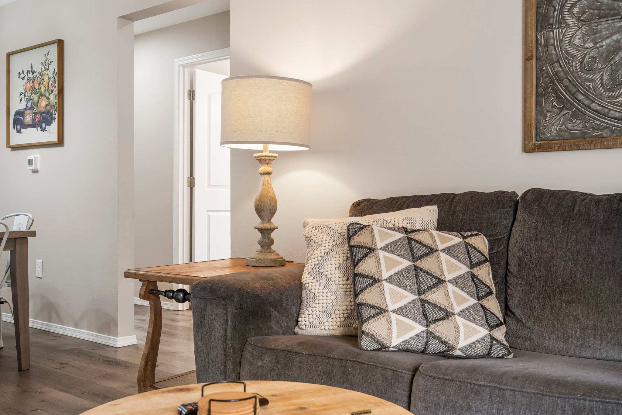 The cozy living room is furnished to feel like your home away from home with plush couches and a smart tv. Your indoor leisure time is sure to be a peaceful retreat here, plus just steps away you have convenient access to the fully updated and equipped kitchen. From stainless steel appliances to cookware and coffee maker, you’ll have everything you need to whip up meals for your group to share at the dining table set for 6.
