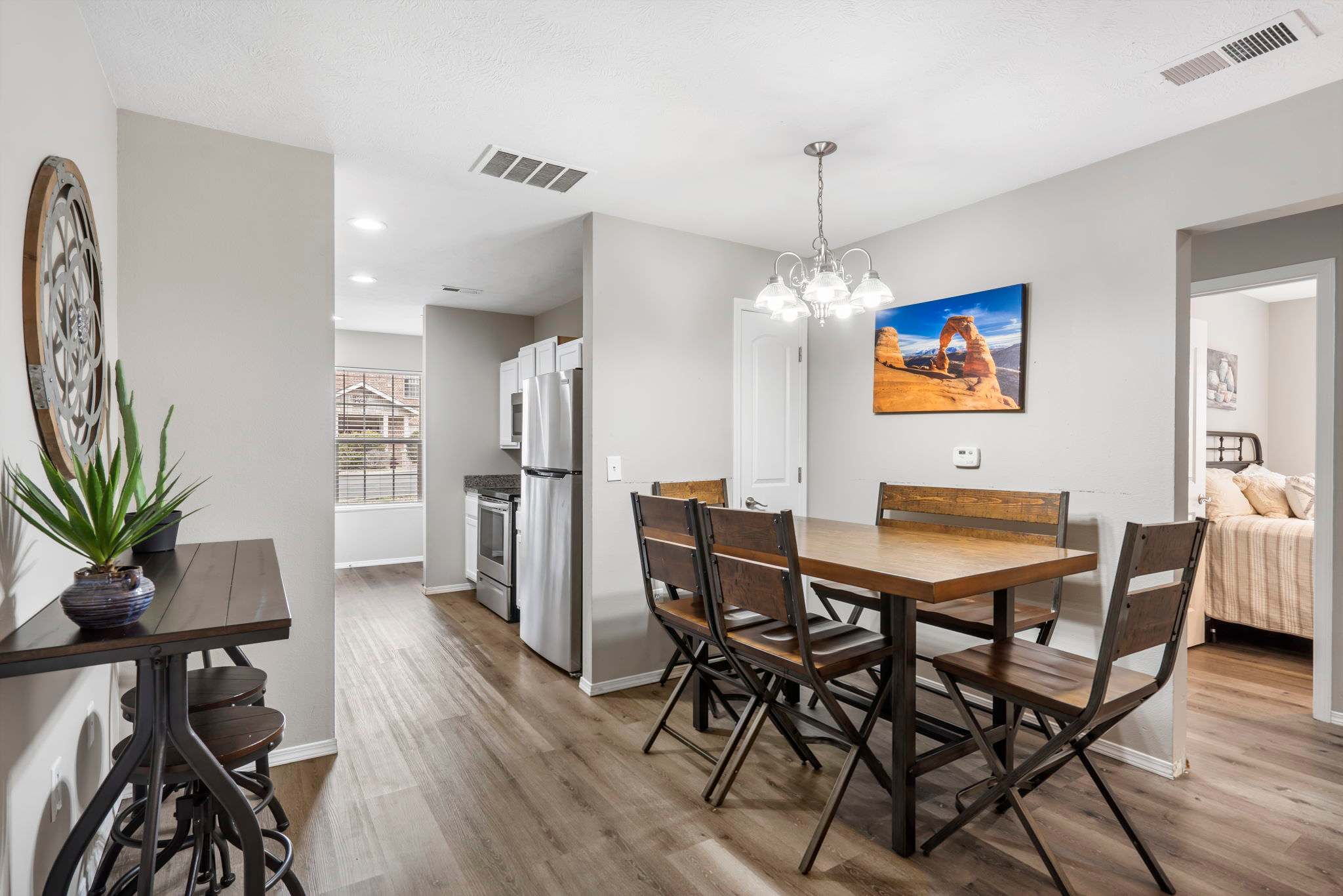 The cozy living room is furnished to feel like your home away from home with plush couches and a smart tv. Your indoor leisure time is sure to be a peaceful retreat here, plus just steps away you have convenient access to the fully updated and equipped kitchen. From stainless steel appliances to cookware and coffee maker, you’ll have everything you need to whip up meals for your group to share at the dining table set for 6.