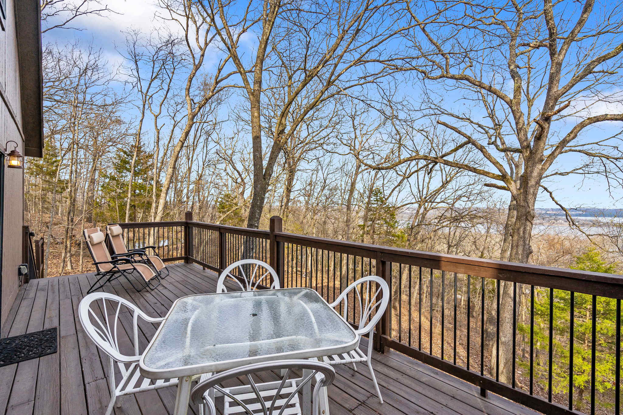 Located on a wooded bluff overlooking the water, Windjammer Cottage boasts an ideal location where guests can enjoy the beauty of secluded nature, while being close enough to experience all the shows, dining, and attractions of Branson. The home features a spacious deck overlooking the lake with an outdoor dining space and lounge chairs.