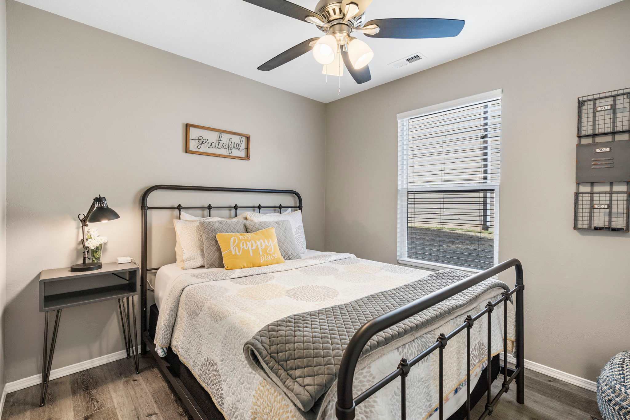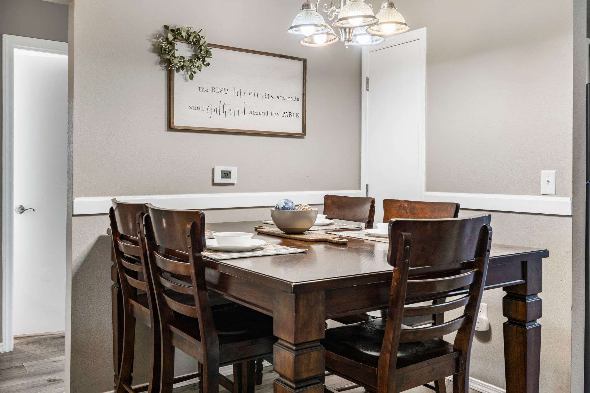 The cozy living room is furnished to feel like your home away from home with plush couches, smart tv, and an electric fireplace. Enjoy some indoor leisure time here, as well as at the formal dining table set for 6. Here guests can share delicious homecooked meals from the fully equipped kitchen, complete with stainless steel appliances, coffee bar, and cookware.