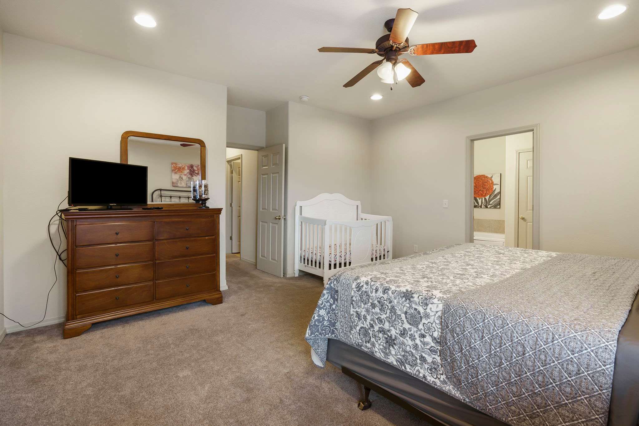 Bedroom #2 has a king size bed, tv, patio access, and ensuite bathroom with soaking tub and walk-in shower. There is also a baby crib provided in this room.