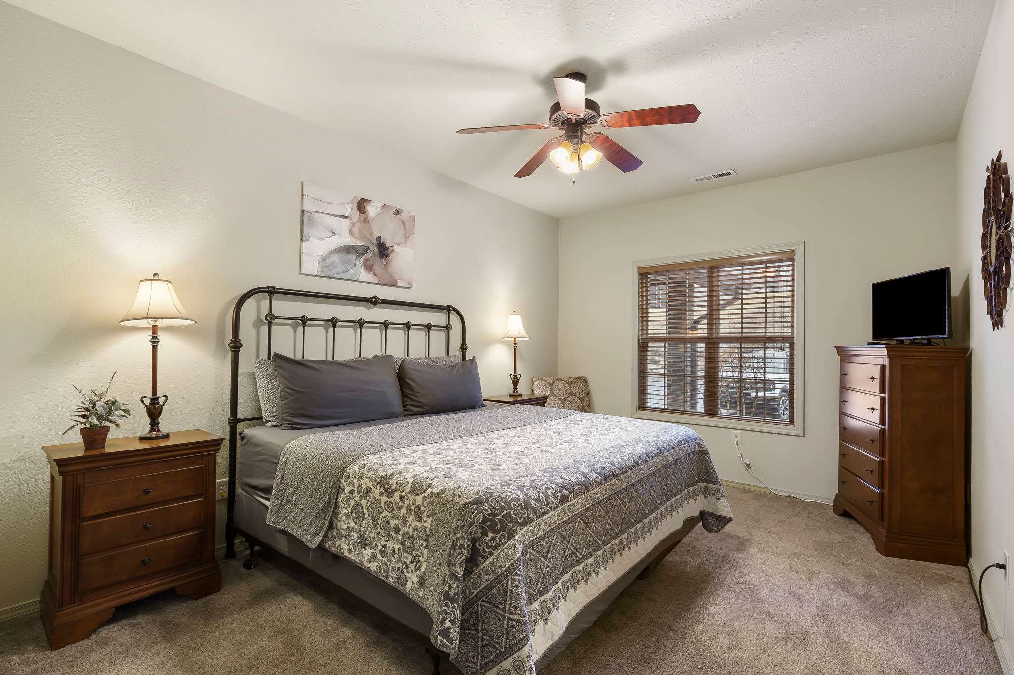 Bedroom #1 has a king size bed, tv, and ensuite bathroom with shower/tub combo.