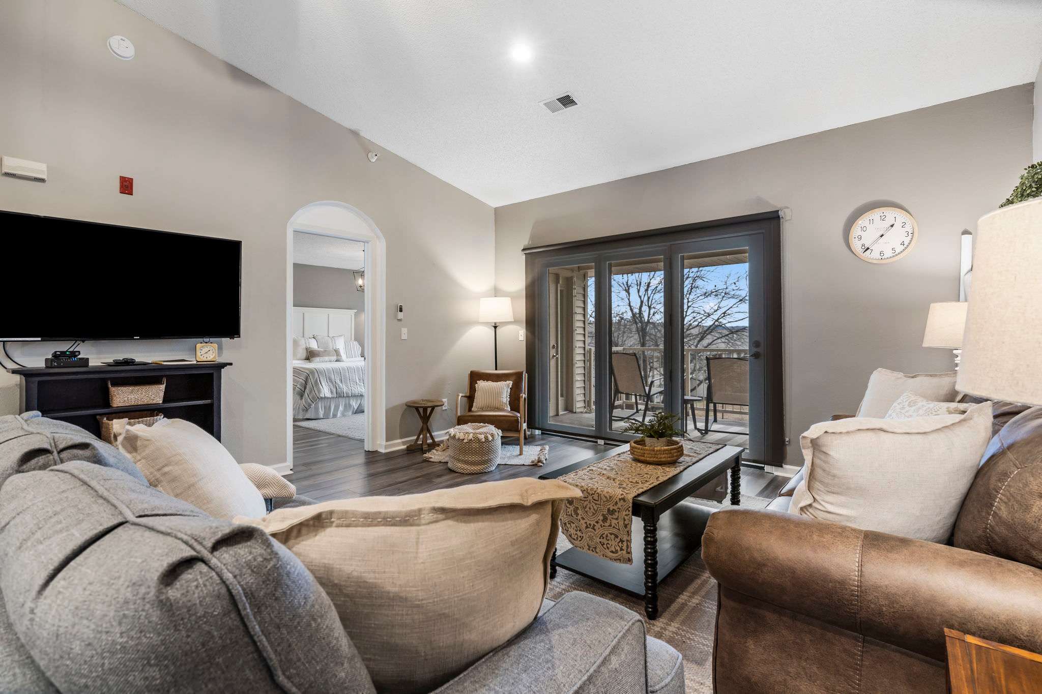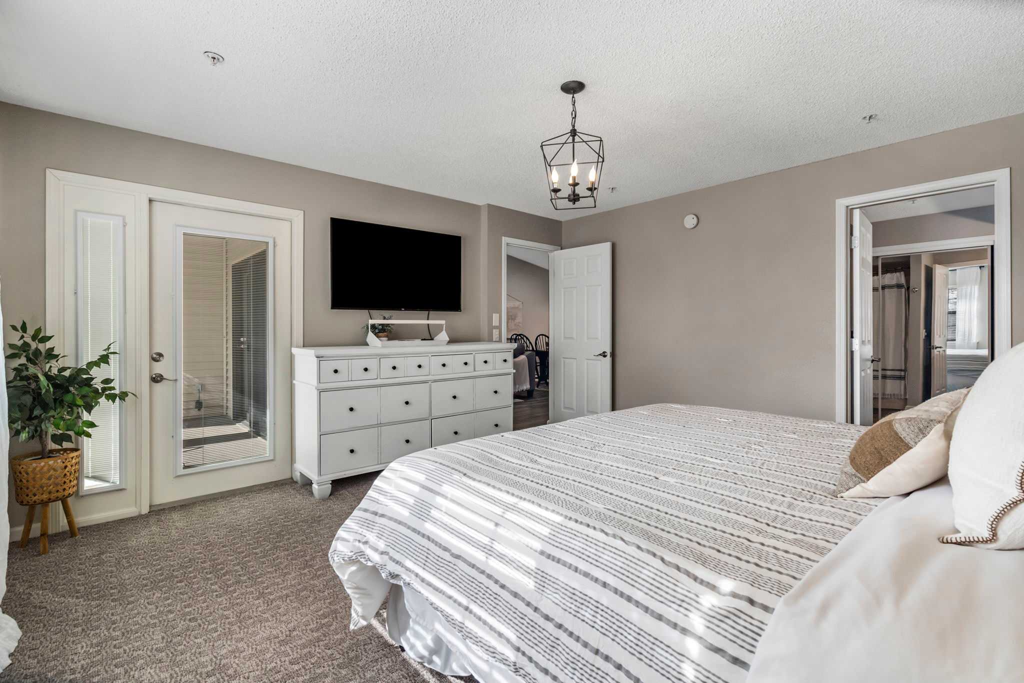 Bedroom #2 features a king-size bed, smart TV, patio access, and an ensuite bathroom with a shower/tub combo.