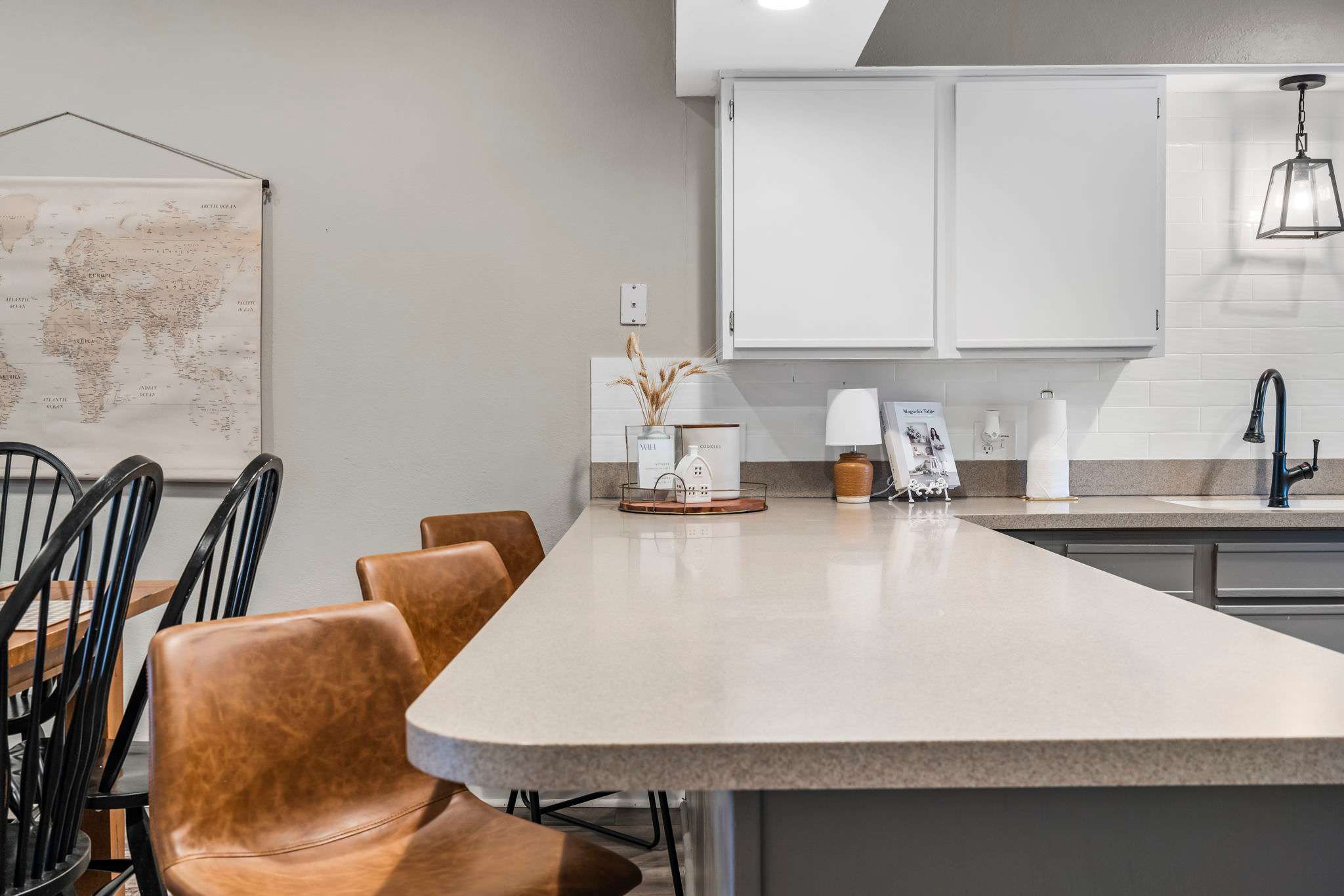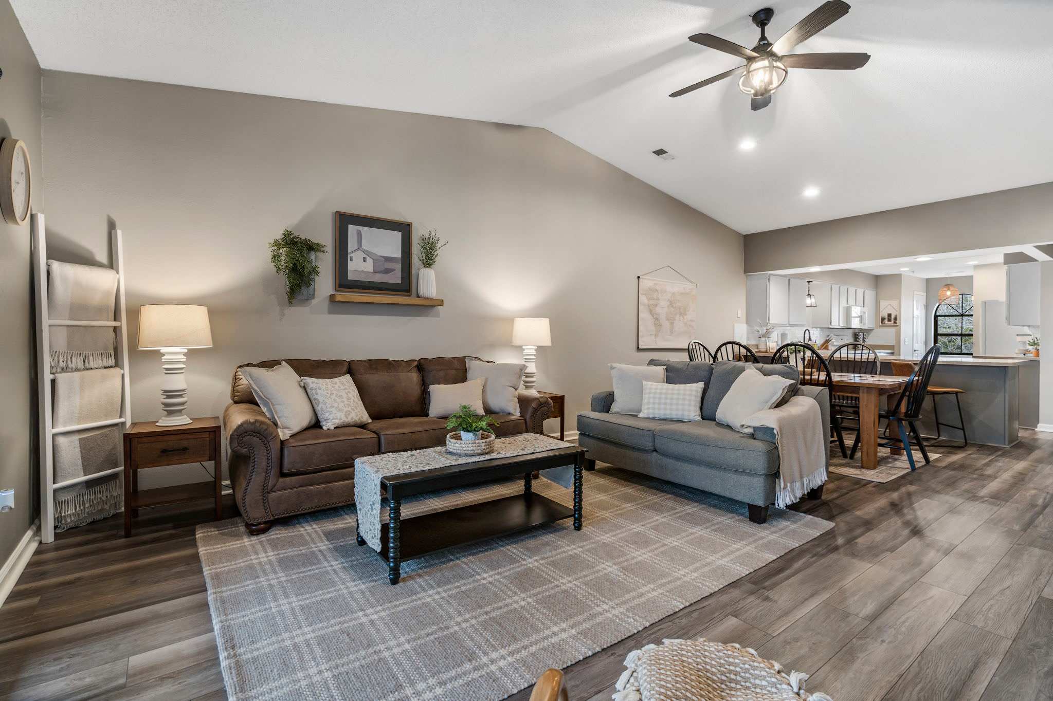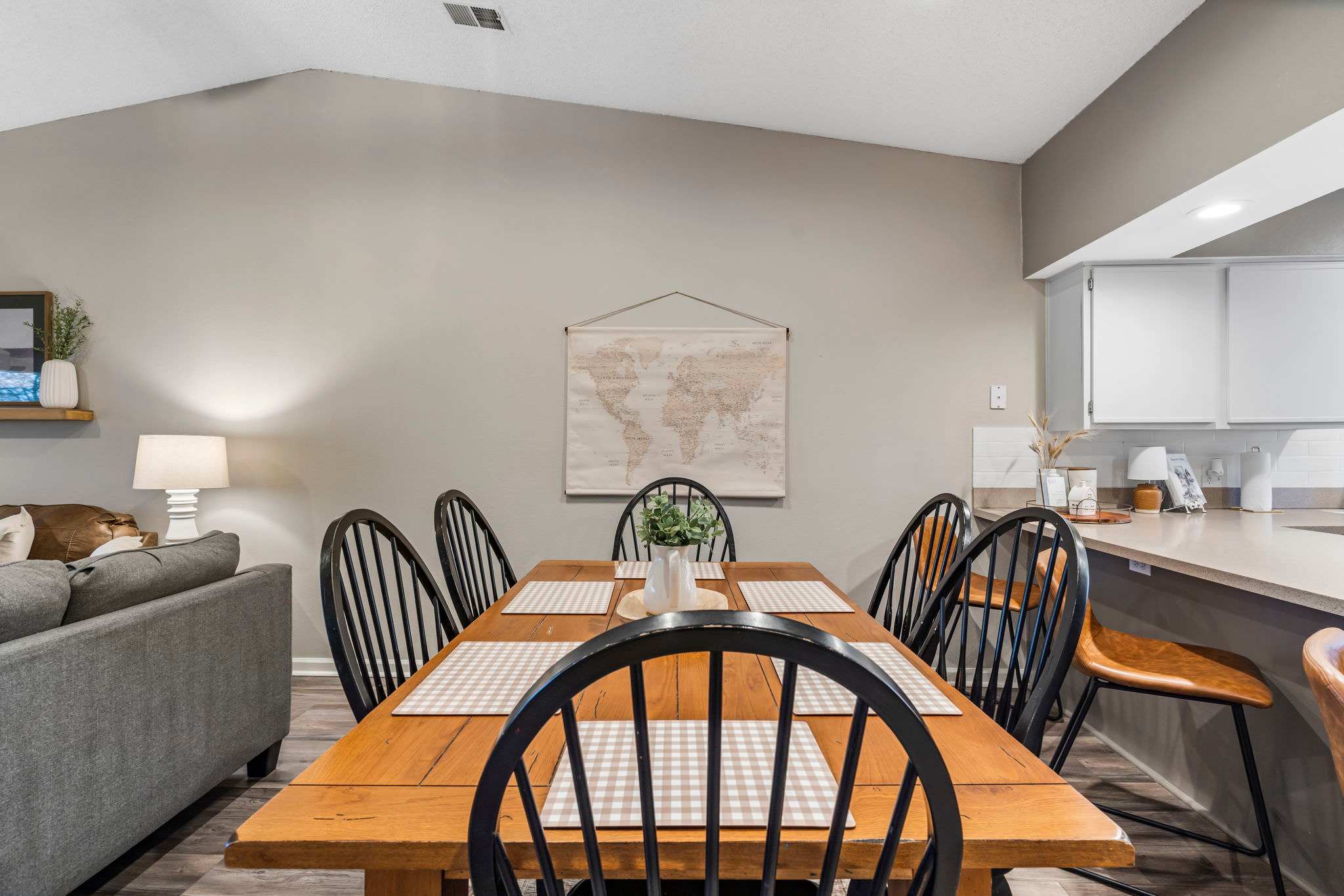 The inviting living room is perfect for movie nights, a good book, or catching up with friends and family. The fully equipped kitchen has everything needed for home-cooked meals, with barstool seating for casual dining and a dining table set for six for more formal gatherings.