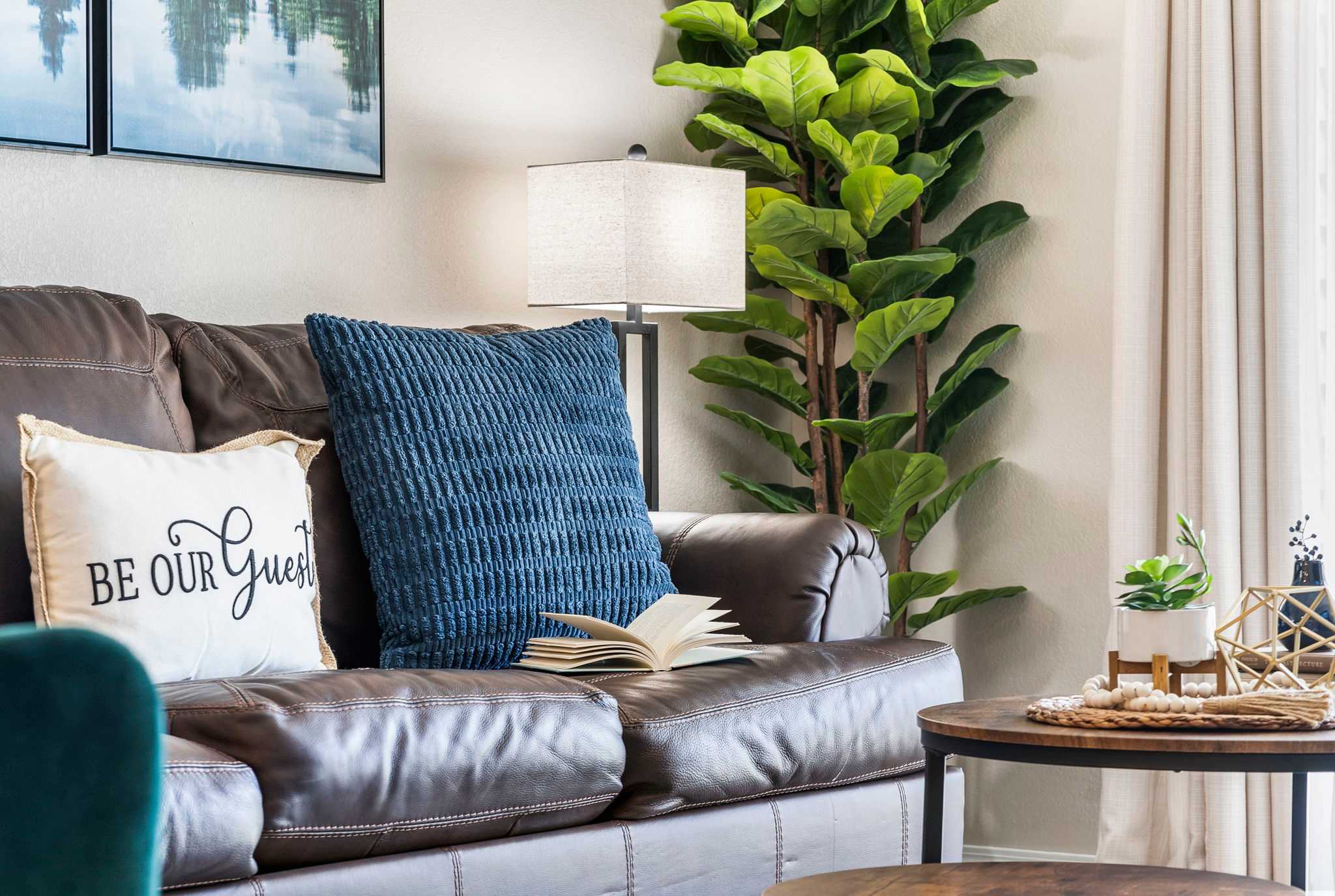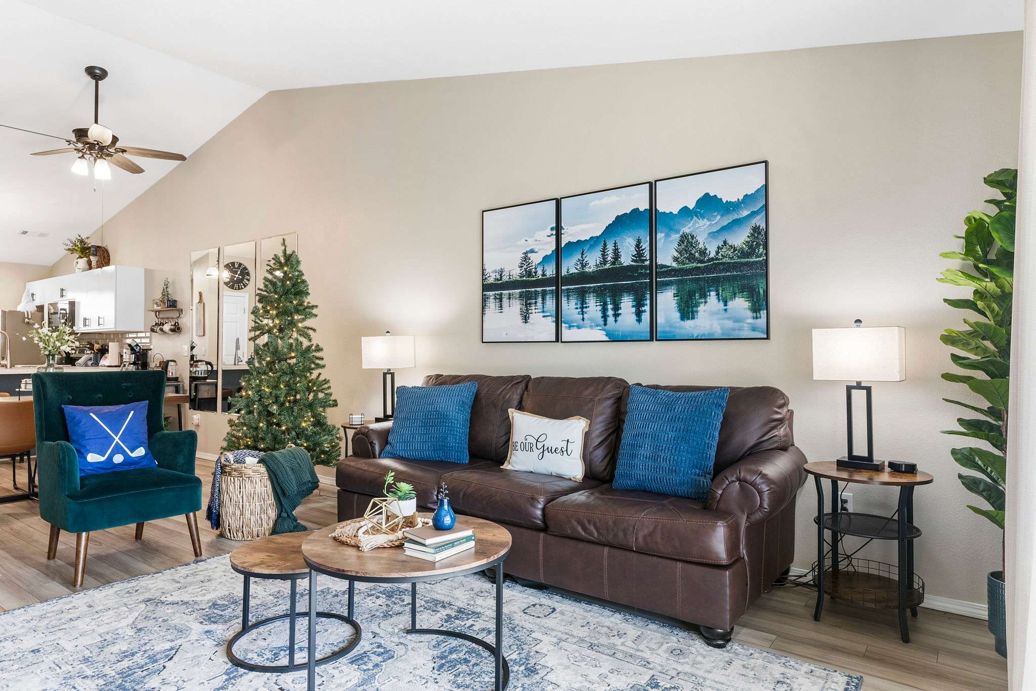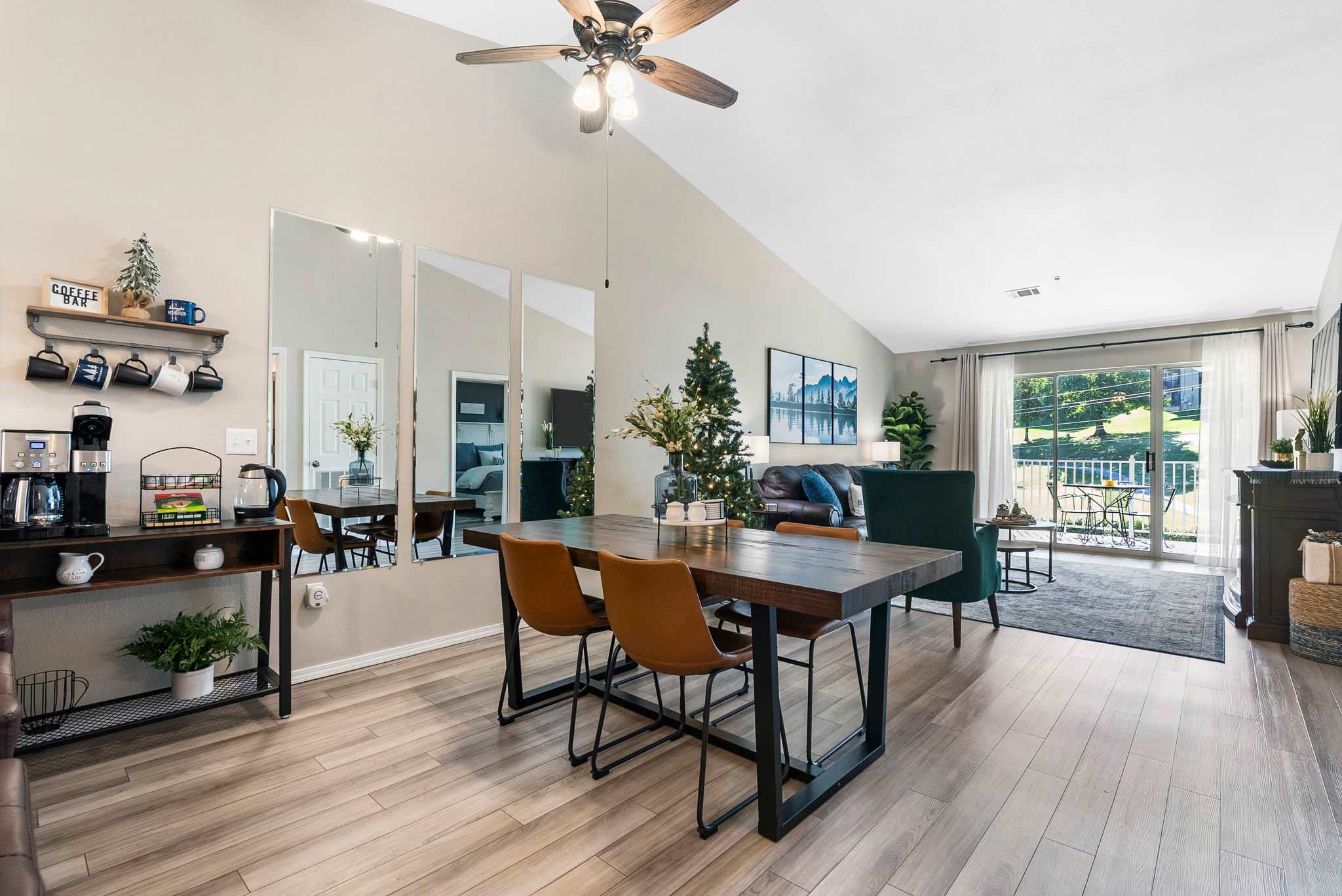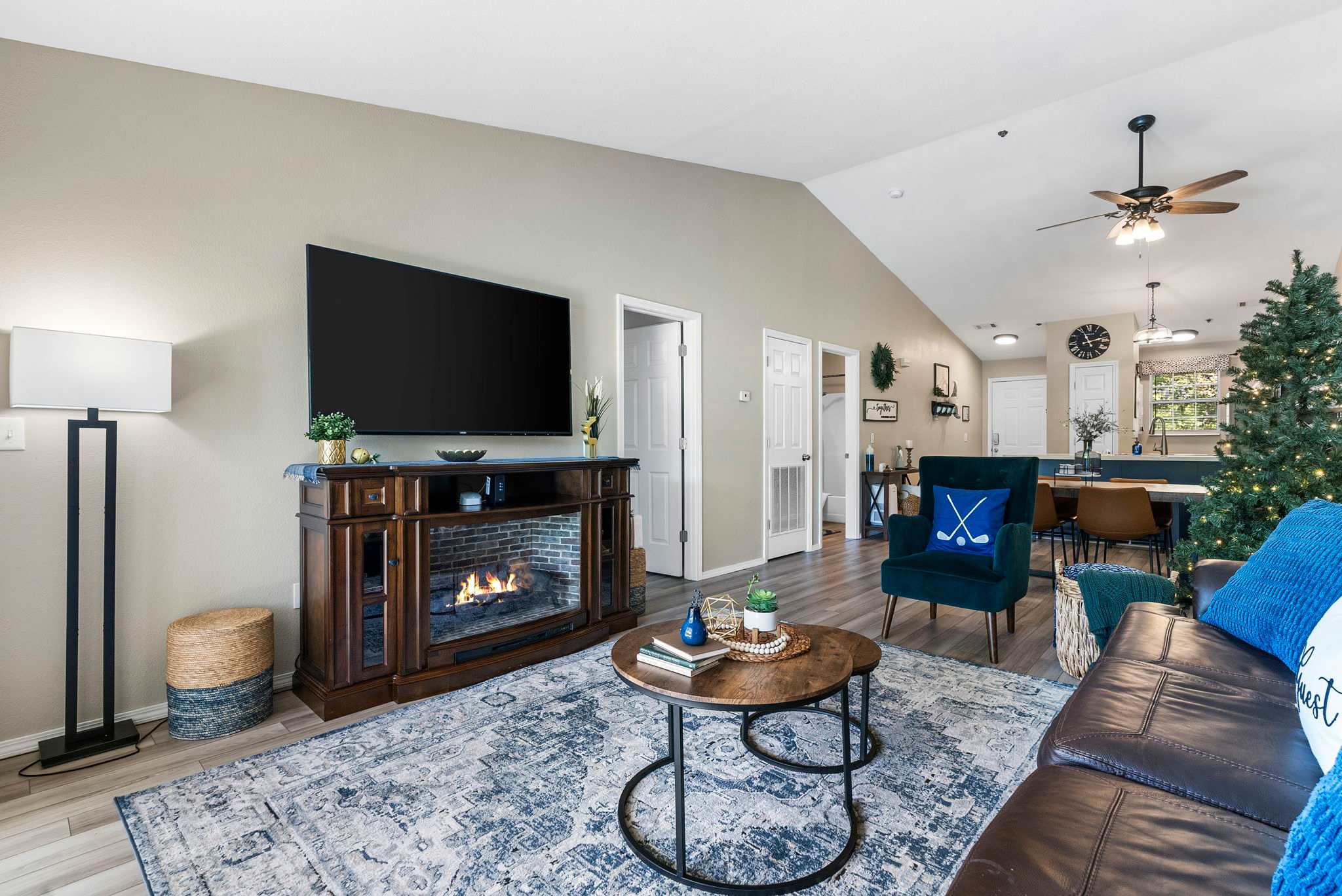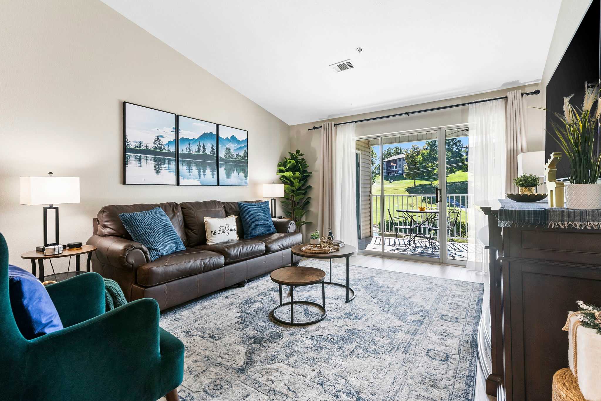 GREAT ROOM: Large, open living space with a 65” smart TV w/ cable, electric fireplace, large dining table, sleeper sofa, and comfortable covered patio with golf course and waterfront views.