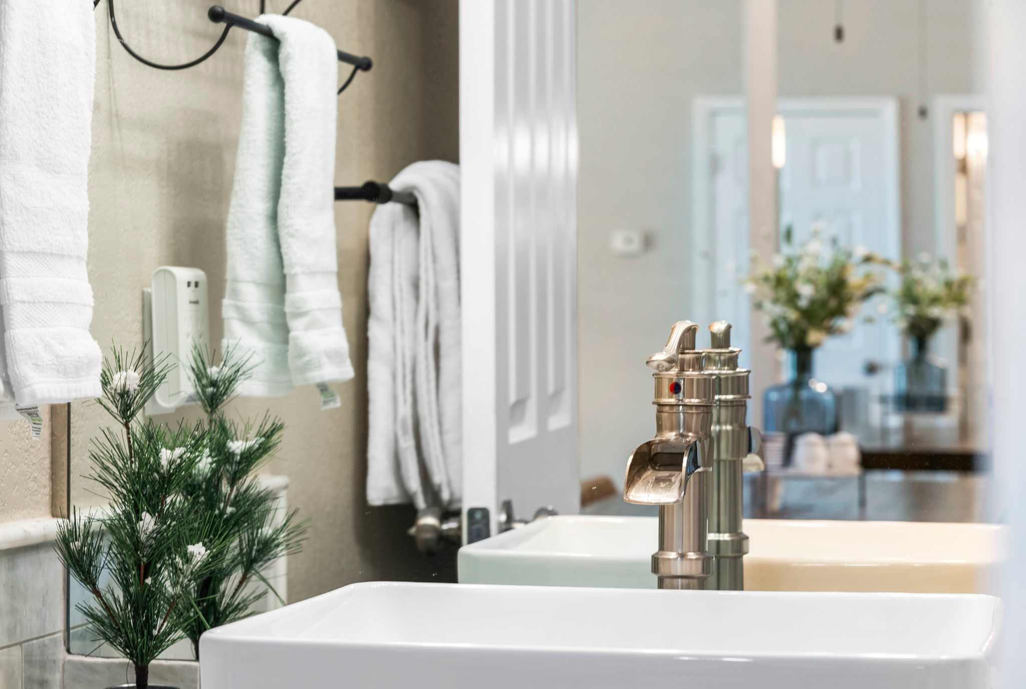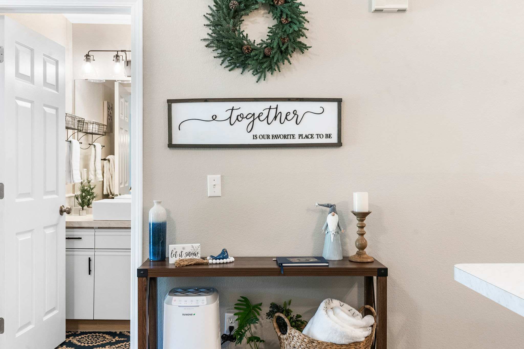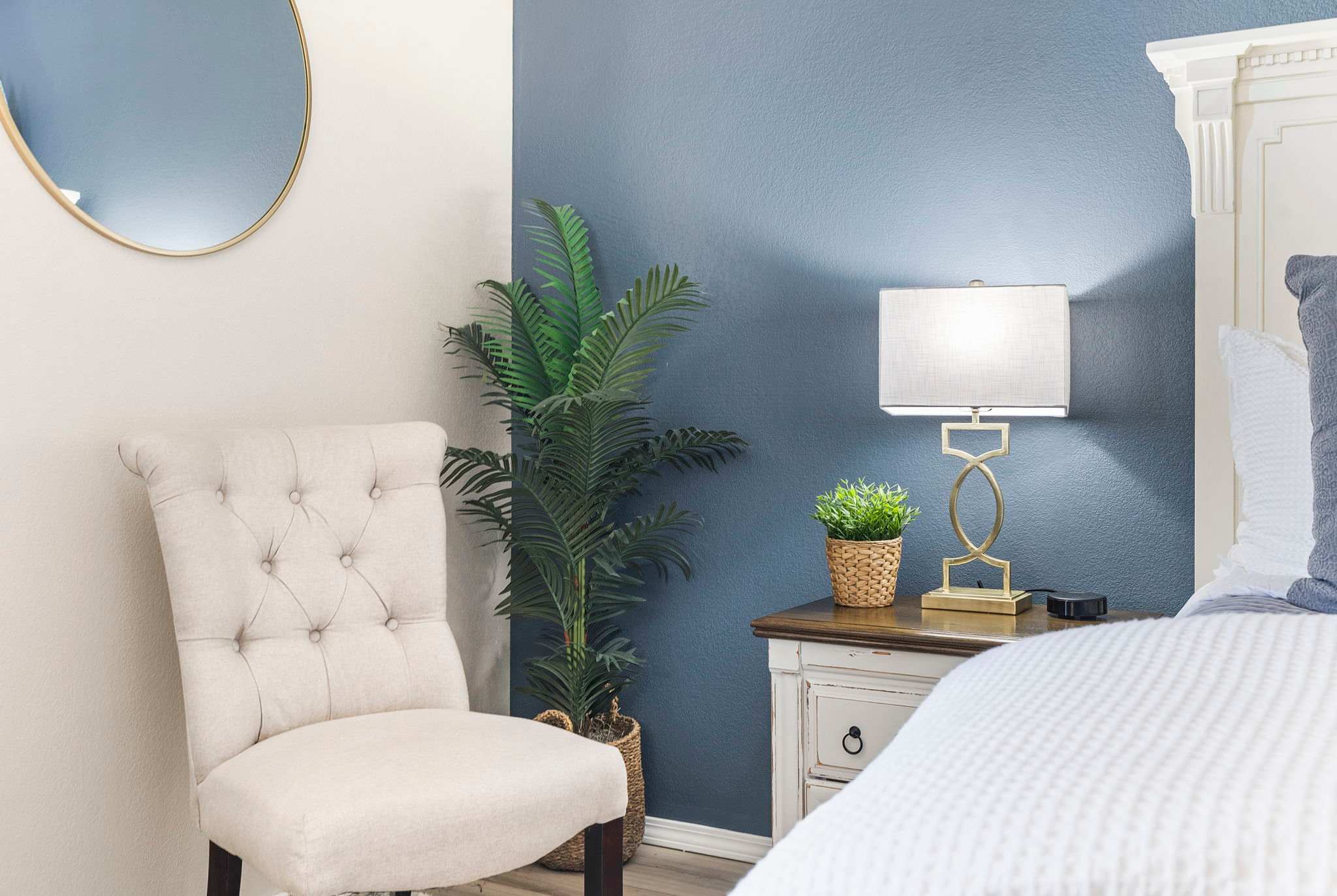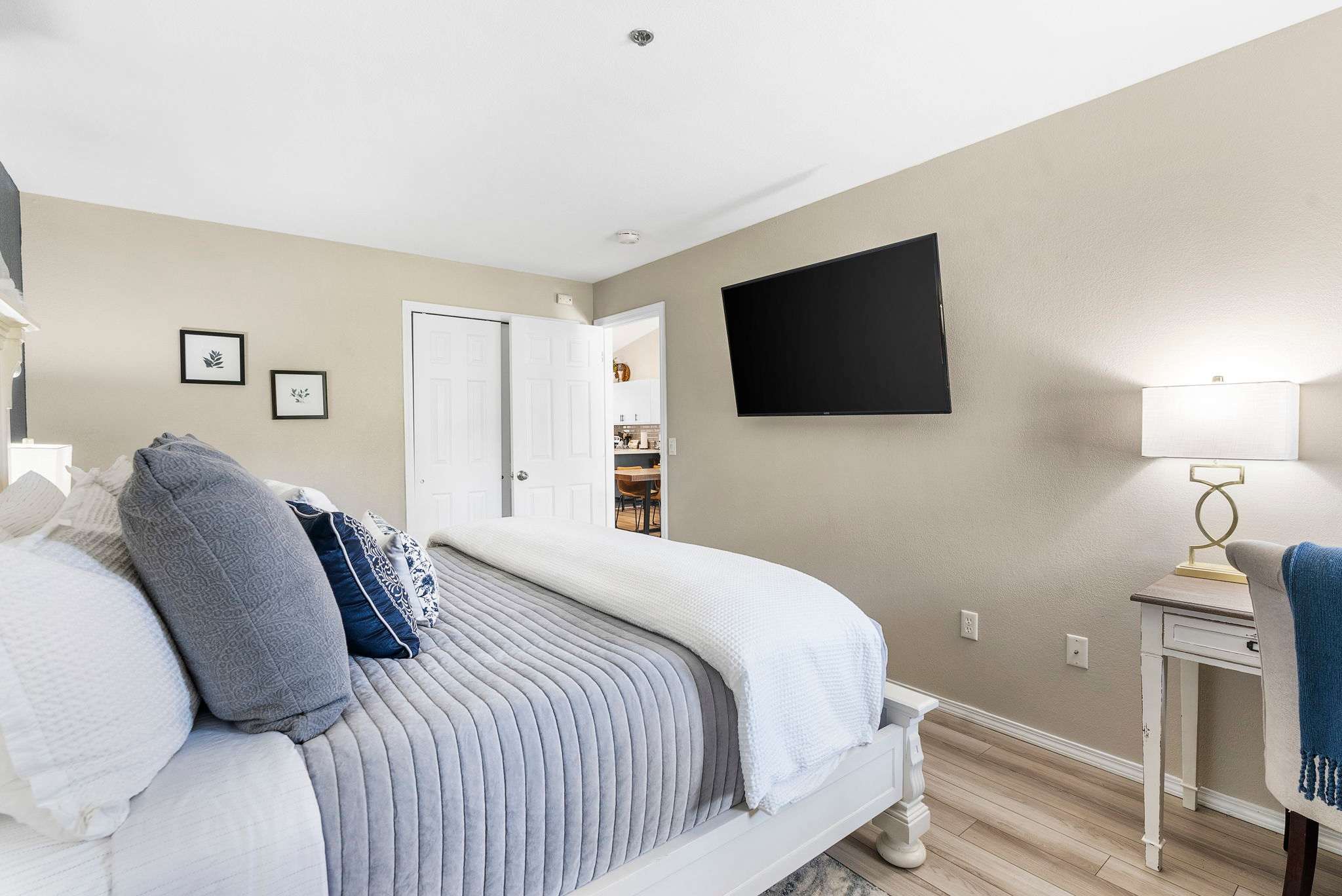 BEDROOM: Beautiful room with a 55” smart TV w/cable, dedicated work desk, and an extremely comfortable, chemical free king size mattress equipped with fresh linens and pillows. Plus, we have a Pack ‘n Play for your little one.