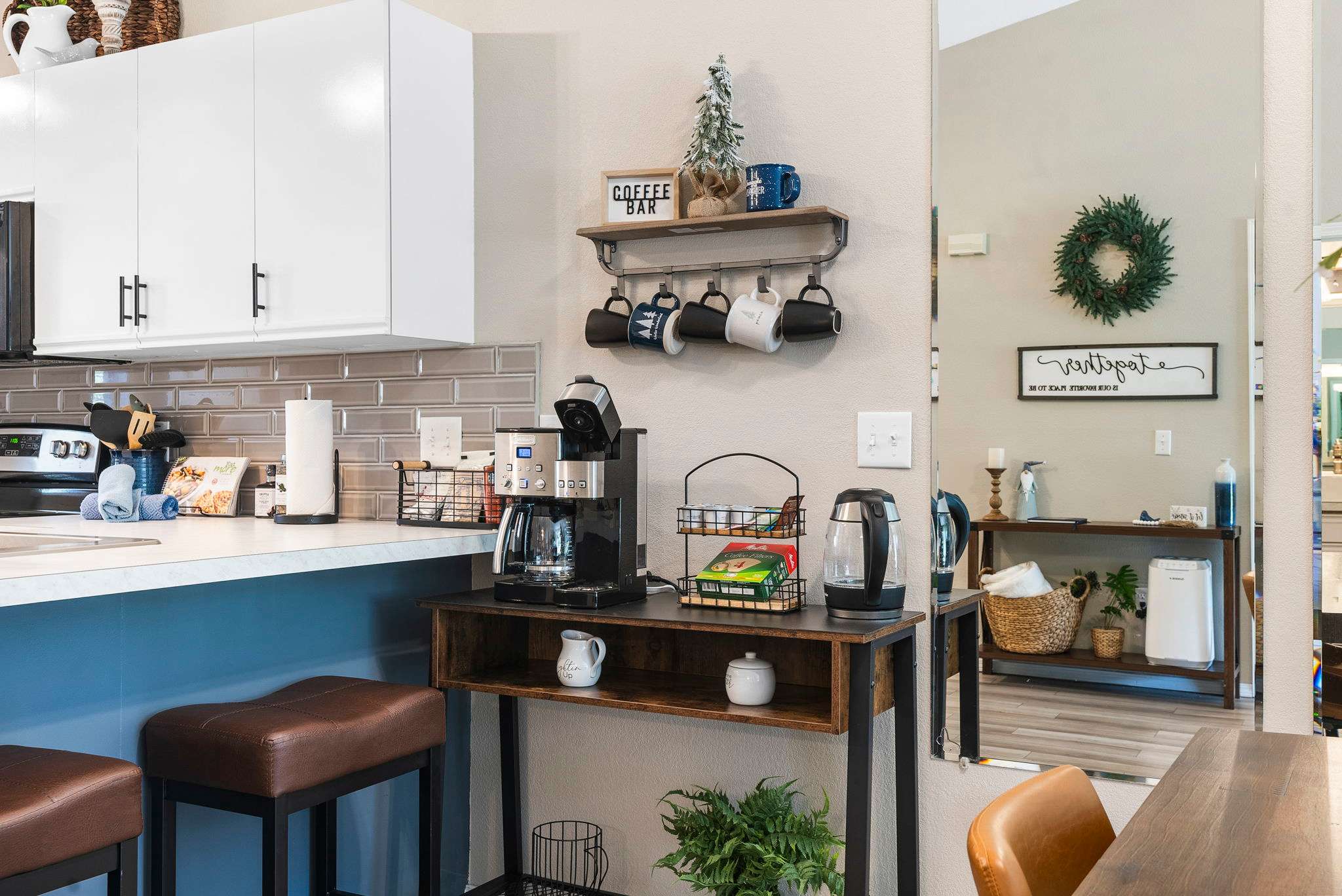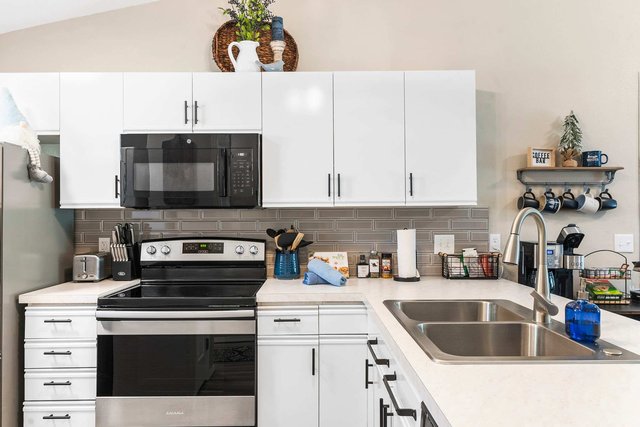 KITCHEN: Fully equipped w/ new stainless-steel appliances, cooking essentials, dishware and flatware, toaster, breakfast bar w/ seating, and a fully stocked coffee bar with a keurig & drip coffee maker and a teapot.