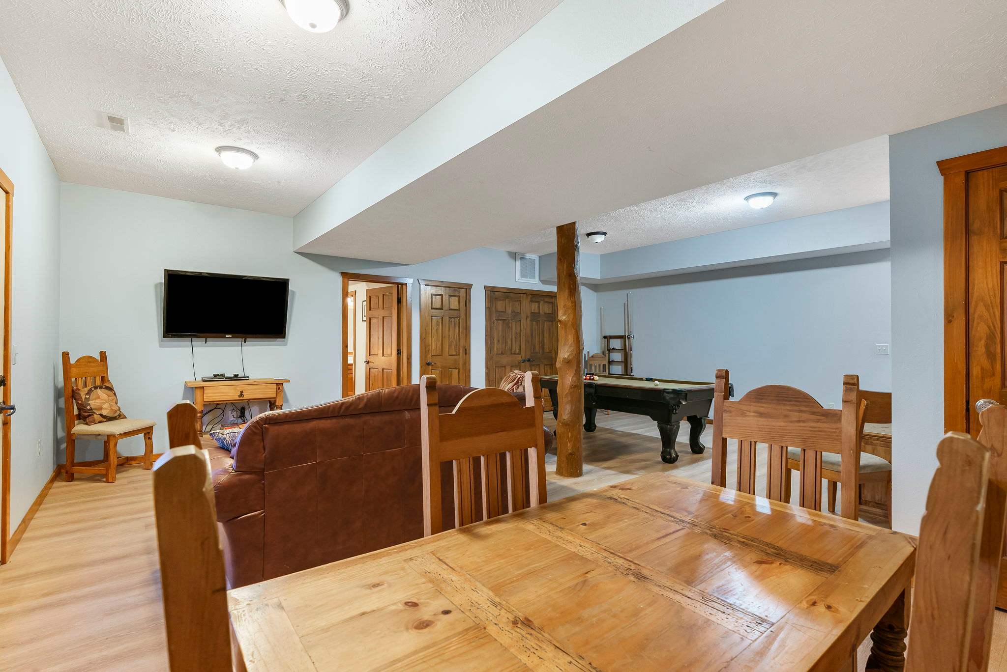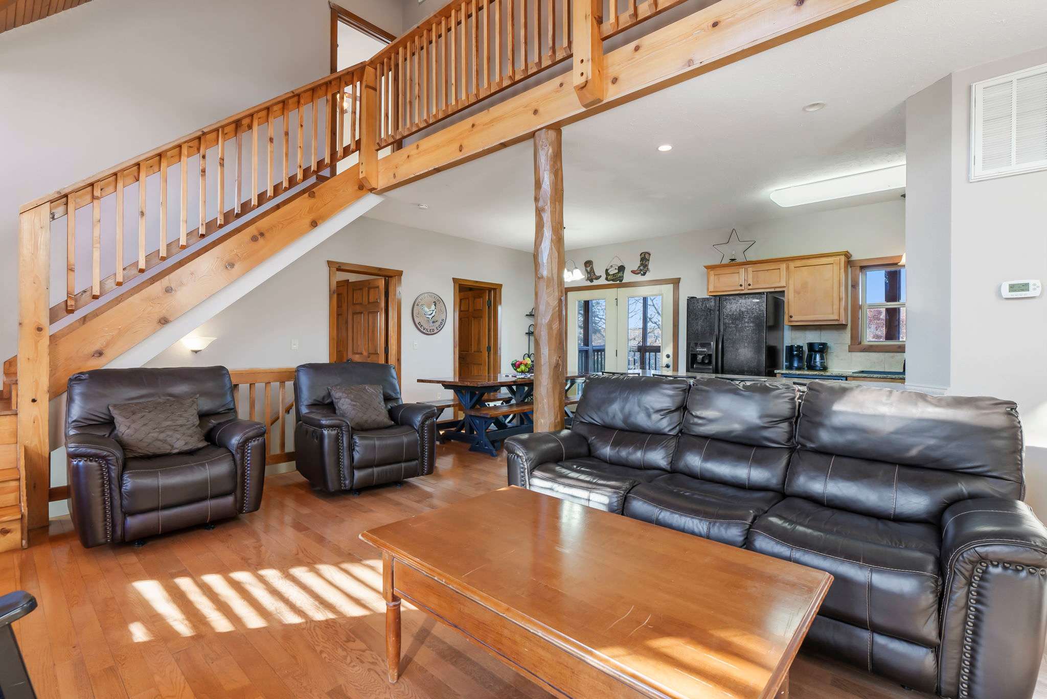 This rental is a combination of 2 separate homes near one another on the same quiet street. 2 miles from Silver Dollar City, these luxury, rustic-style homes put you within minutes of thrilling rides and unique entertainment, while multiple outdoor decks offer an immersion into calming nature when you arrive back home. Each home has an inviting living area with lofted ceilings, floor to ceiling windows, and a beautiful stone fireplace. This more formal living area opens right into the fully equipped kitchen and dining area where you can prepare and share homecooked meals, while downstairs a more casual living space is furnished with cozy couches, and smart tv, along with foosball and air hockey table (in separate cabins)