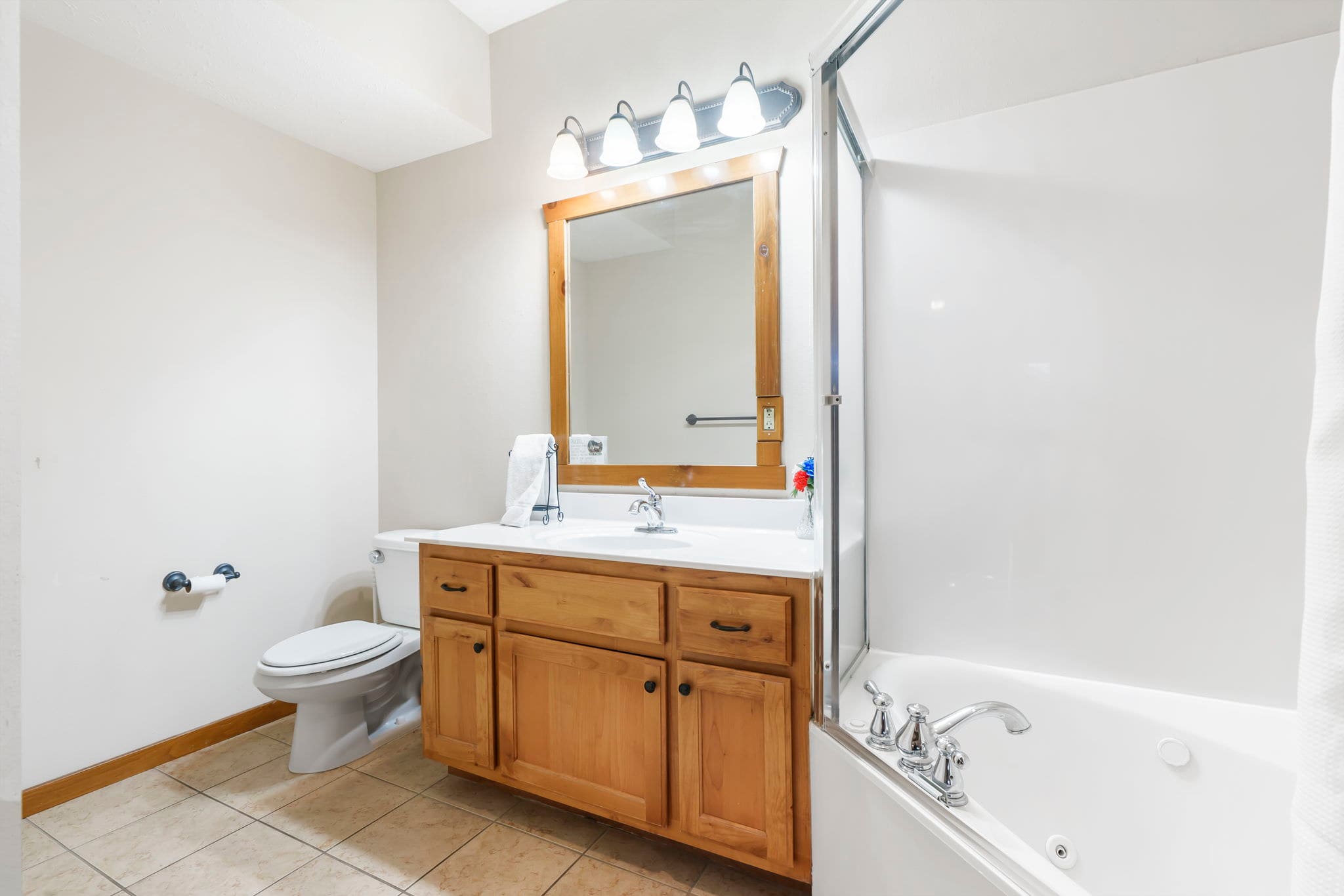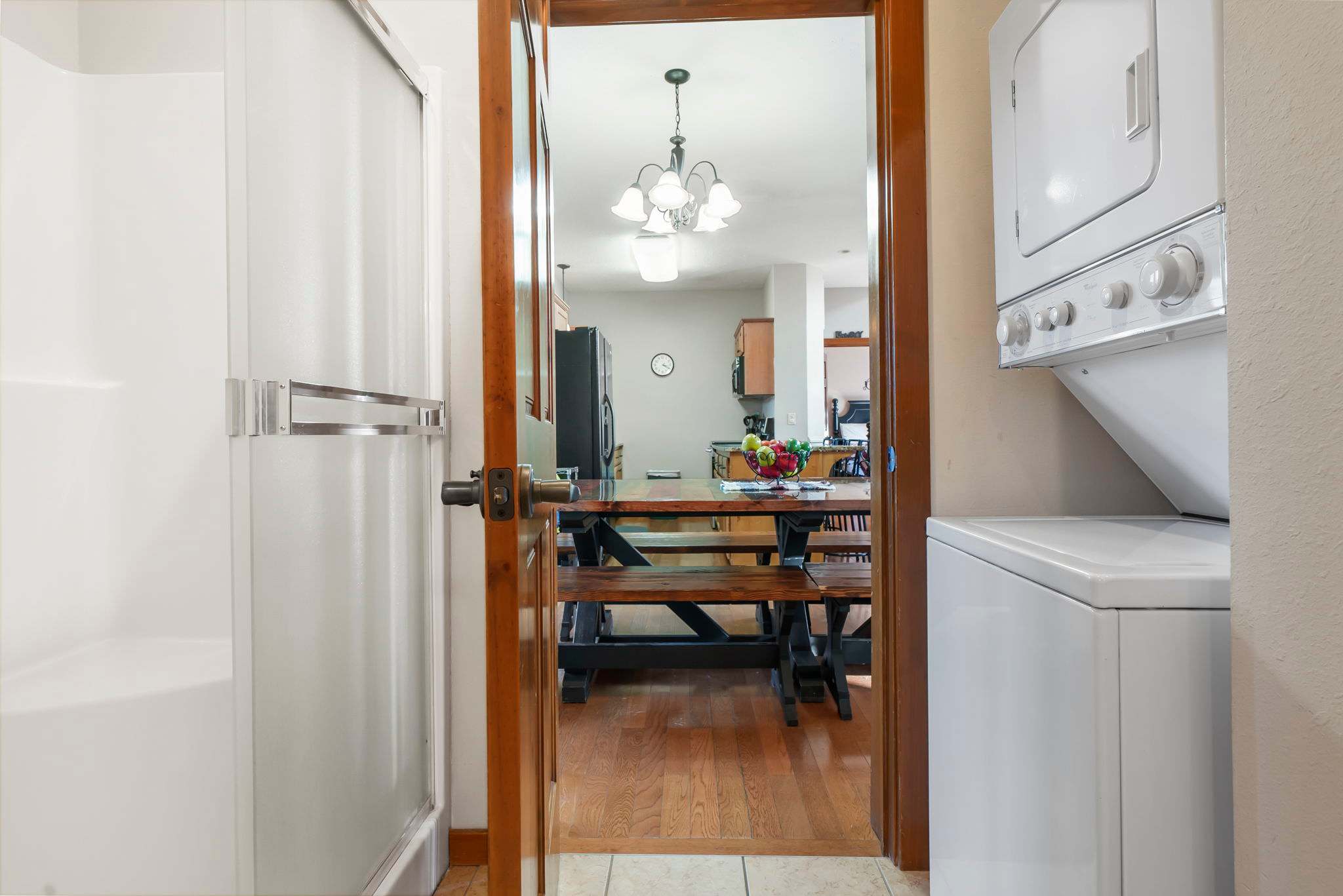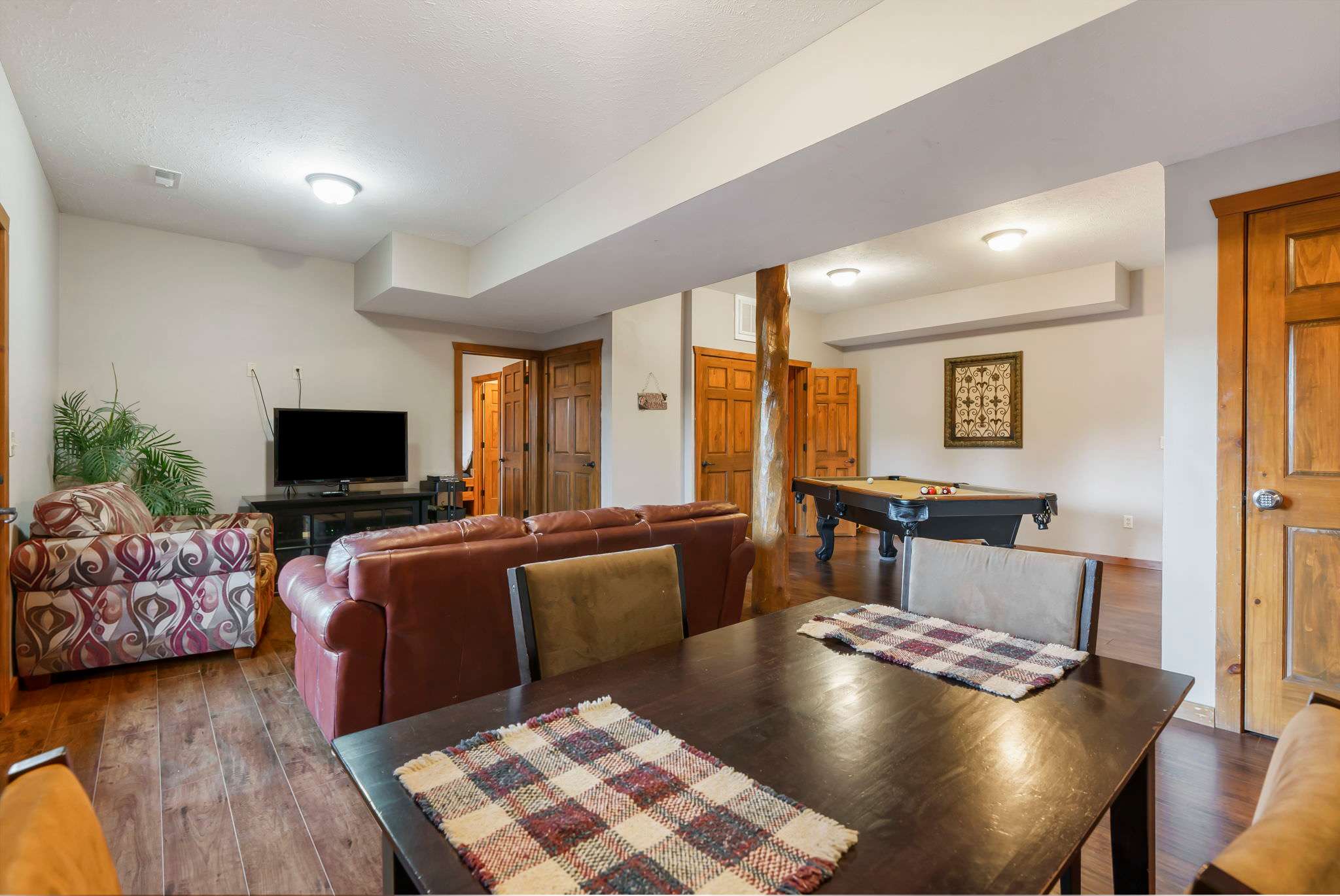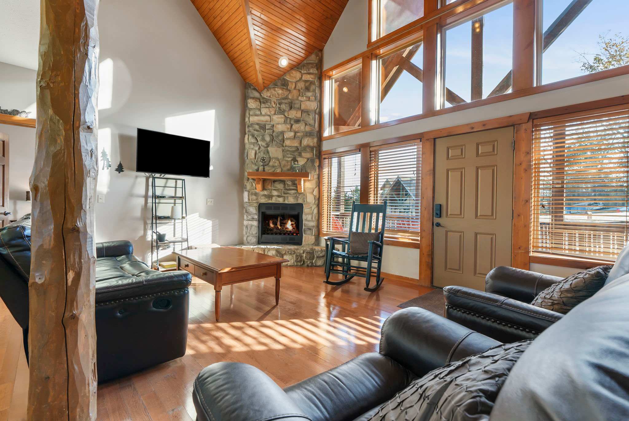 The home’s living area provides a warm welcome as you enter the house, with lofted ceilings, floor to ceiling windows, and a beautiful stone fireplace. This more formal living area opens right into the fully equipped kitchen and dining area where you can prepare and share homecooked meals, while downstairs a more casual living space is furnished with cozy couches, smart tv, and air hockey table.