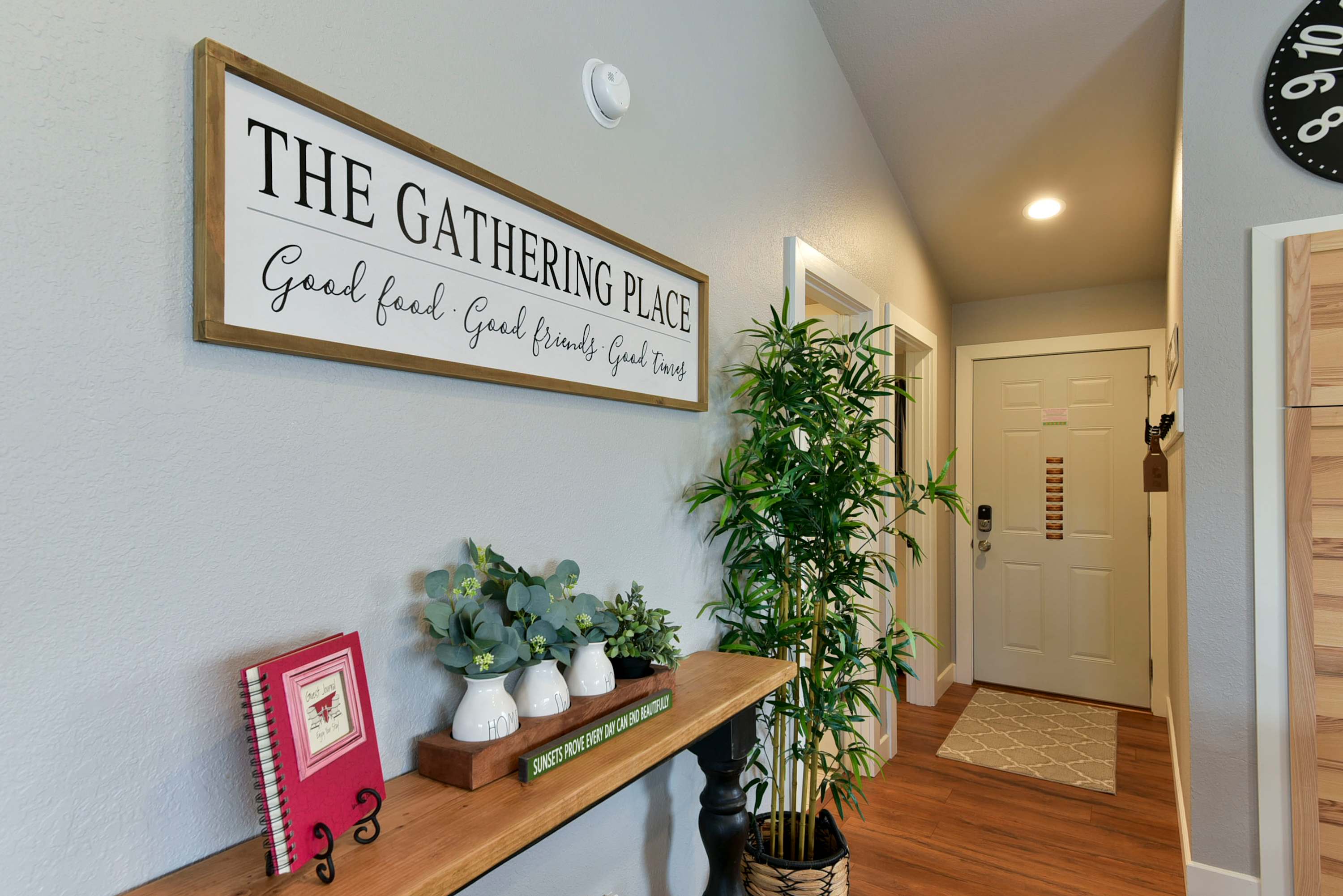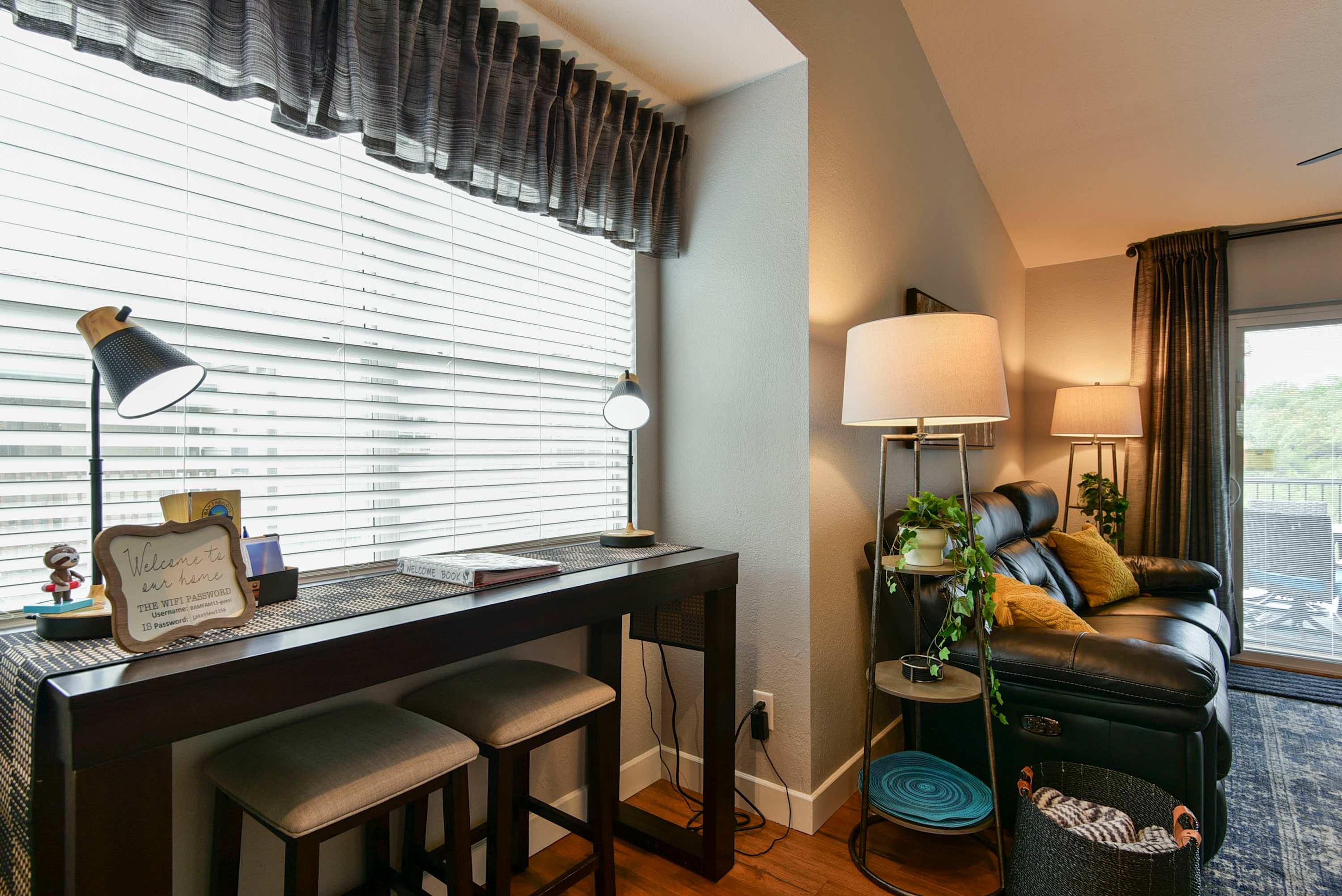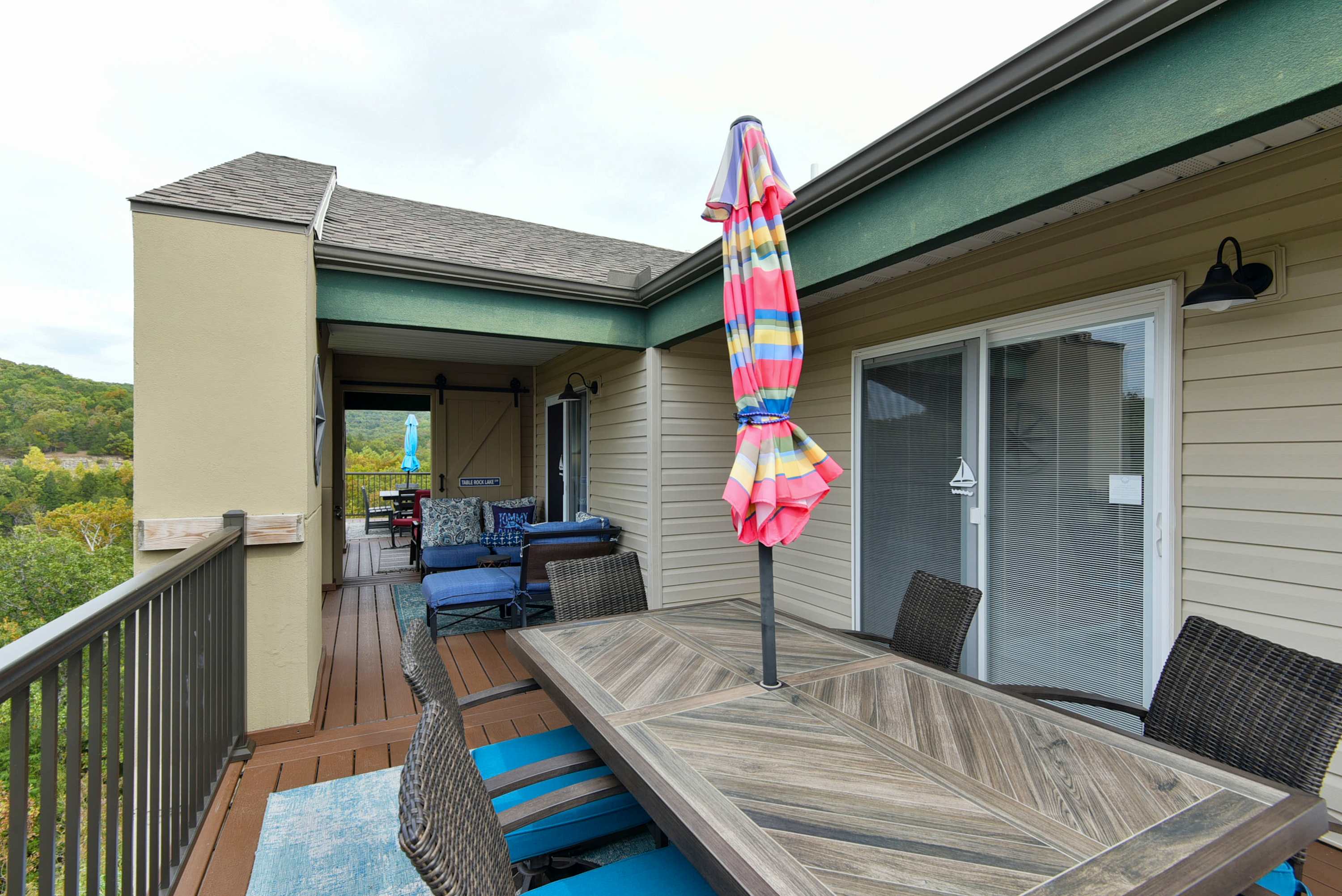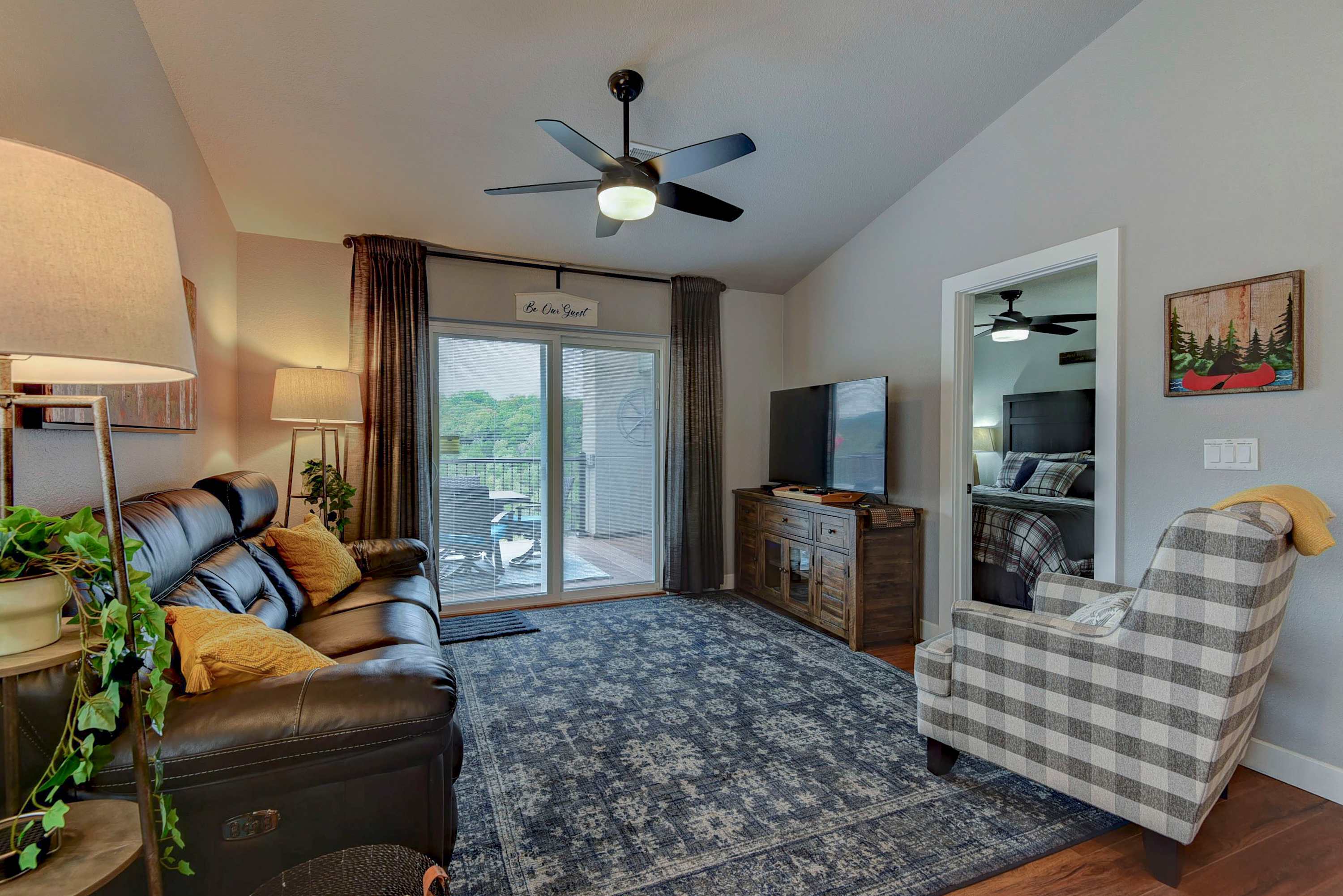 This 2-bedroom condo gives you the penthouse experience with a top floor balcony overlooking the unparalleled beauty of the Ozarks. The balcony is partially shaded with space to relax on comfortable seating, plus an open-air dining table is ready to host memorable meals outside. This is a Branson experience you’ll want to share with friends, and when you book The Gathering Place with the next-door unit (Branson Blue Lakeview), your private balconies connect for double the space and double the fun.