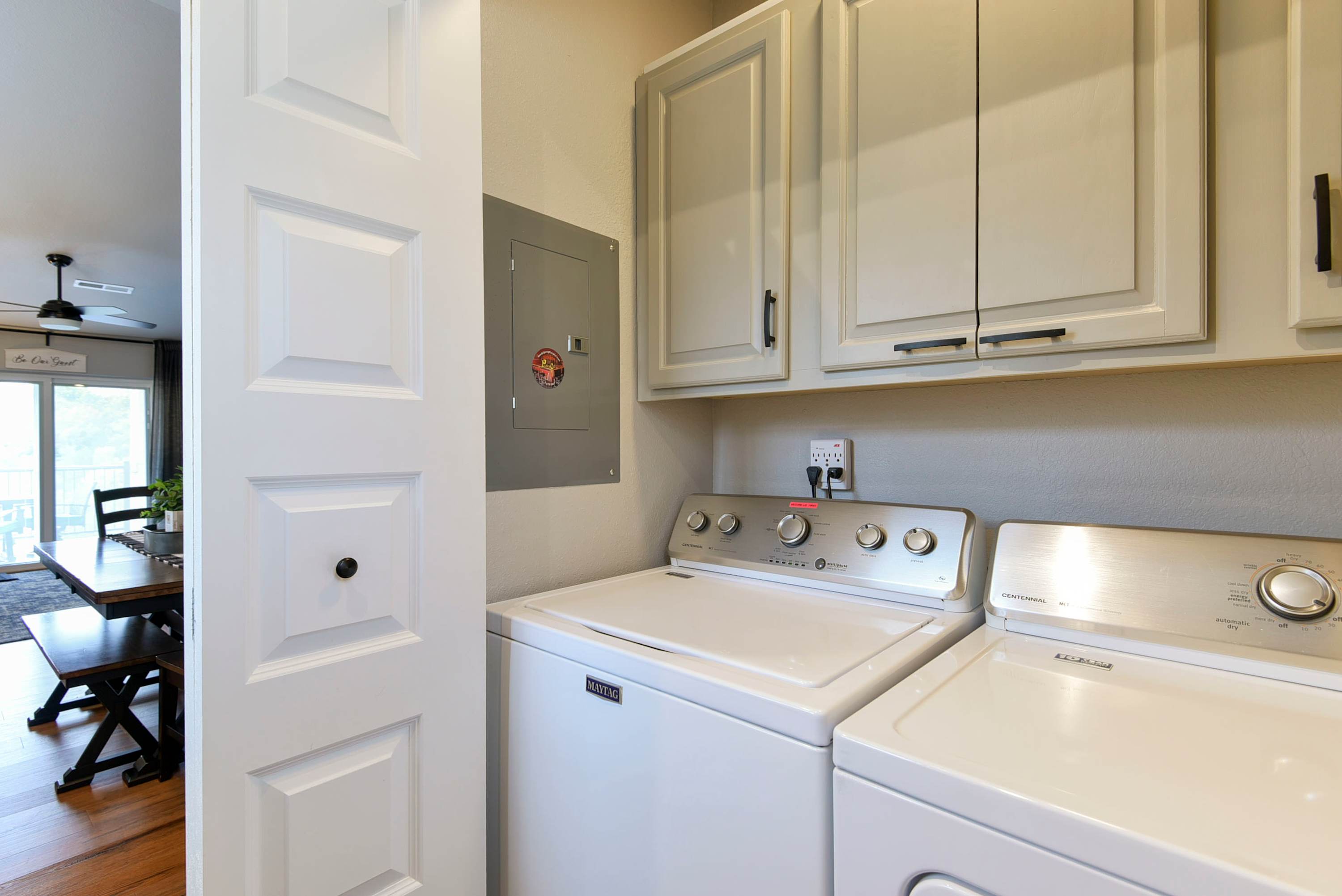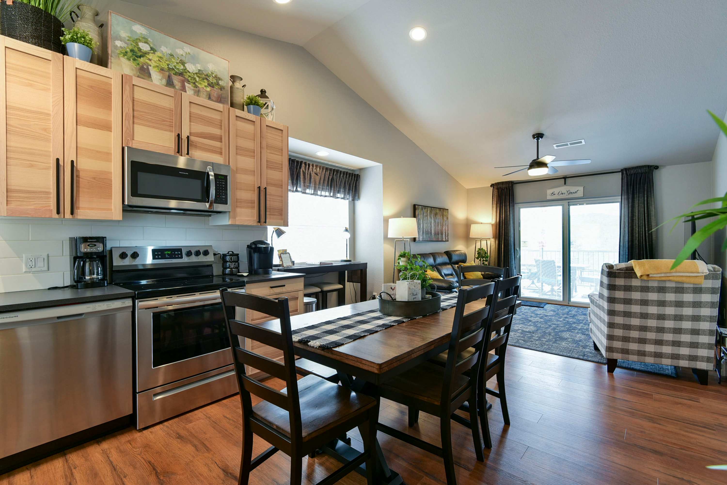 Between enjoying the property’s outdoor space and exploring all there is in Branson, you’ll certainly need some time to unwind indoors. The cozy living room is furnished for just that with a large couch, smart tv, and even a small, multi-use desk space. The modern kitchen is fully equipped with stainless steel appliances and cookware for intimate meals at home. An indoor dining table is right of the kitchen with seating for 6.