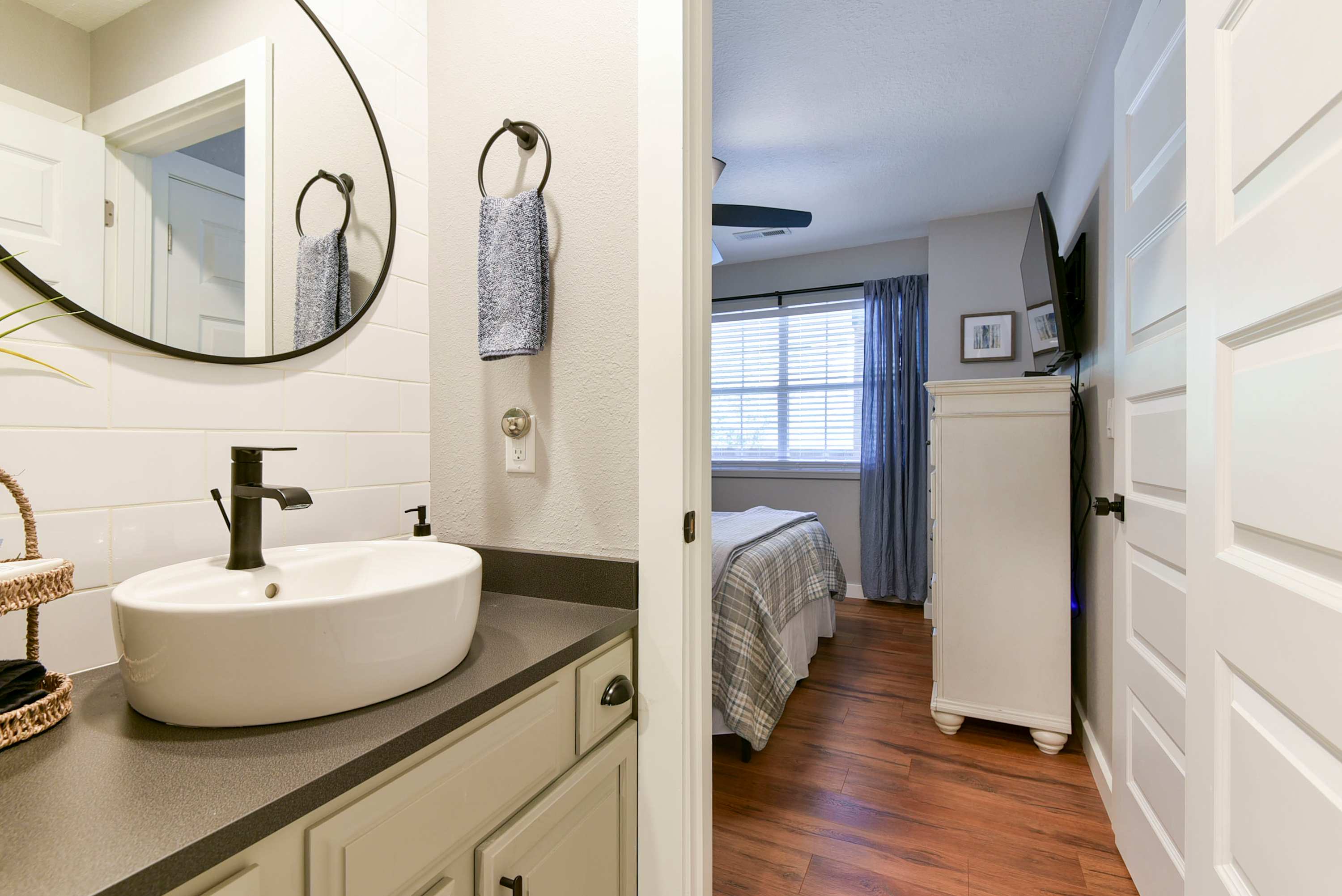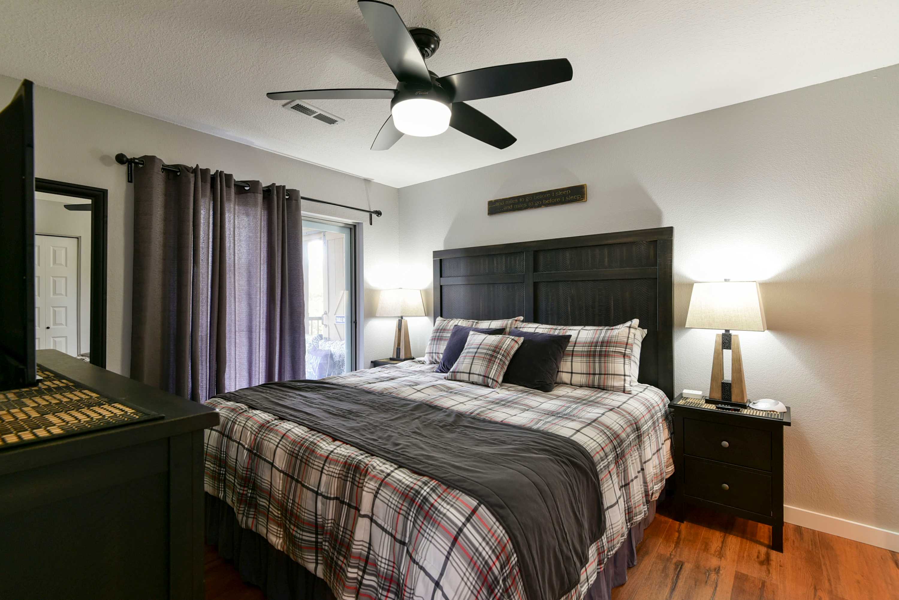Bedroom #1 is the primary suite with a king-size bed, smart tv, and ensuite bathroom with dual sinks and shower/tub combo. Sliding glass doors open from the bedroom right onto the home’s balcony.