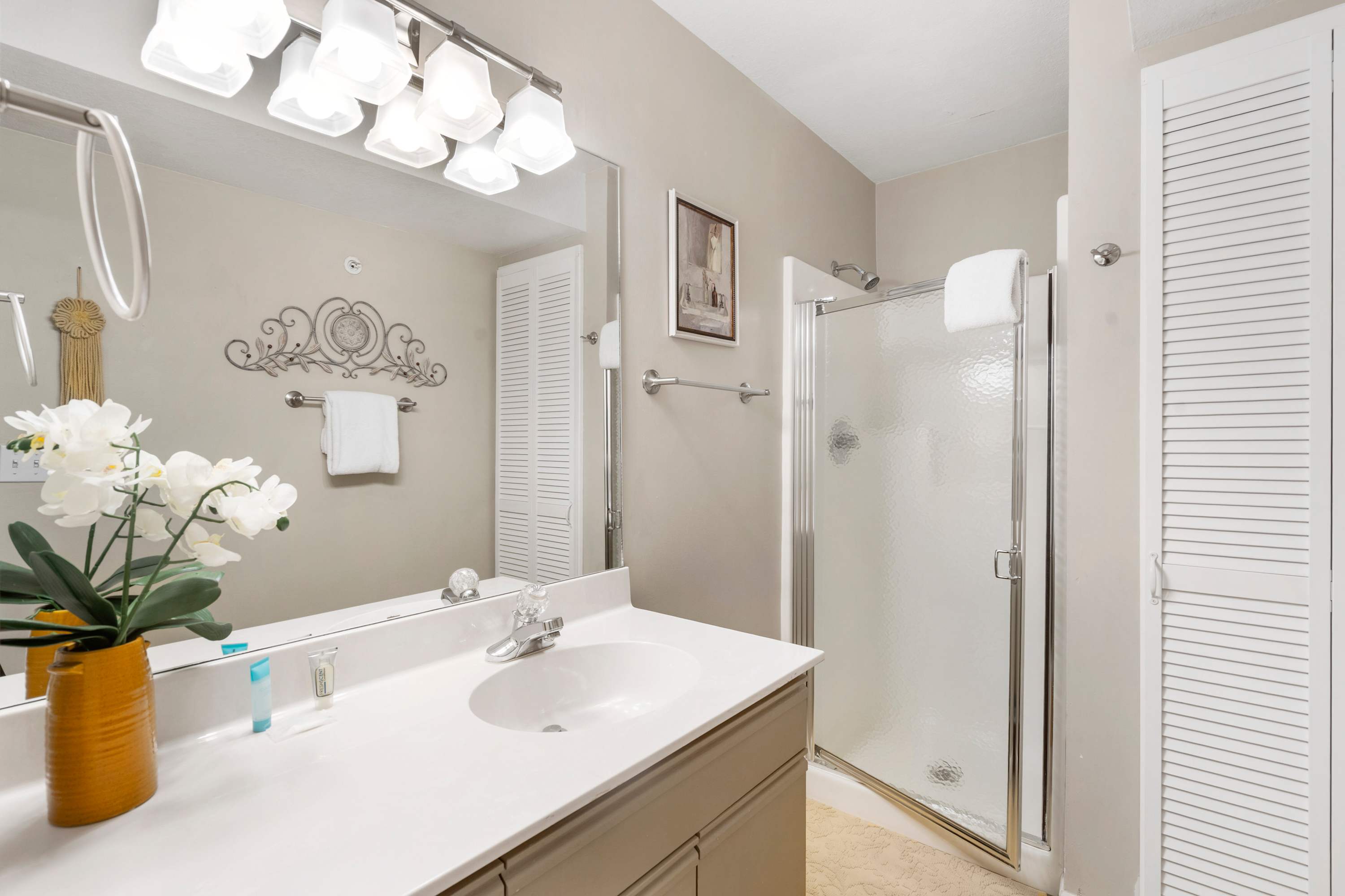 Bedroom #1 has a queen size bed, smart tv, and ensuite bathroom with walk-in shower.