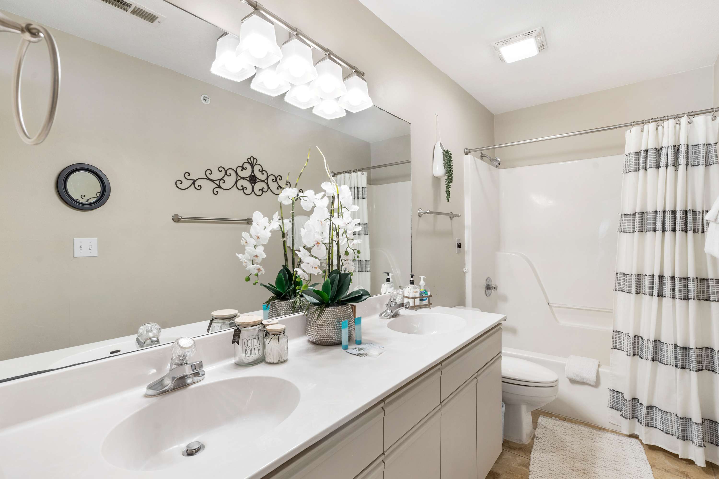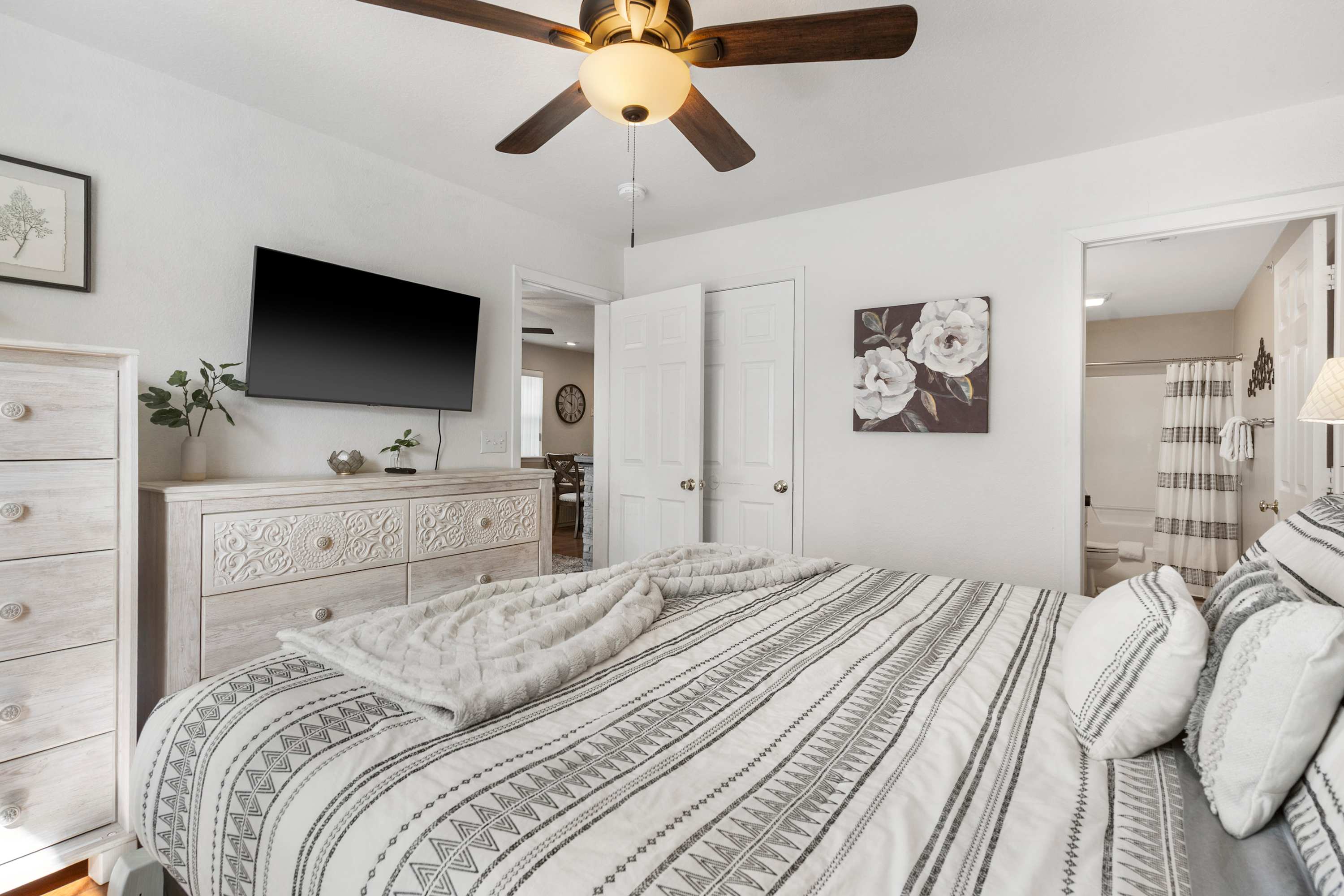 Bedroom #2 has a king size bed, smart tv, and ensuite bathroom with dual sinks and shower/tub combo.