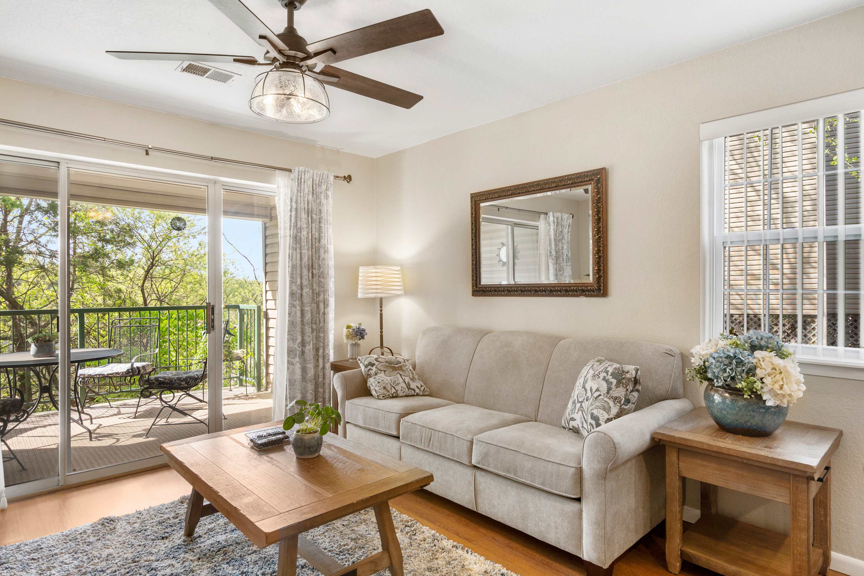The home’s private balcony truly feels like it’s lofted in the trees. An outdoor dining table is placed here so you can enjoy morning coffee, evening dinner, and conversation with friends looking out over the canopy of trees and the beautiful Branson sky beyond.