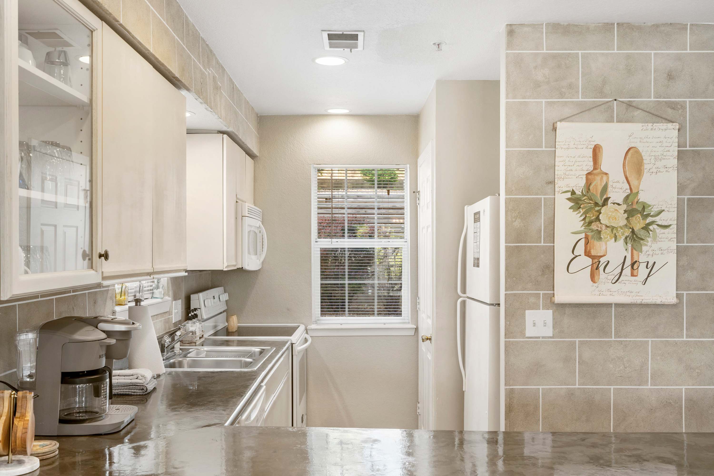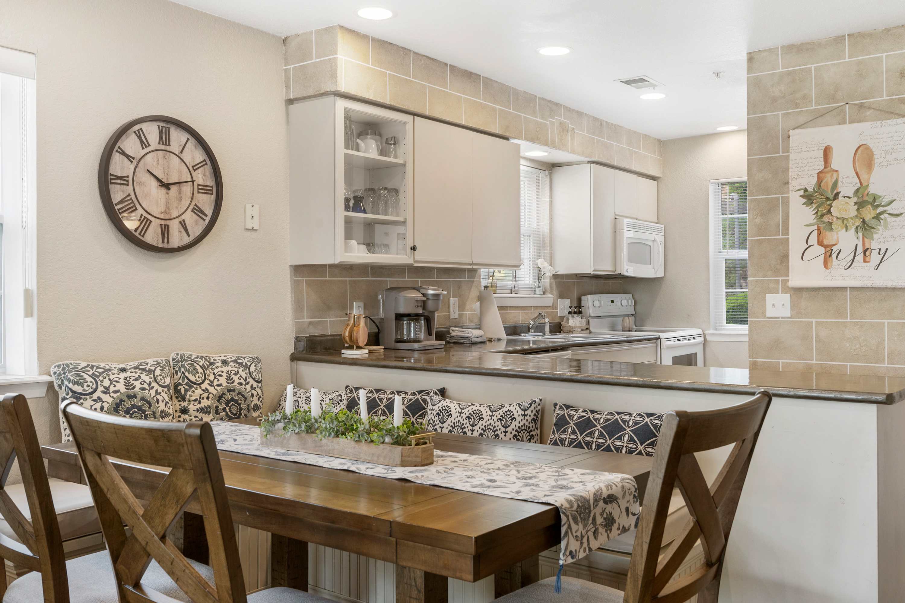 Inside the home, a cozy open concept area encourages relaxation and time spent together. The living area is furnished with a large couch, electric fireplace, and smart tv. Gather at the coffee table to play one of the provided board games, or enjoy the ambience of the fire during a night in with movies. The fully equipped kitchen stands ready for every food preparation need. When cooking a meal to enjoy at home, you have your choice of the indoor dining table for 6, or the outdoor table for 4, accessible through sliding glass doors.