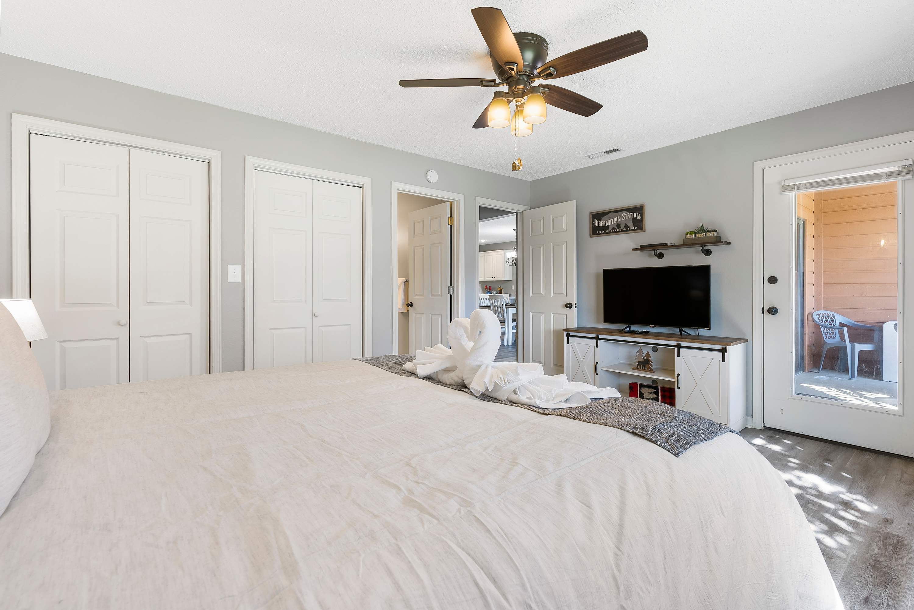 Bedroom #2 is the primary suite with a king size bed, smart tv, and ensuite bathroom with dual sinks and shower/tub combo.