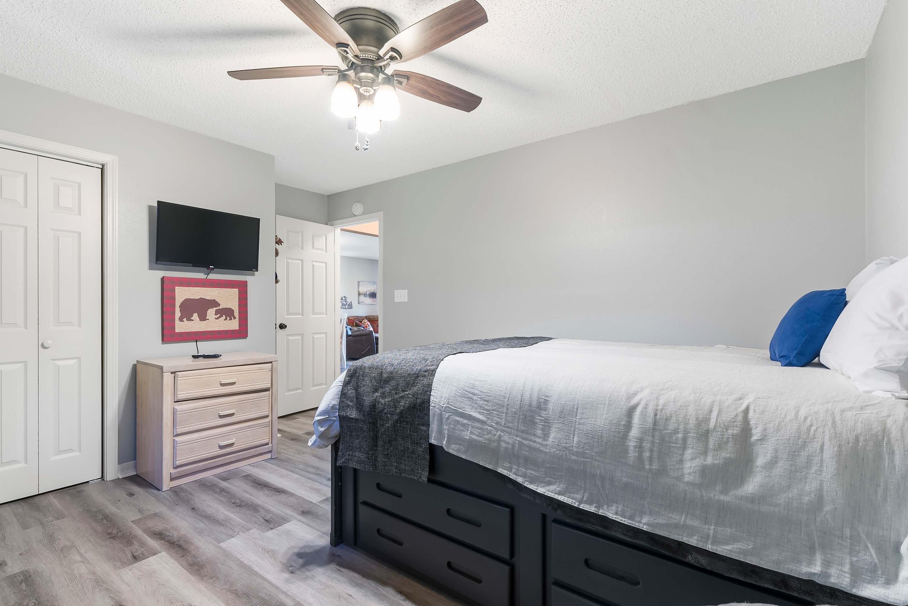 Bedroom #1 is furnished with a full size bed, twin size trundle bed, and smart tv.
