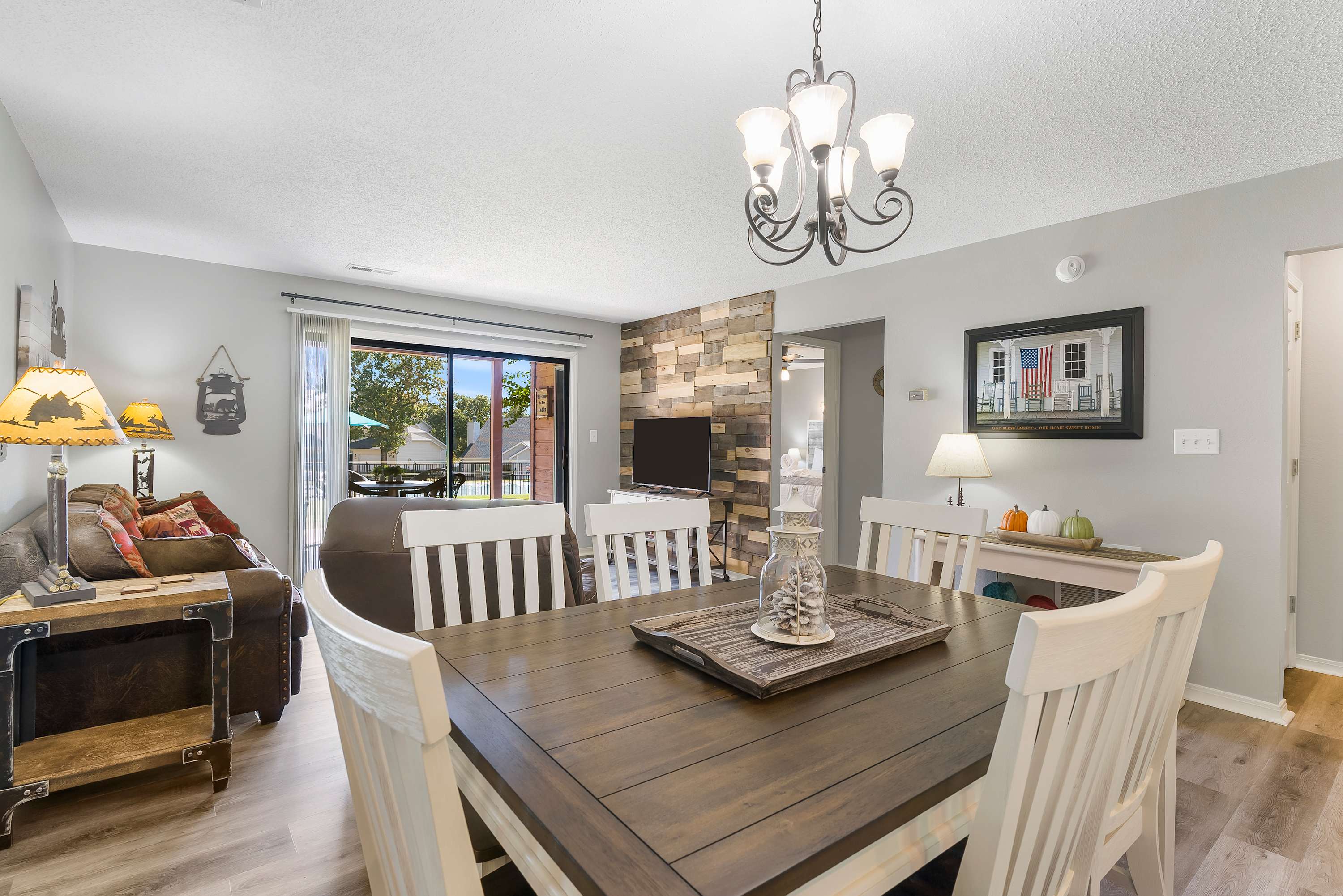 Inside the home, cozy furnishings and thoughtfully designed living spaces create an atmosphere of relaxation and gathering. In between Branson excursions and enjoying all the resort offerings, spend leisure time in the living area with large screen smart tv. Meals at home can be prepared in the fully equipped kitchen which includes a coffee machine and blender for your convenience. The dining table seats 6 and is perfect for shared meals, visiting over drinks, or a night in playing cards or games.