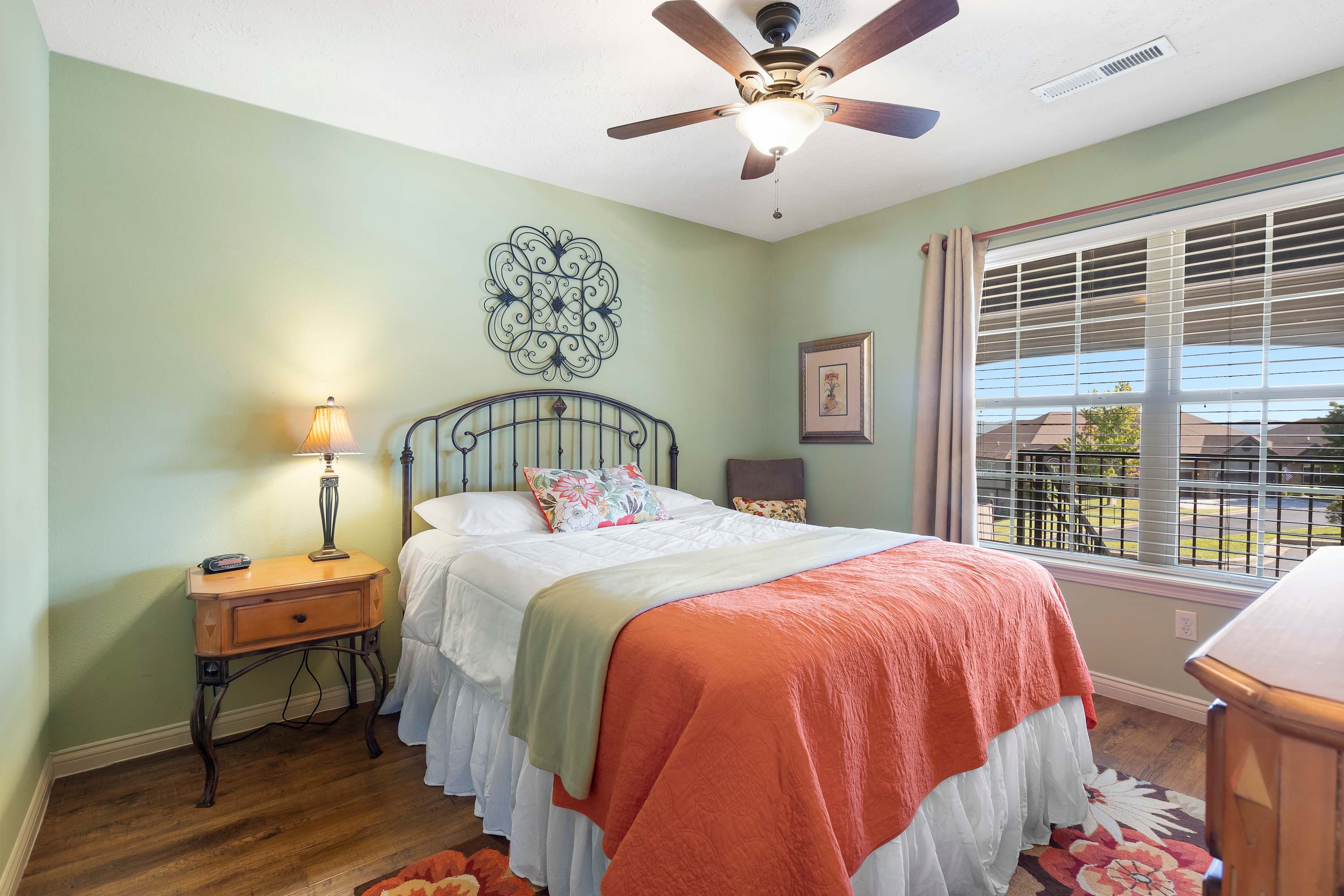 The interior of this home is bright and modern, with furnishings that are both inviting and functional. The open concept space features comfortable seating, perfect for relaxing after a day out, or enjoying a night in with movies on the large screen smart tv. Between the formal dining table with seating for 4 and the breakfast bar with additional seating for 3, there’s plenty of room for meals enjoyed at home. The spacious kitchen with its wide countertops and standard appliances also includes a toaster, coffee machine, and cookware for your convenience. Enjoy a covered balcony with outdoor furniture. There’s no better place to start the day with your morning coffee, share a meal, or unwind after a day of adventure.