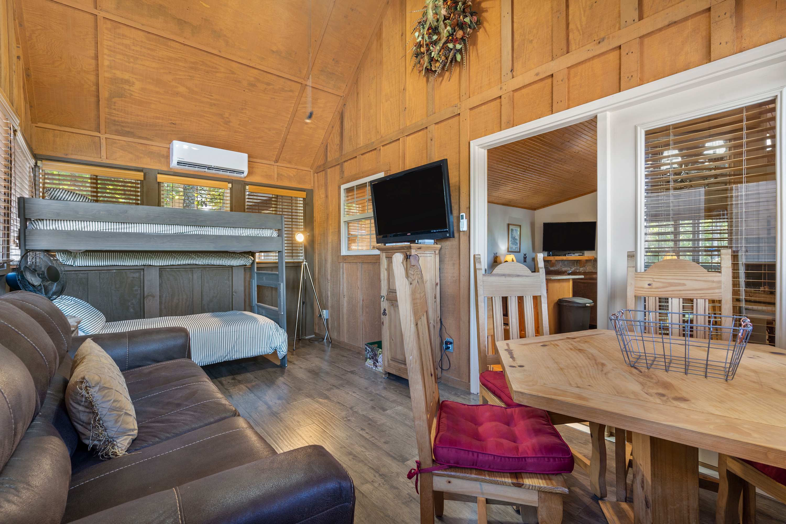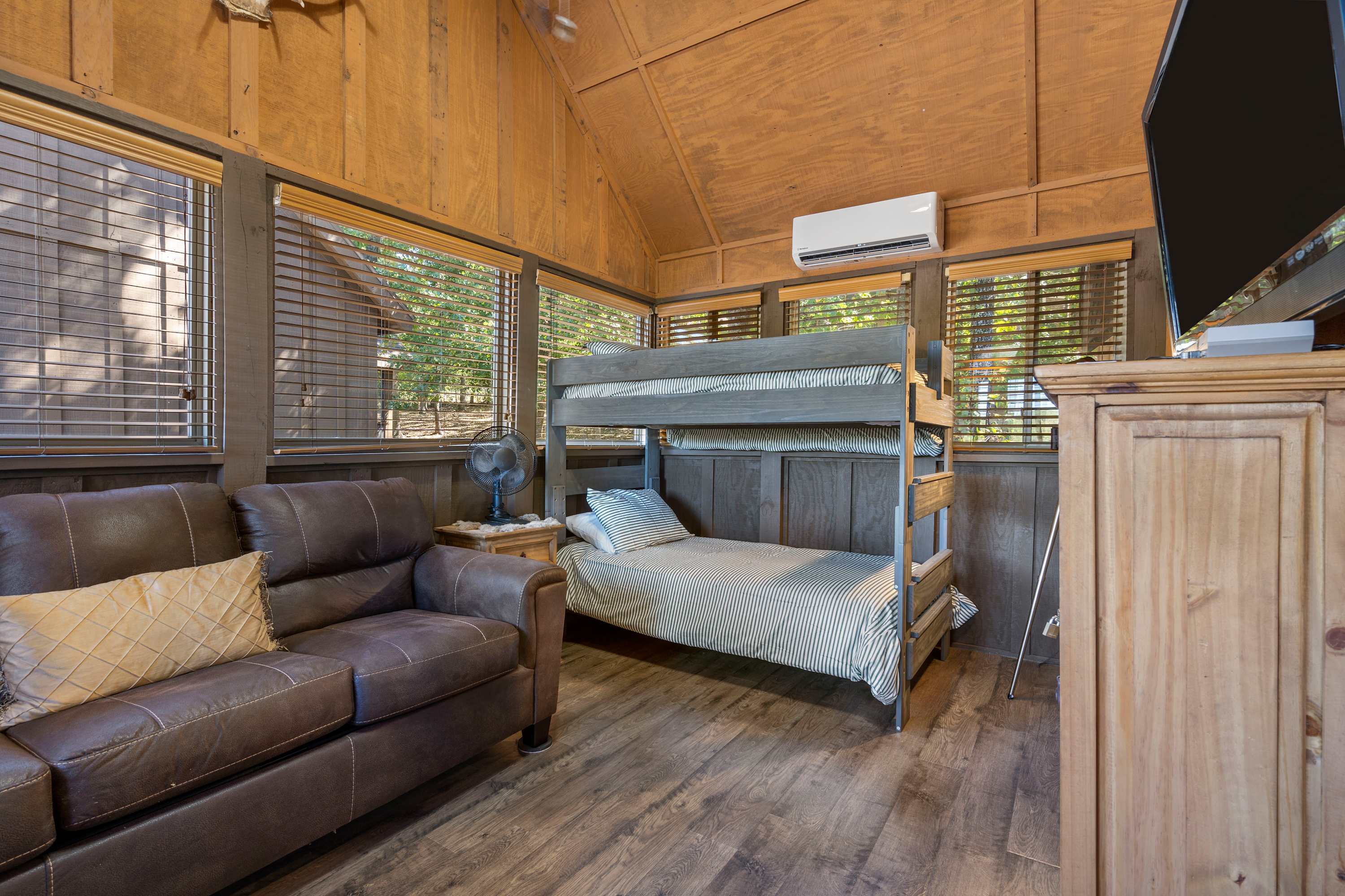 Bedroom #3 is a patio that has been converted to a third bedroom, equipped with separate heat and air. It has been configured with a Twin/Twin bunk bed, Queen sofa sleeper, and Smart TV.