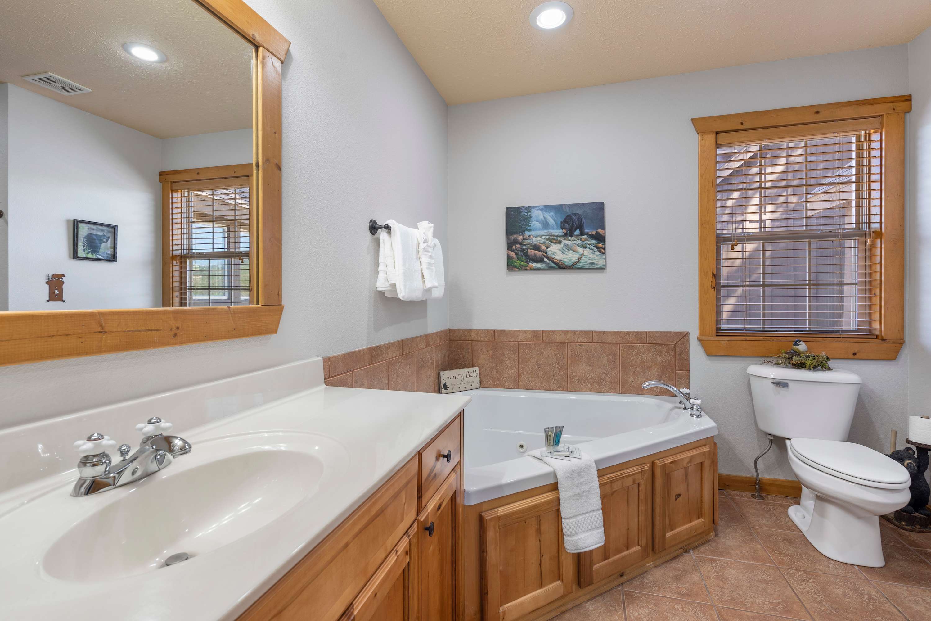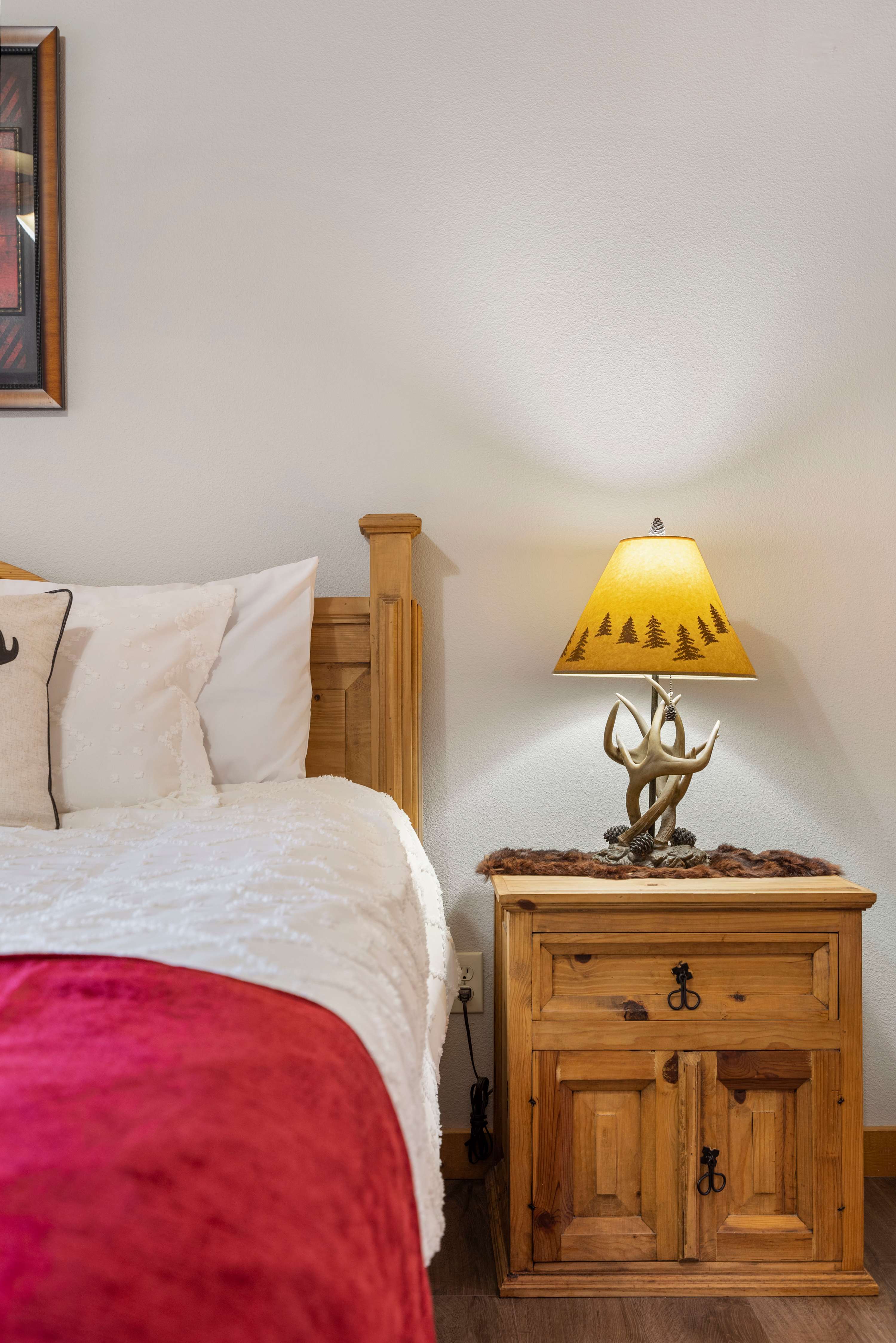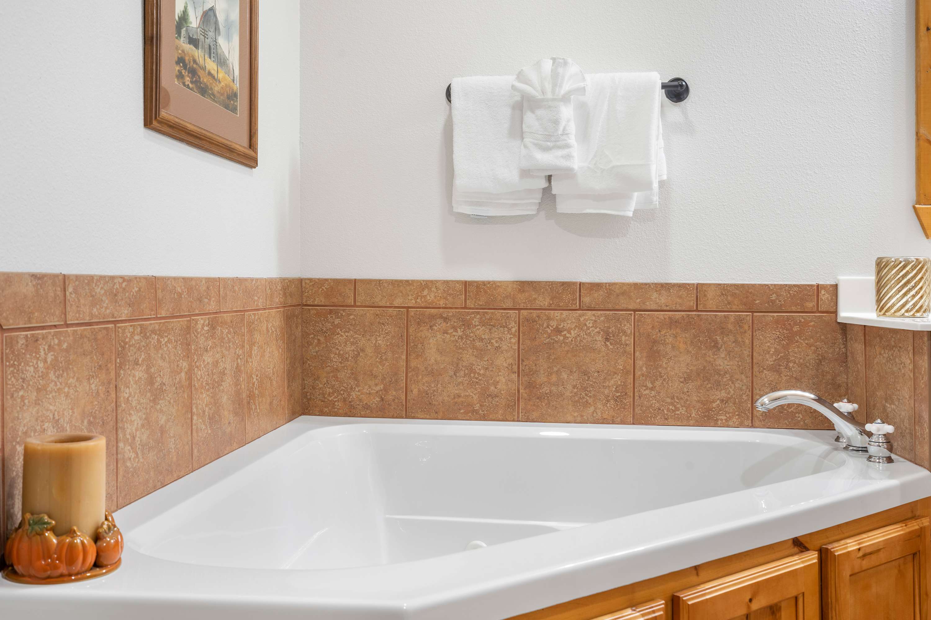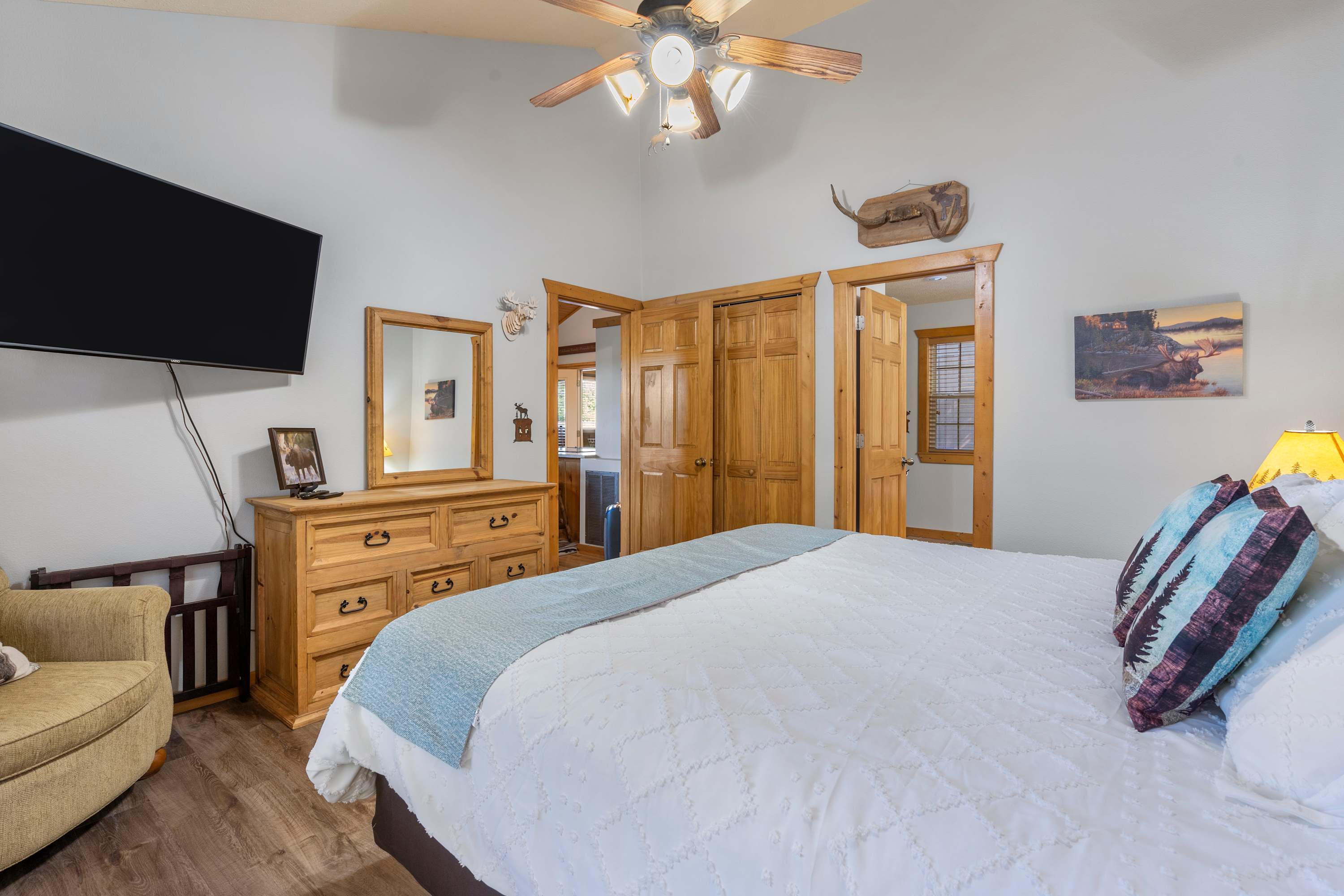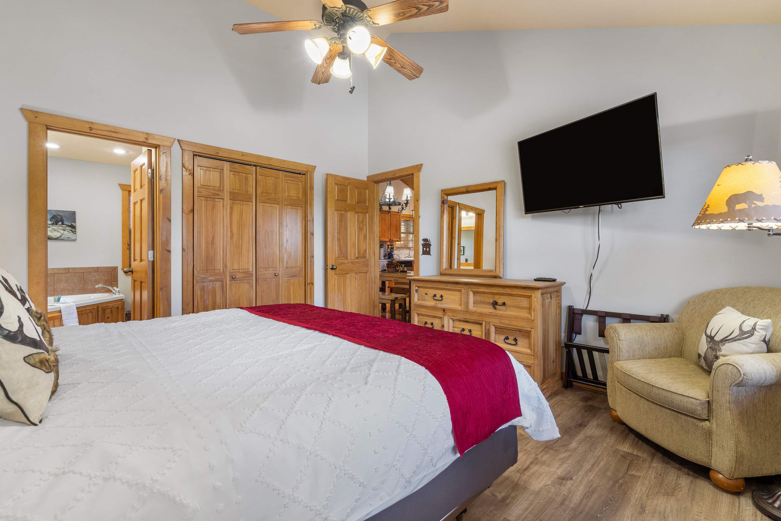 Bedroom #1 is outfitted with a King bed, Smart TV, and shared en-suite. The shared en-suite offers a jetted tub and stand-up shower and can be accessed from the living room.