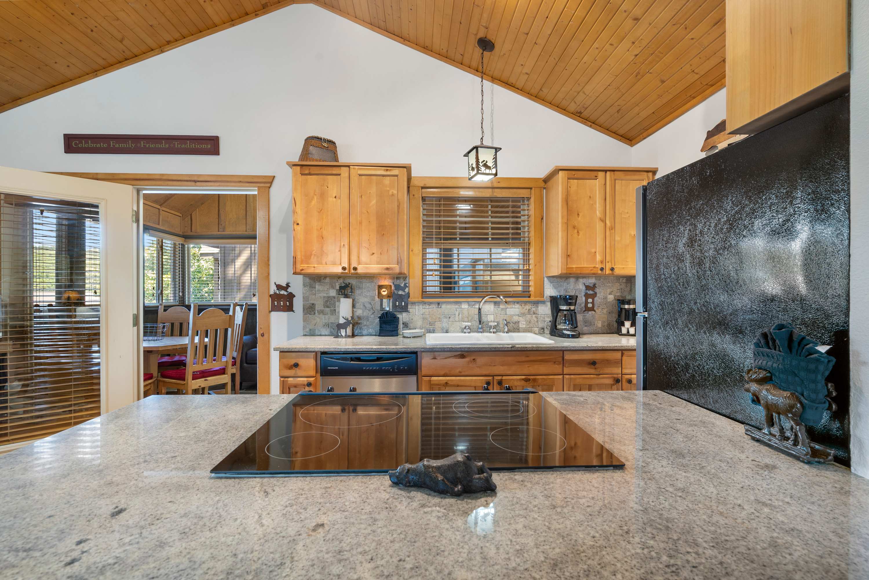 Back inside, the kitchen is in direct sight of the living room allowing there to be an organic flow between entertaining. Guests can mingle with each other between the couch and the barstools from the kitchen counter. The kitchen is equipped with everything you may need to whip up a delicious meal from home. A toaster, and drip coffee maker are also available for your convenience. Steps away, enjoy meals together at the dining table for 8.