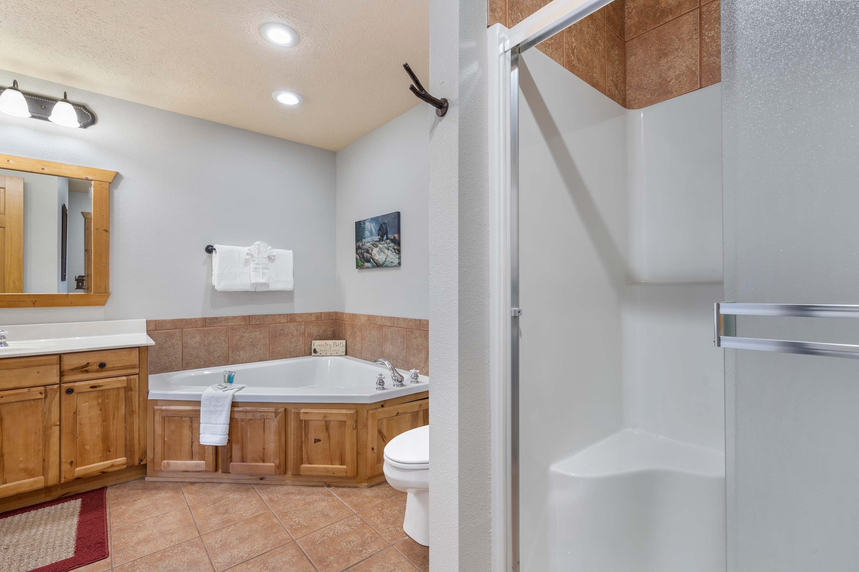 Bedroom #2 is configured with a King bed, Smart TV, and private en-suite. The private en-suite offers a jetted tub and stand-up shower.