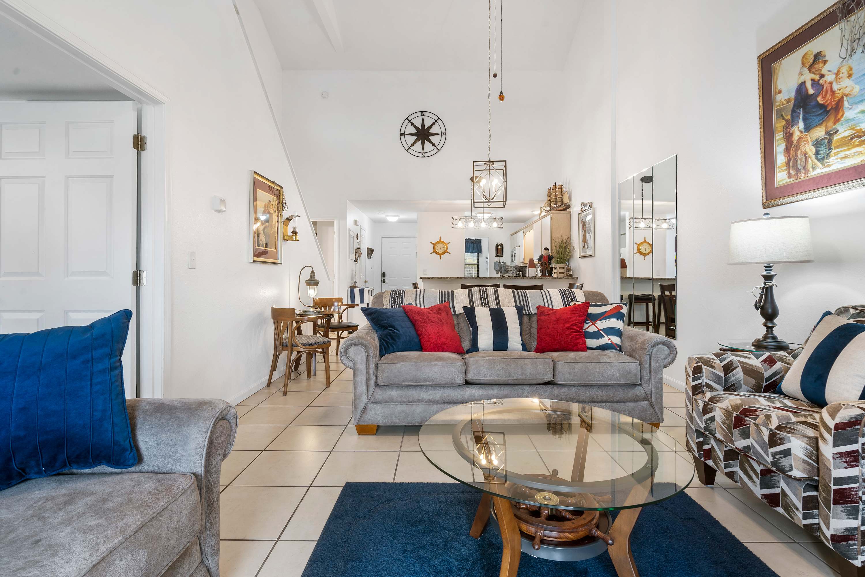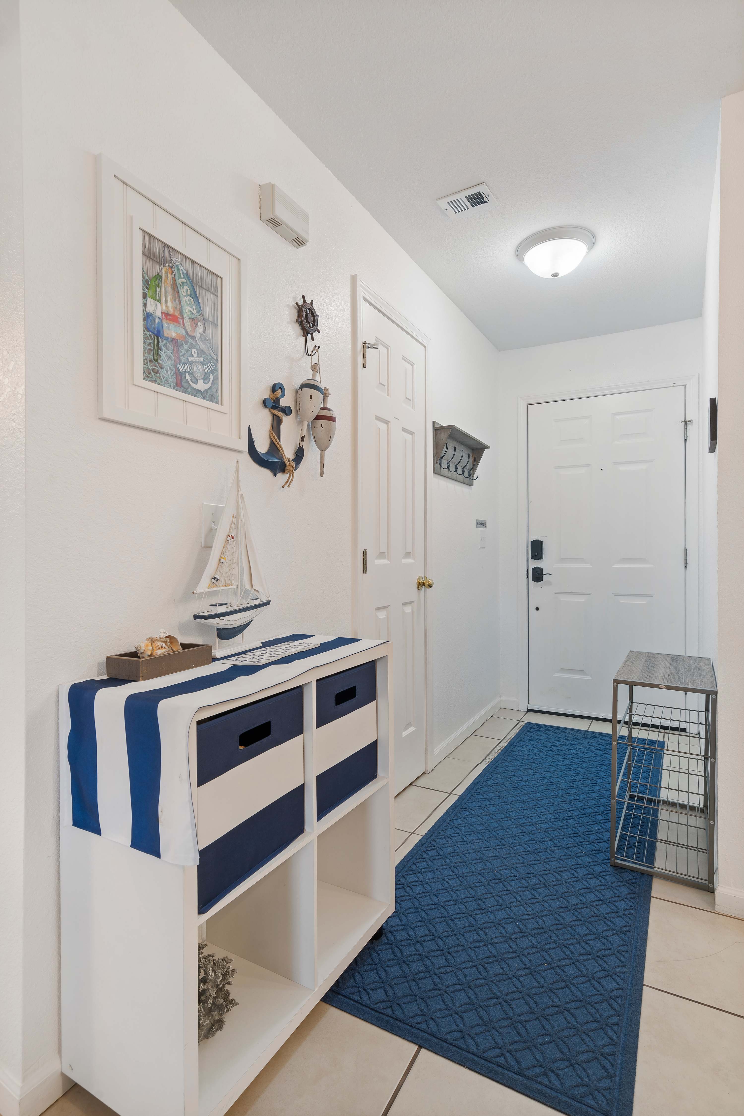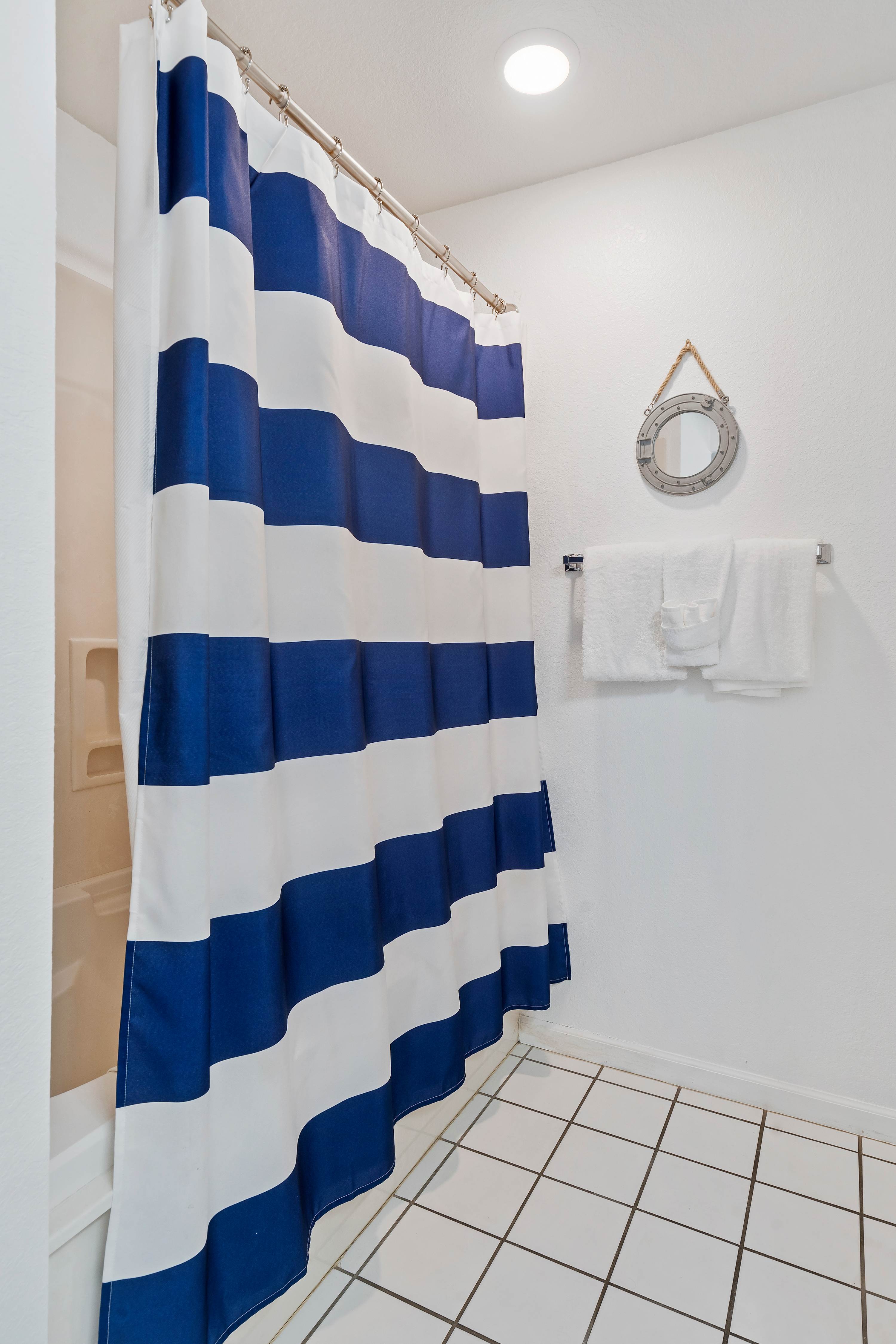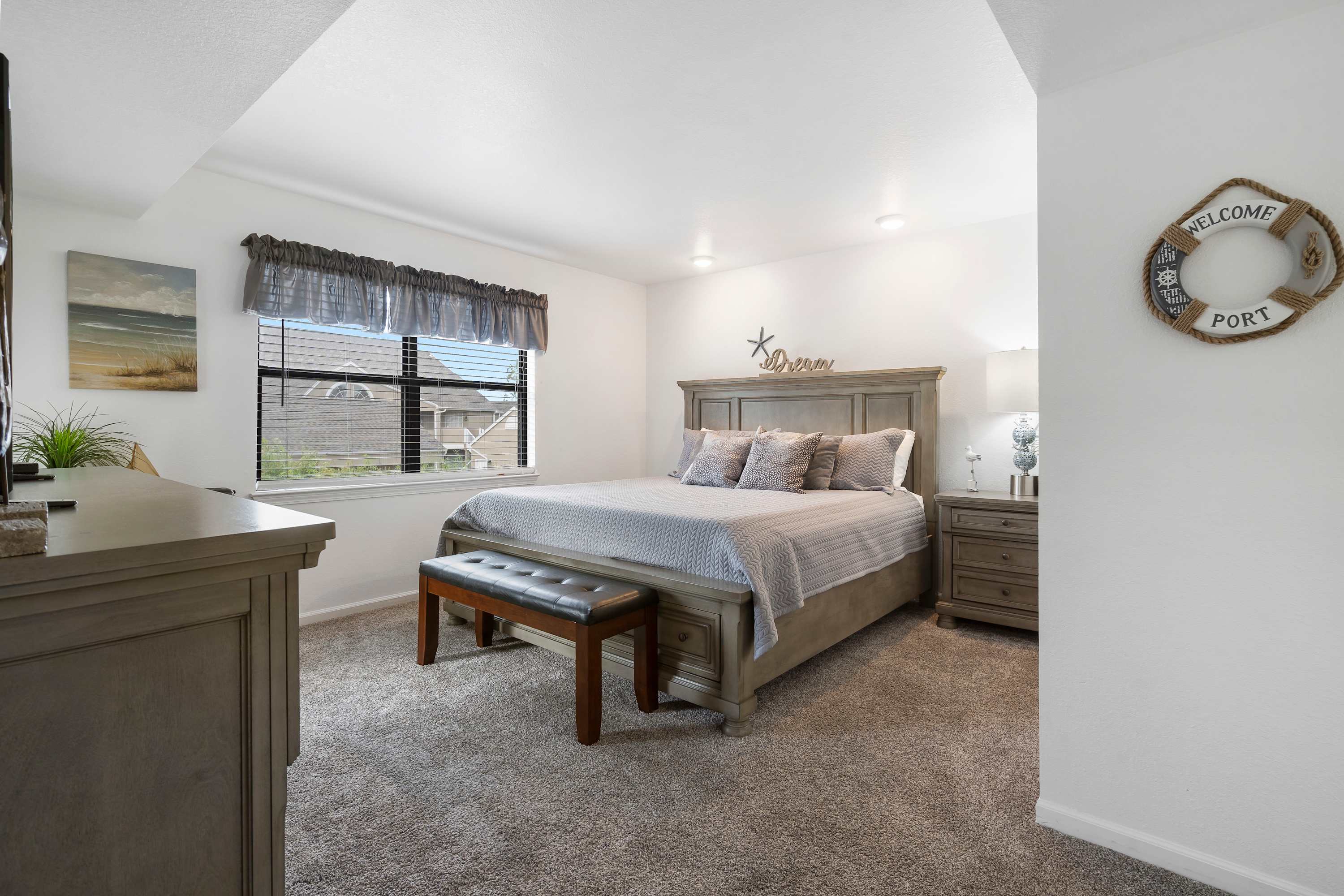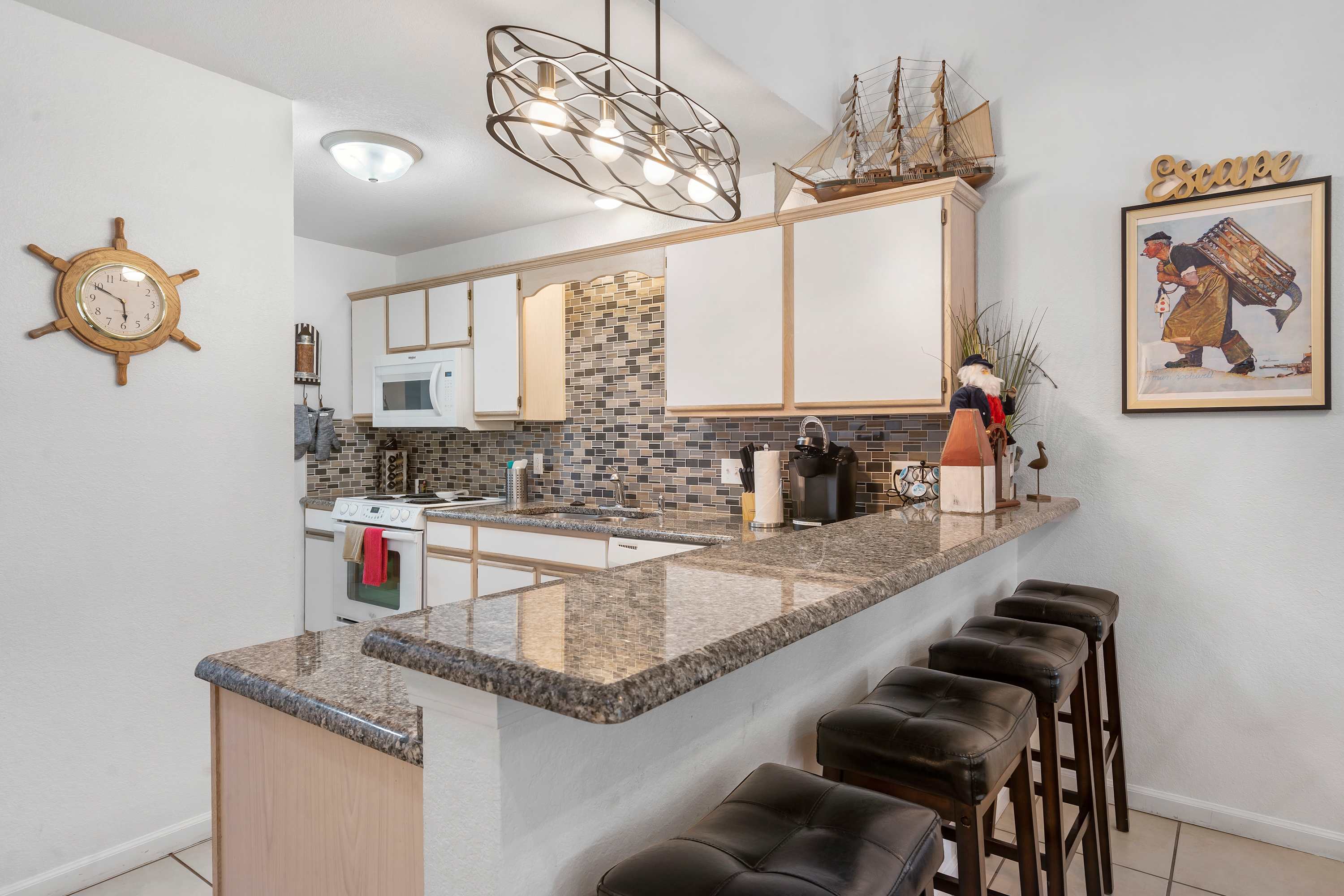 The home’s main living space features high ceilings and comfortable seating around the fireplace and tv. Follow the natural flow of this nautical home into the fully-equipped kitchen where you have all the appliances and tools you need to prepare anything from snacks to full meals. Casual dining and morning coffee can be shared at the breakfast bar with barstool seating, more formal meals can flow to the indoor eating area which seats 6, or head out to the balcony for a meal al fresco.