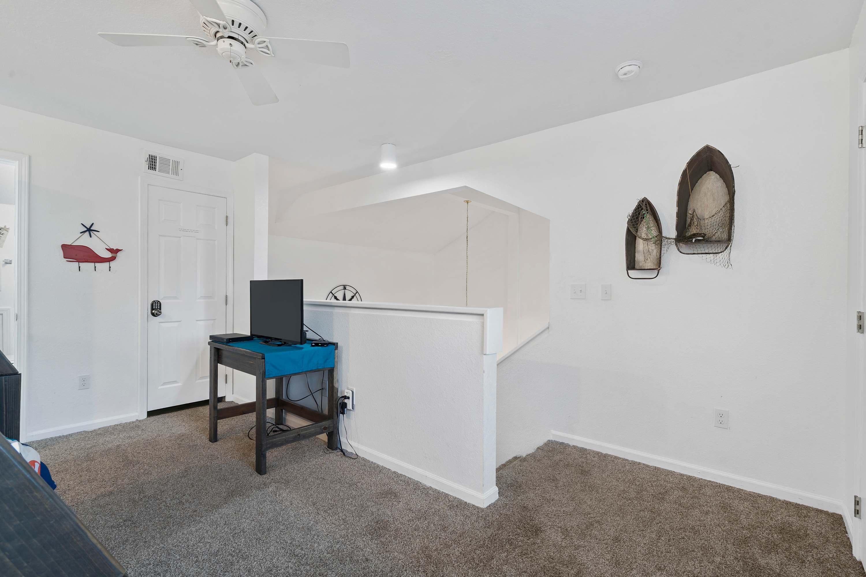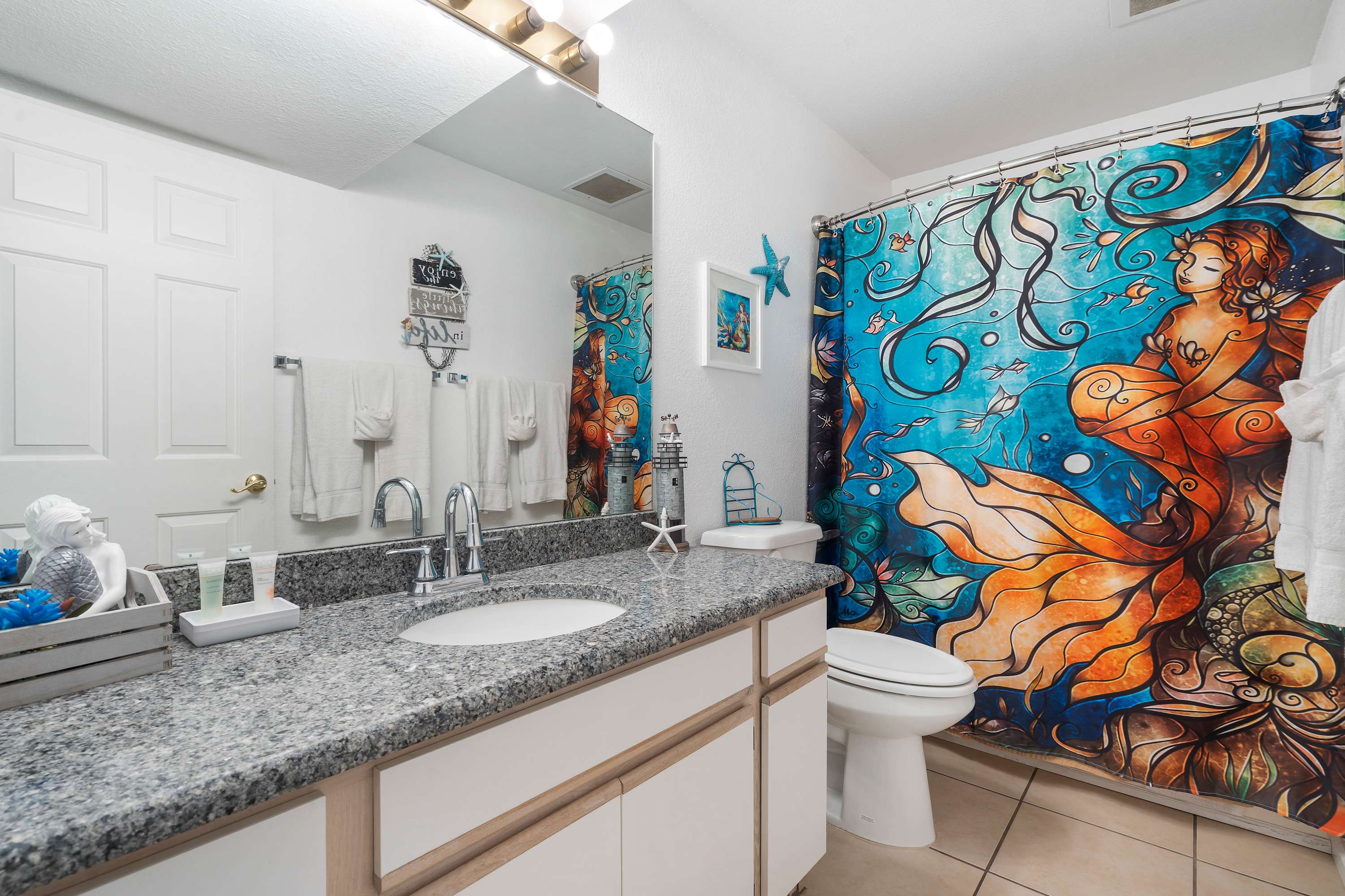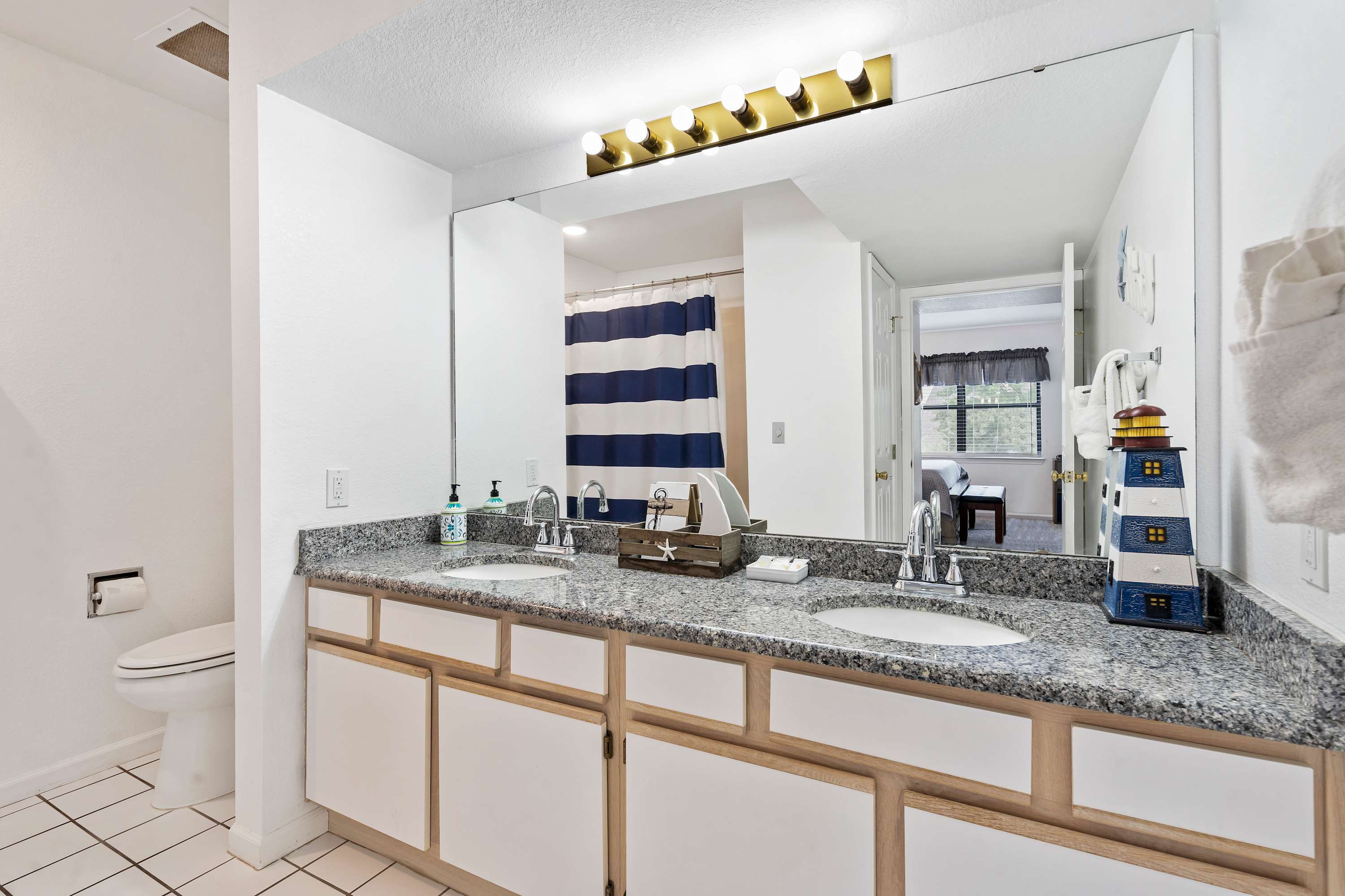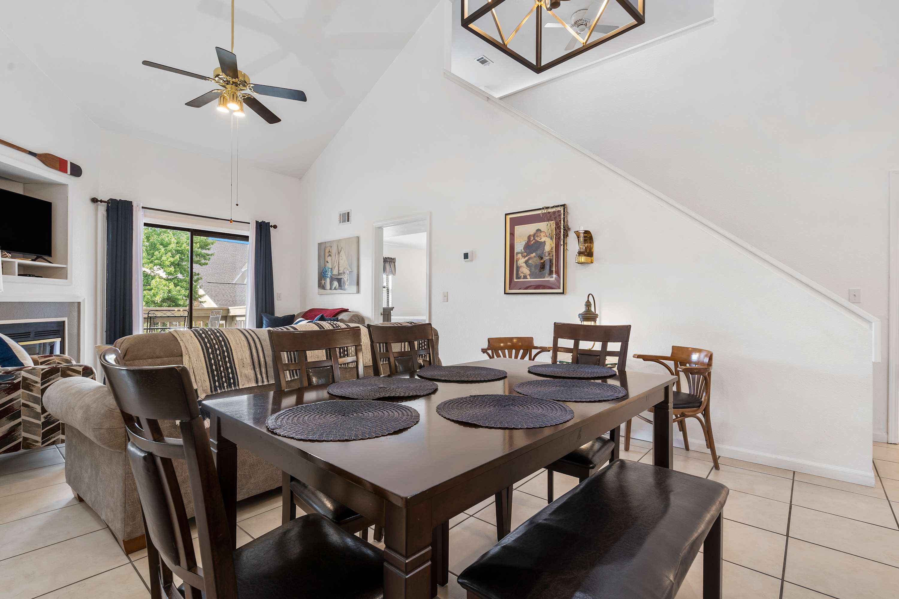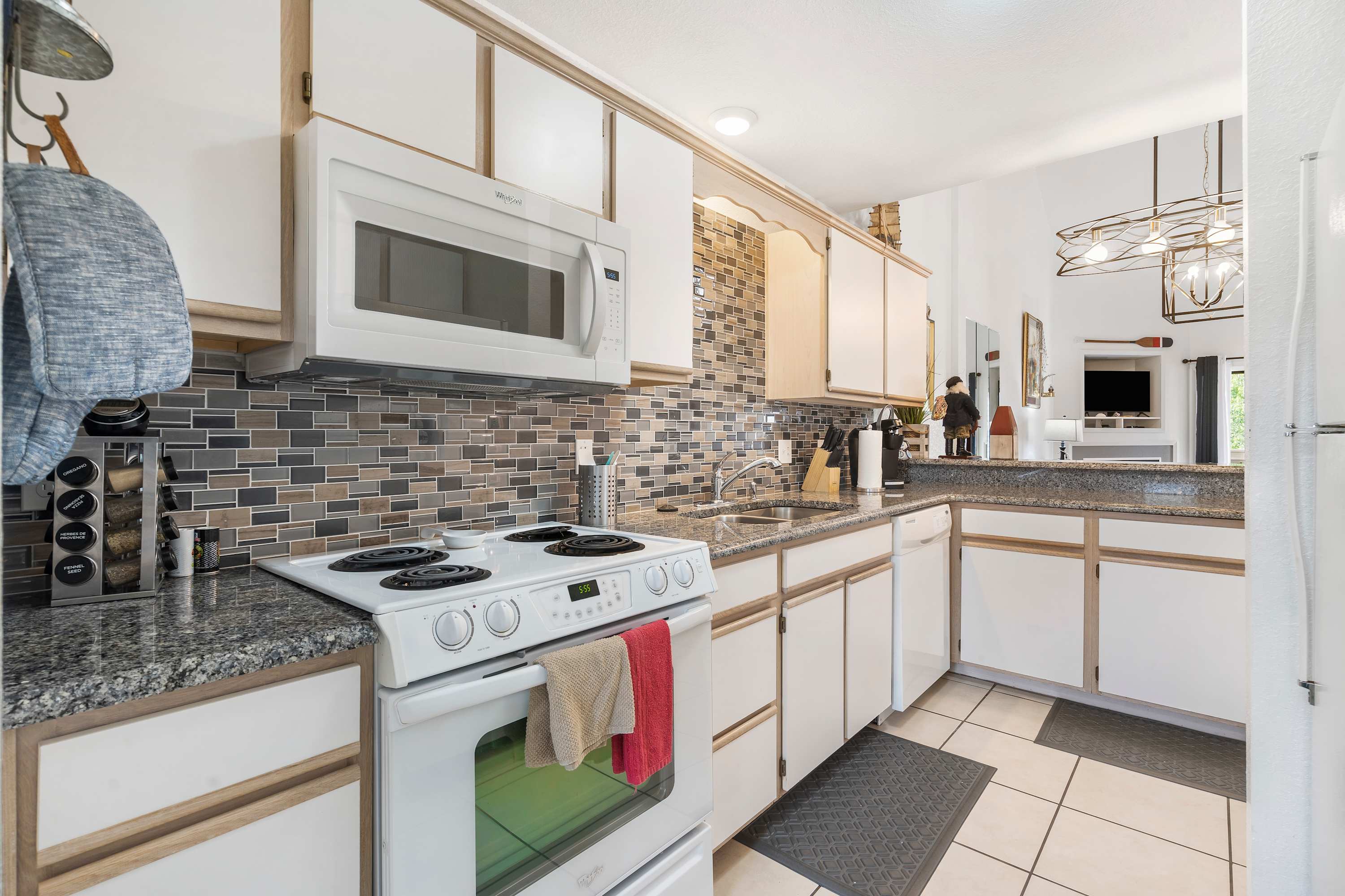 The home’s main living space features high ceilings and comfortable seating around the fireplace and tv. Follow the natural flow of this nautical home into the fully-equipped kitchen where you have all the appliances and tools you need to prepare anything from snacks to full meals. Casual dining and morning coffee can be shared at the breakfast bar with barstool seating, more formal meals can flow to the indoor eating area which seats 6, or head out to the balcony for a meal al fresco.