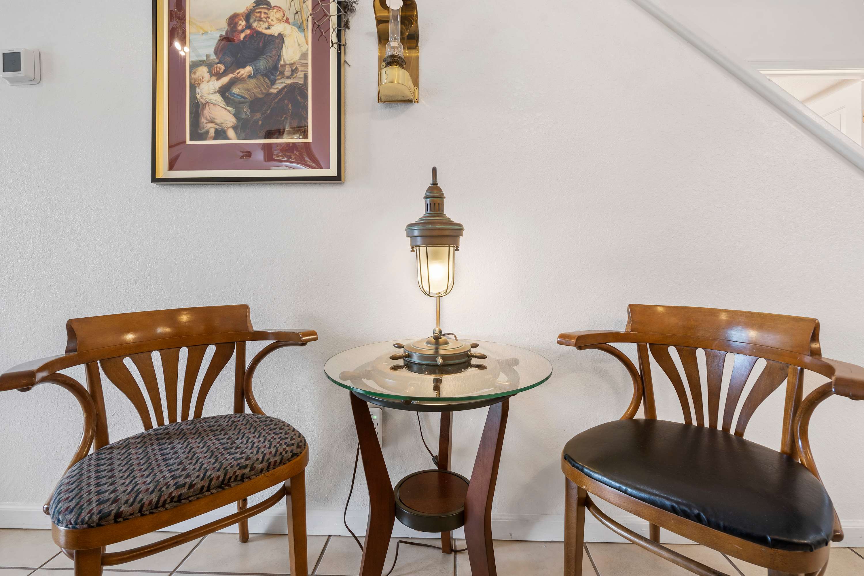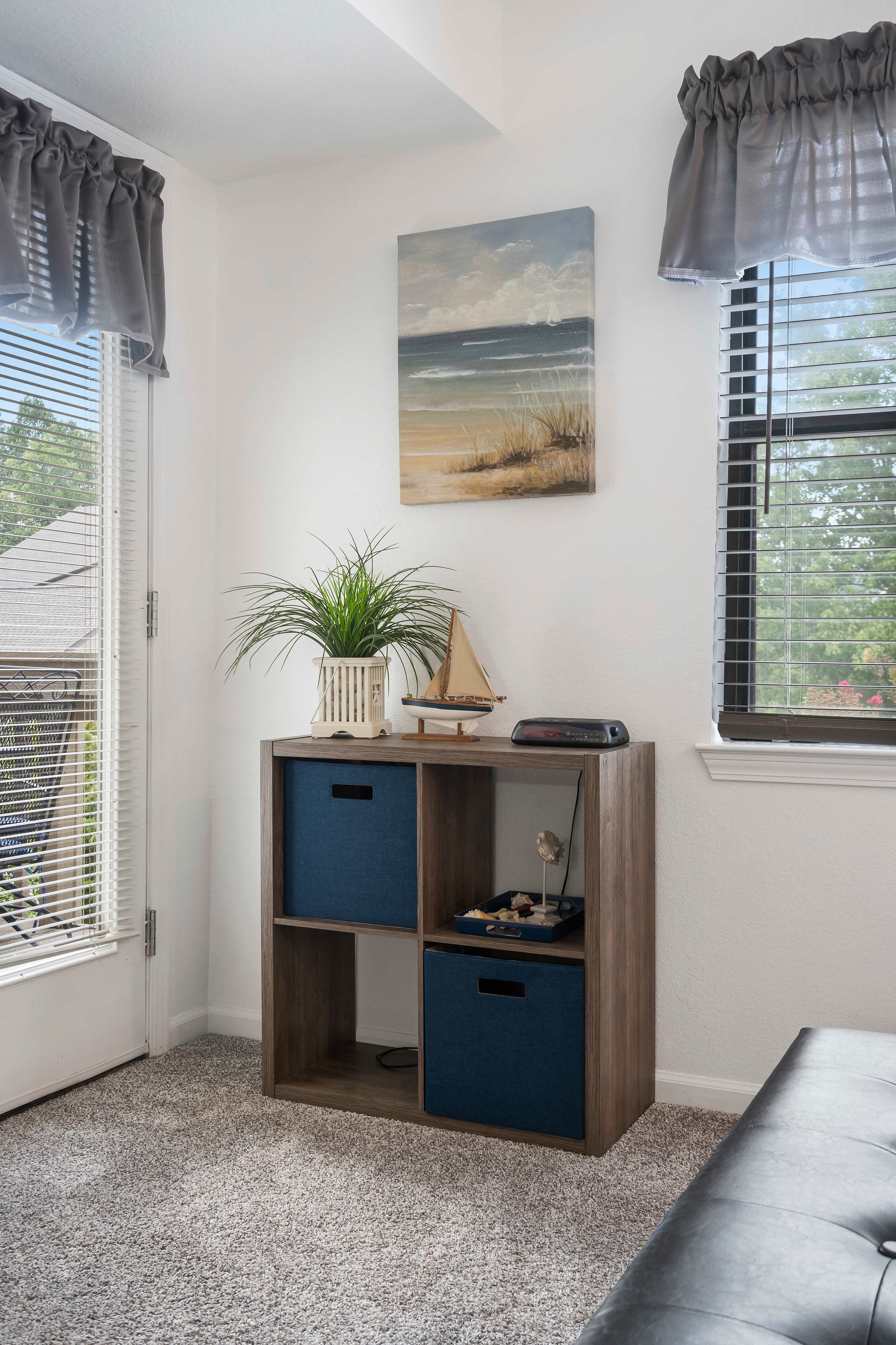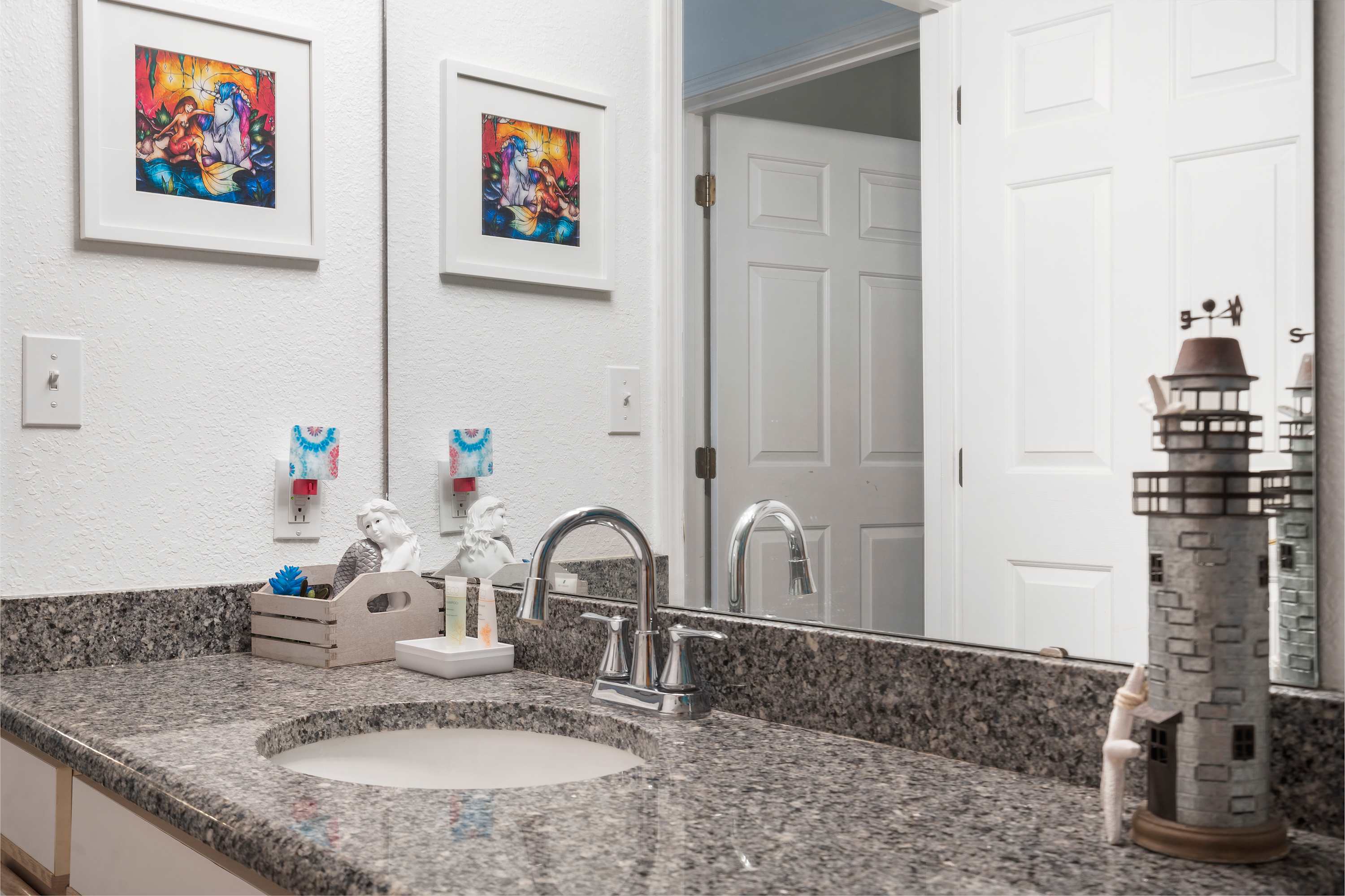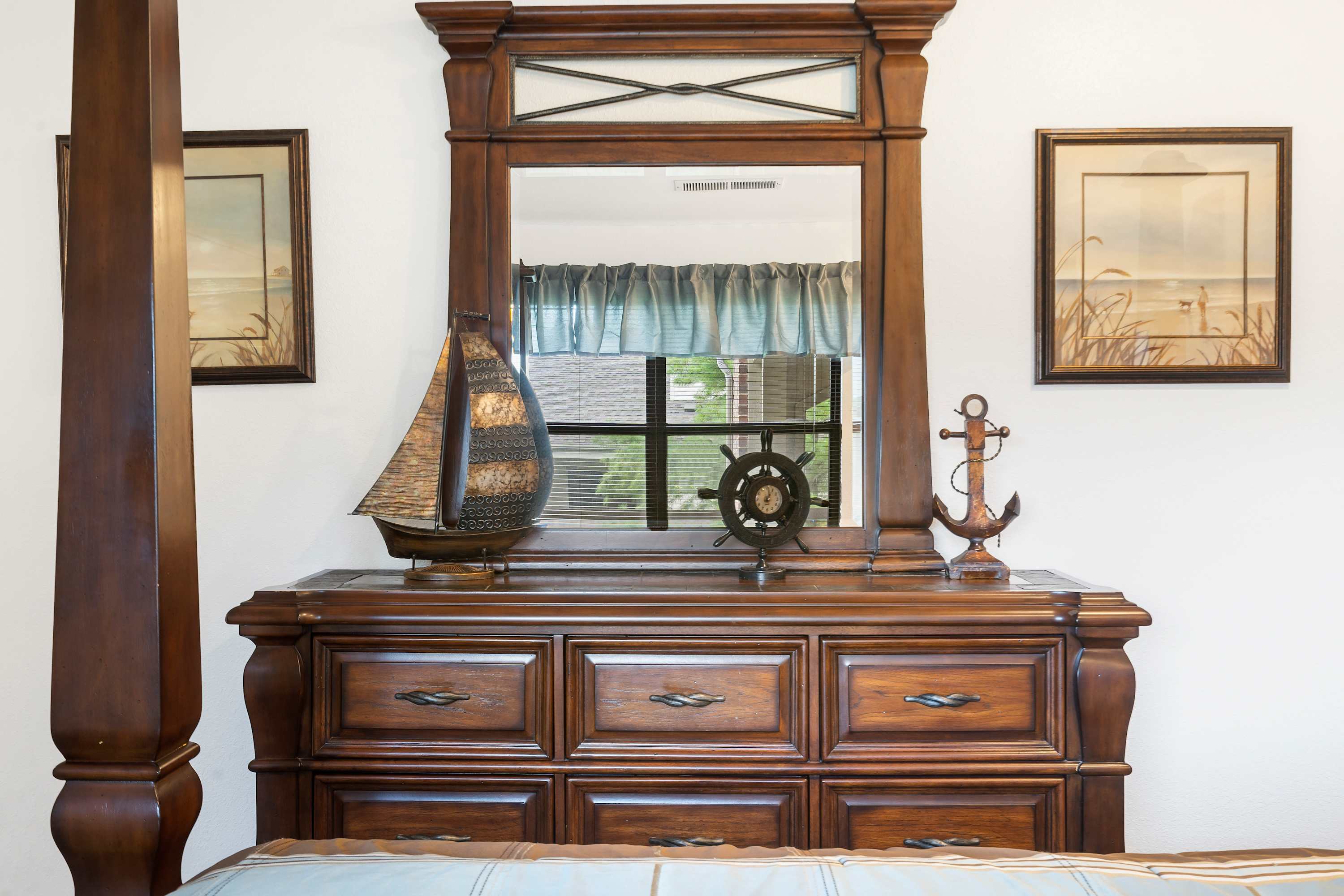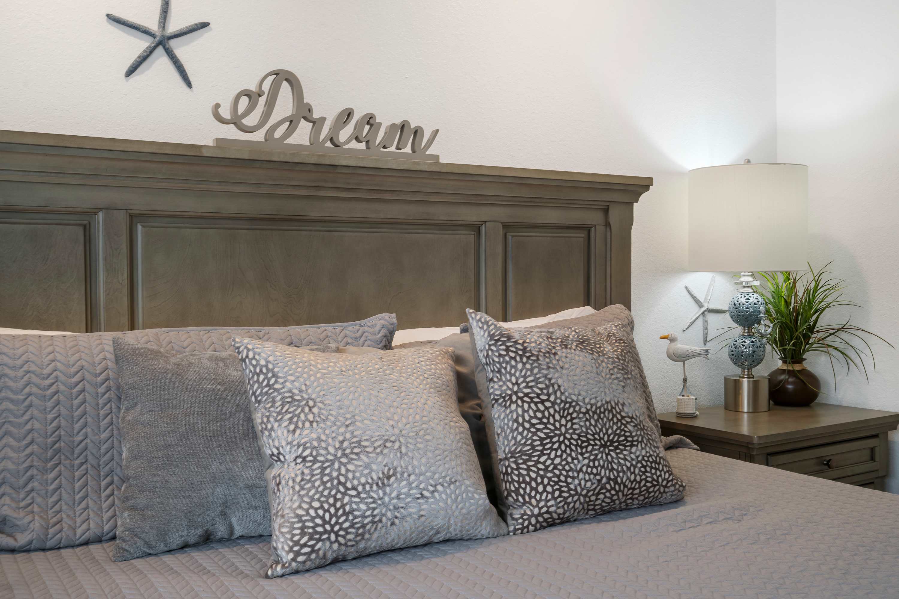 The home’s main living space features high ceilings and comfortable seating around the fireplace and tv. Follow the natural flow of this nautical home into the fully-equipped kitchen where you have all the appliances and tools you need to prepare anything from snacks to full meals. Casual dining and morning coffee can be shared at the breakfast bar with barstool seating, more formal meals can flow to the indoor eating area which seats 6, or head out to the balcony for a meal al fresco.